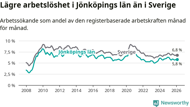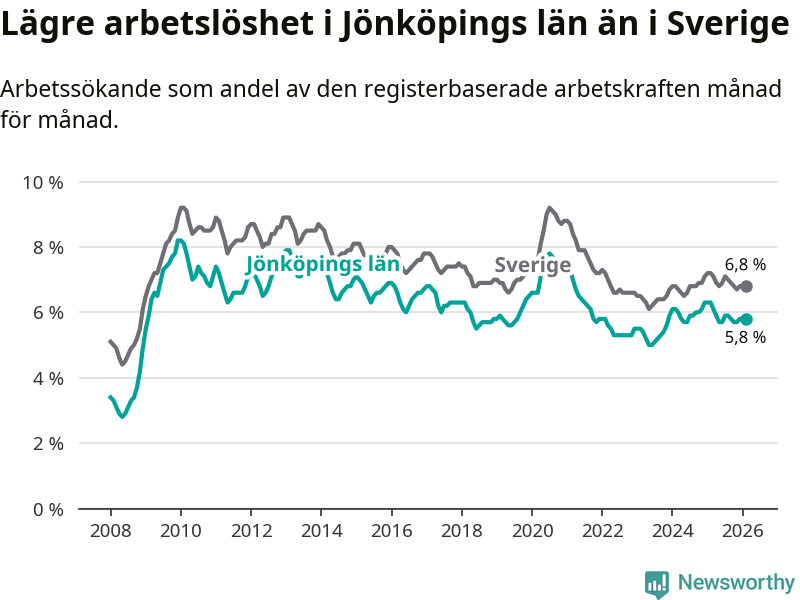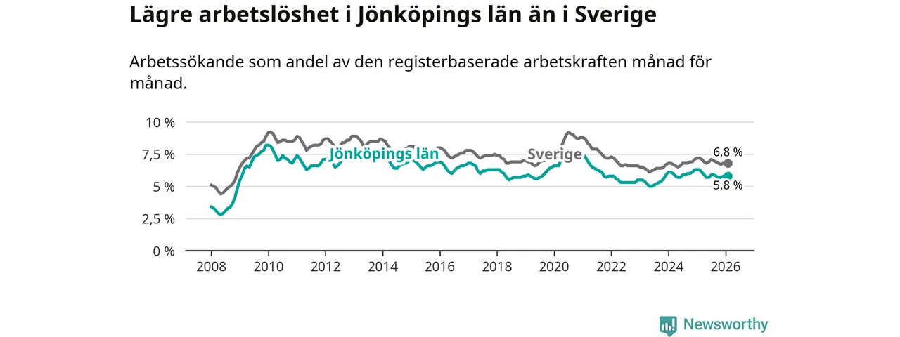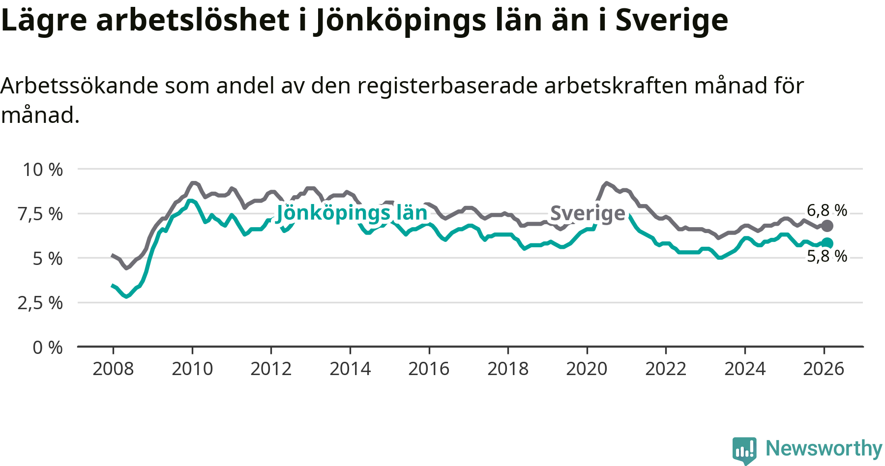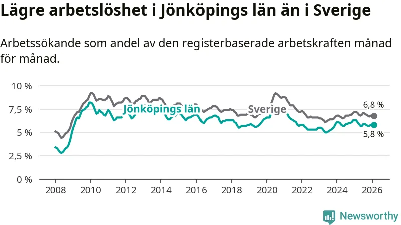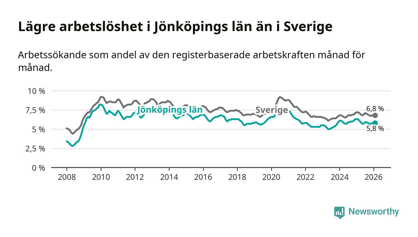 Under februari månad rapporterade Jönköpings län en total arbetslöshet på 5,8 procent. Det är en minskning jämfört med samma tidpunkt i fjol (−0,5 procentenheter). Även i Sverige sjunker arbetslösheten .