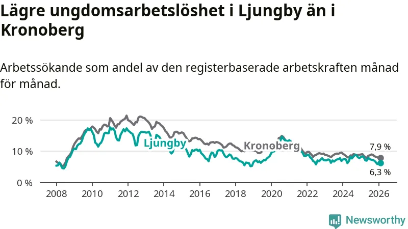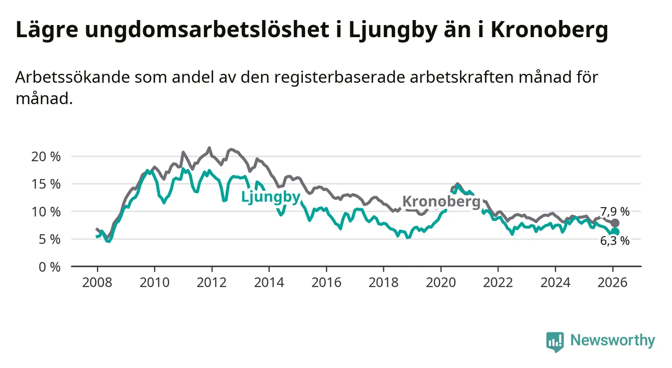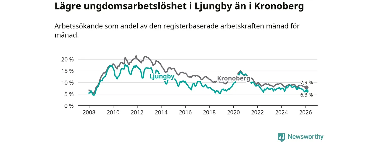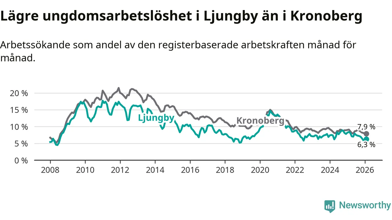 Graf: Arbetslöshet bland unga i Ljungby kommun och Kronobergs län