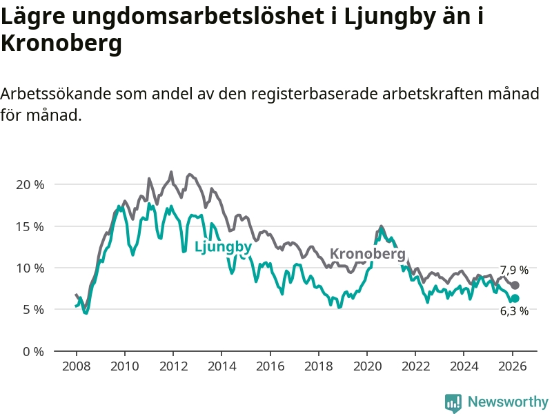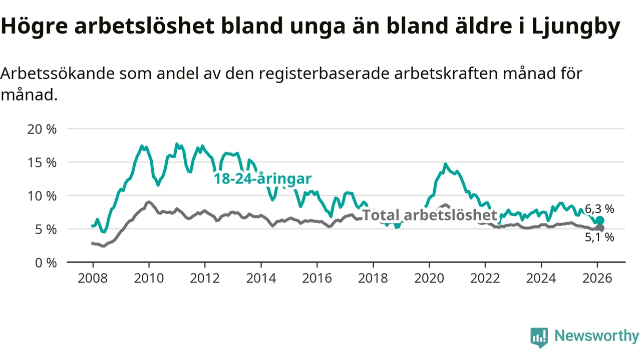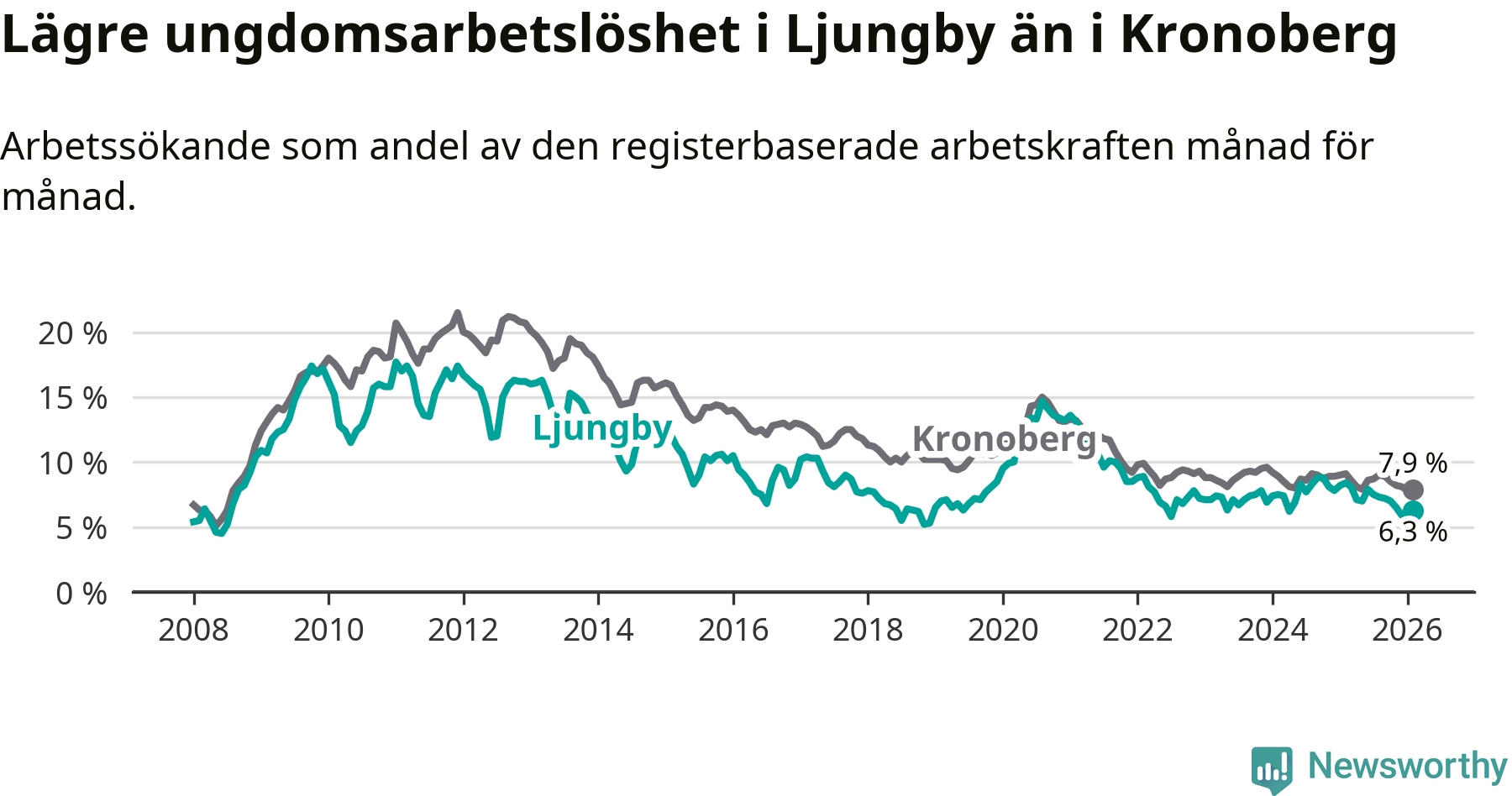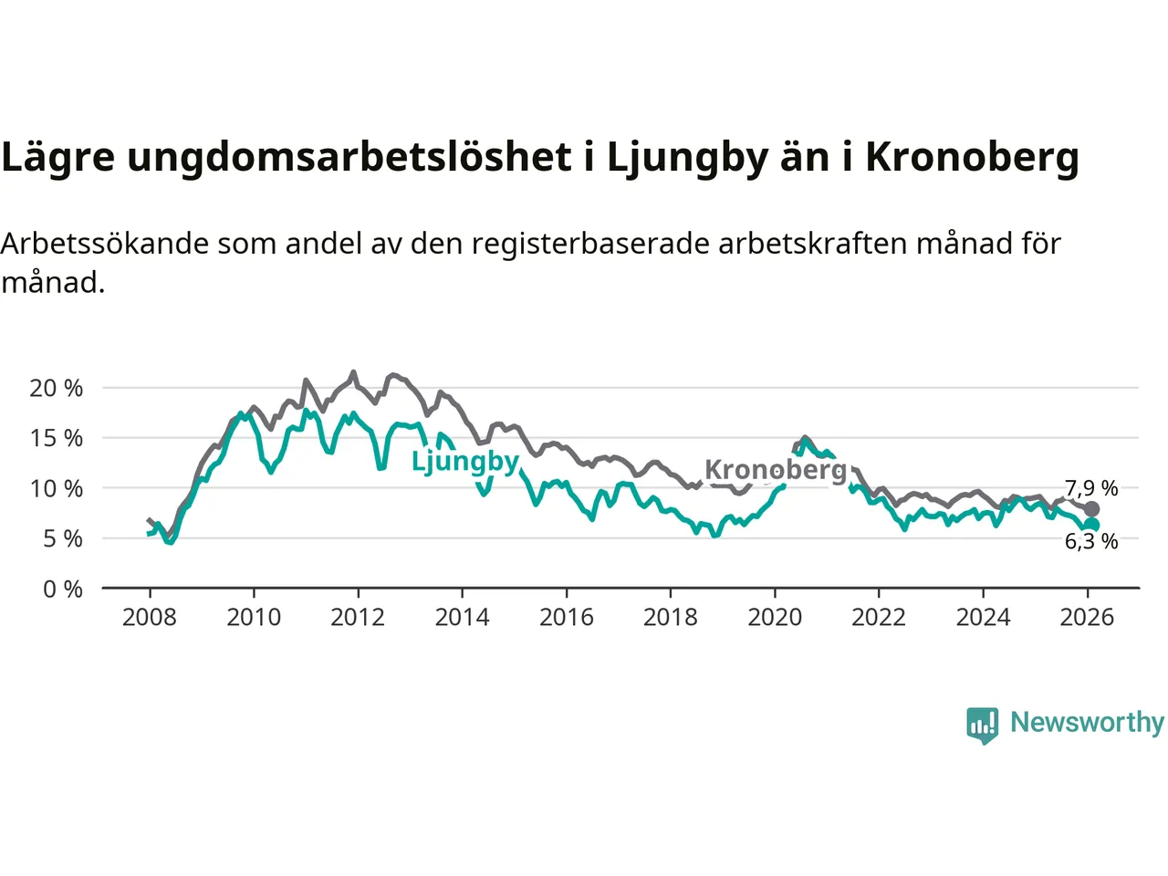 Graf: Arbetslöshet bland unga i Ljungby kommun och Kronobergs län