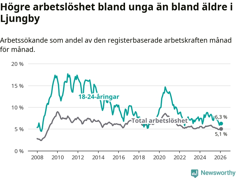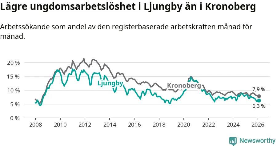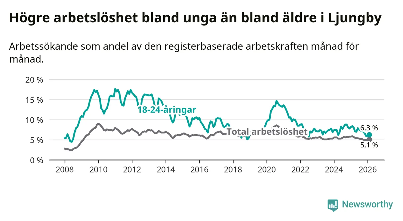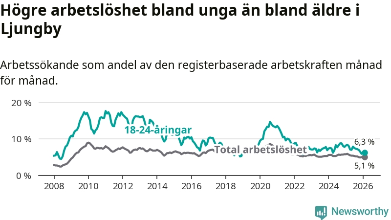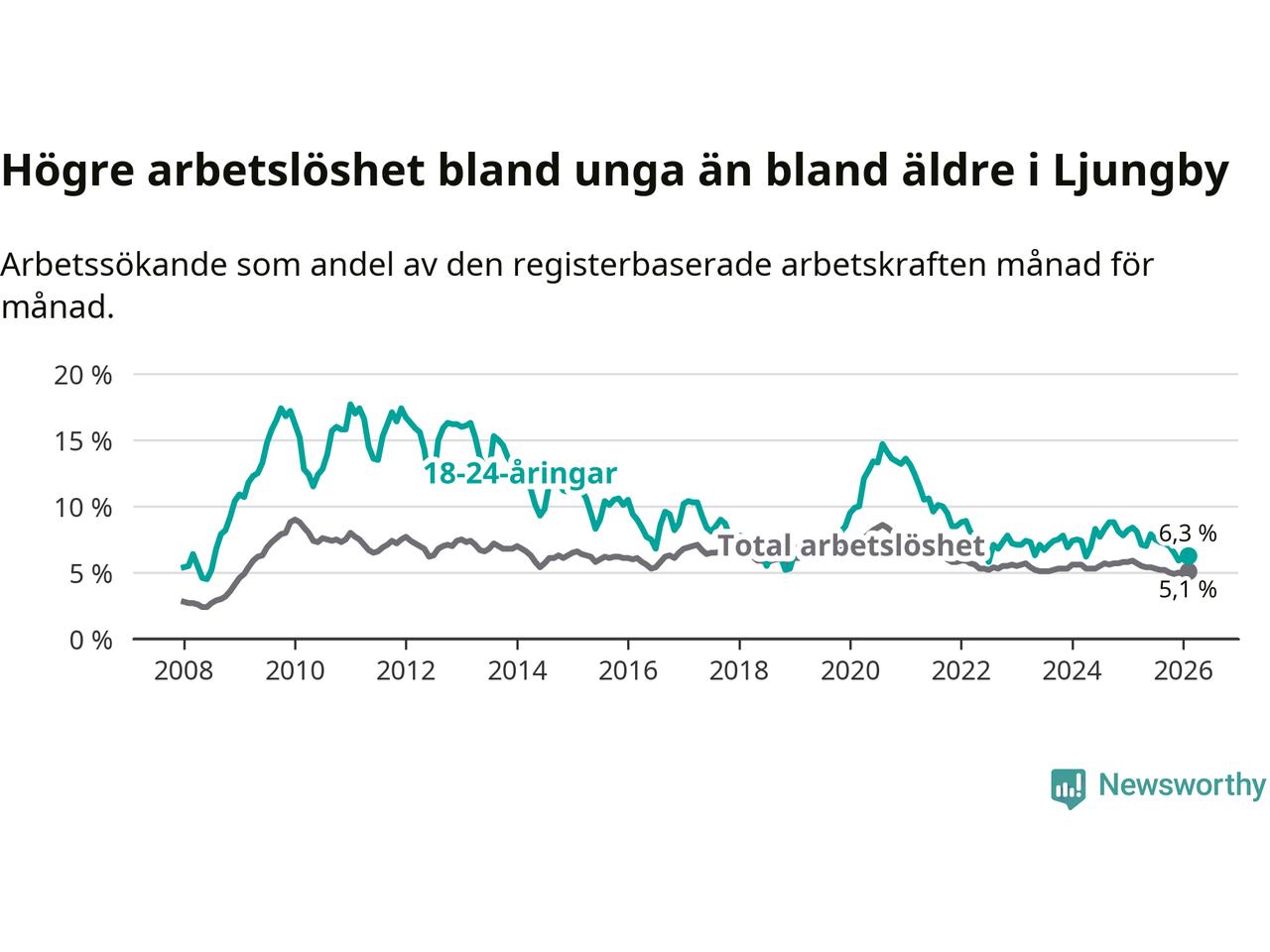 I och med den senaste månadens nedgång har de ungas arbetslöshet i Ljungby sjunkit nio månader i följd (ner från 7,0 procent i maj 2025 till 6,3 procent nu).
