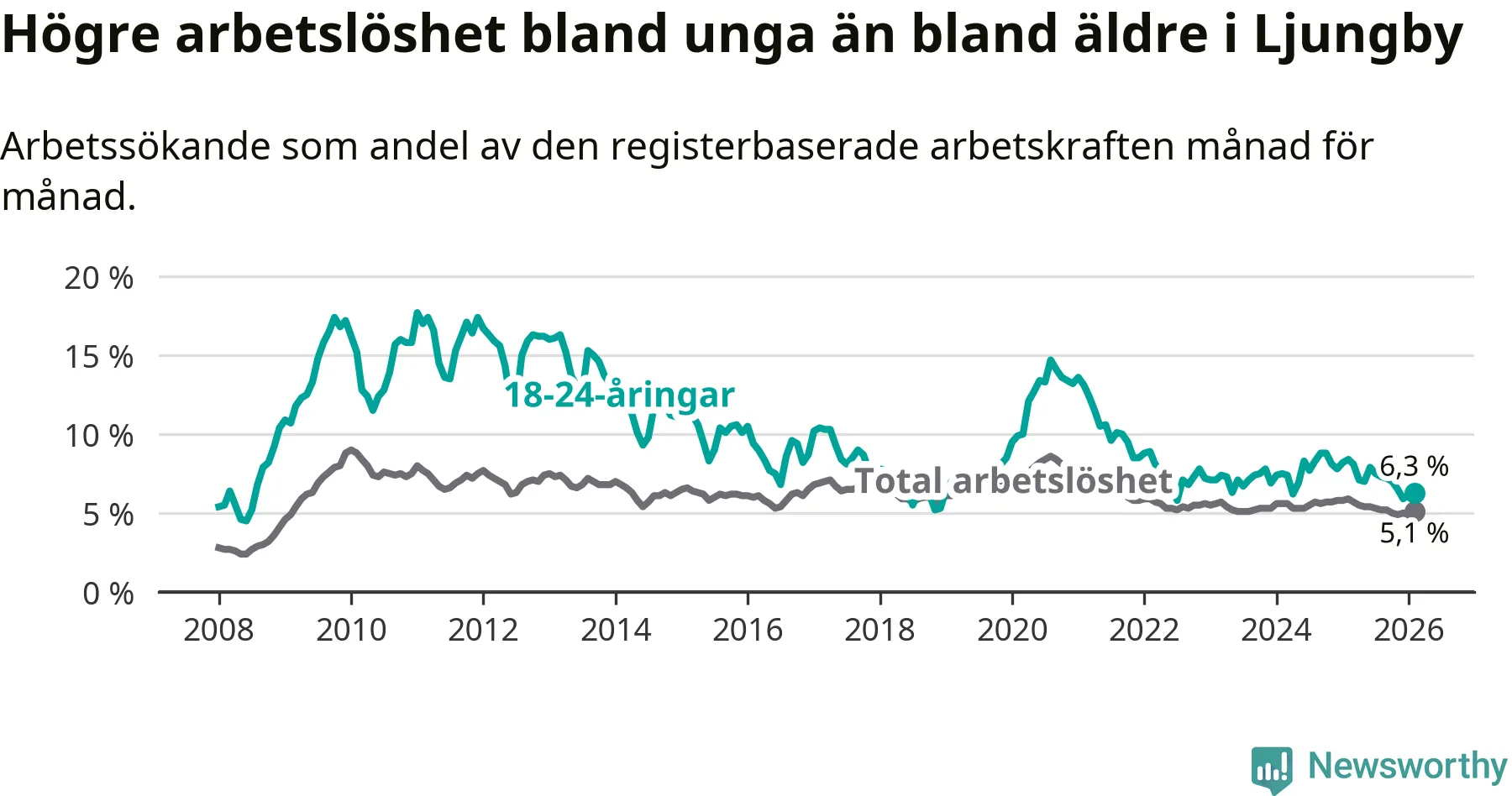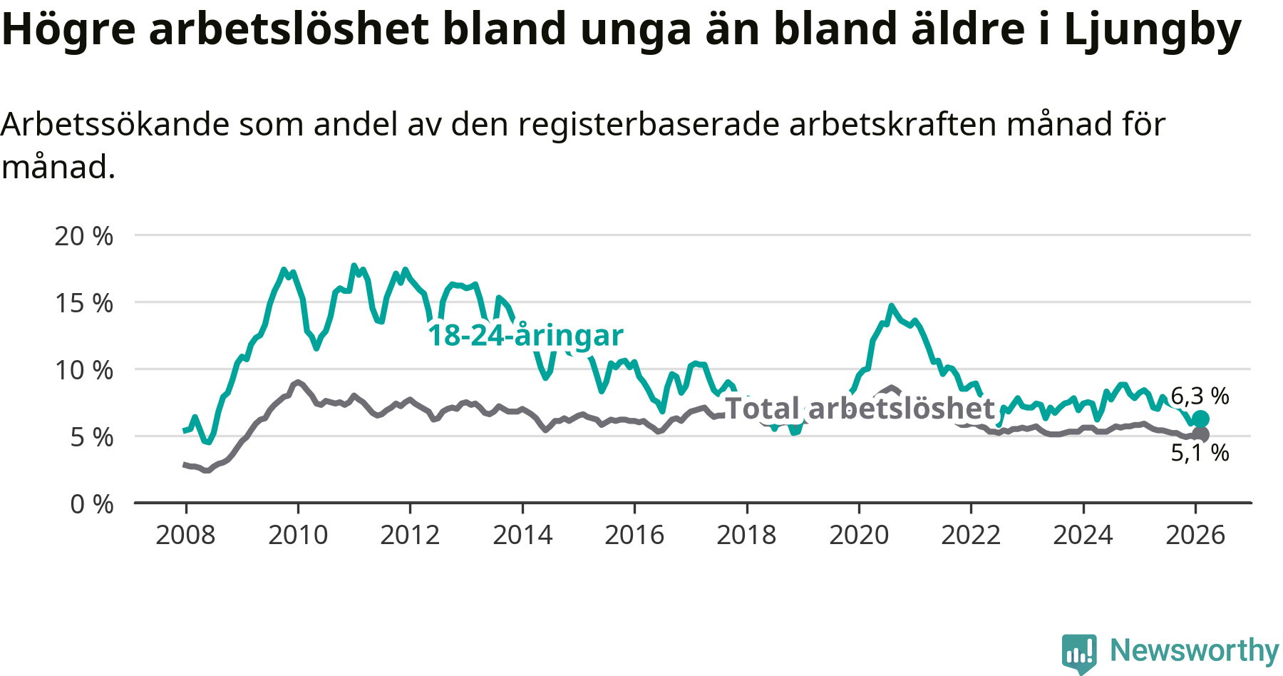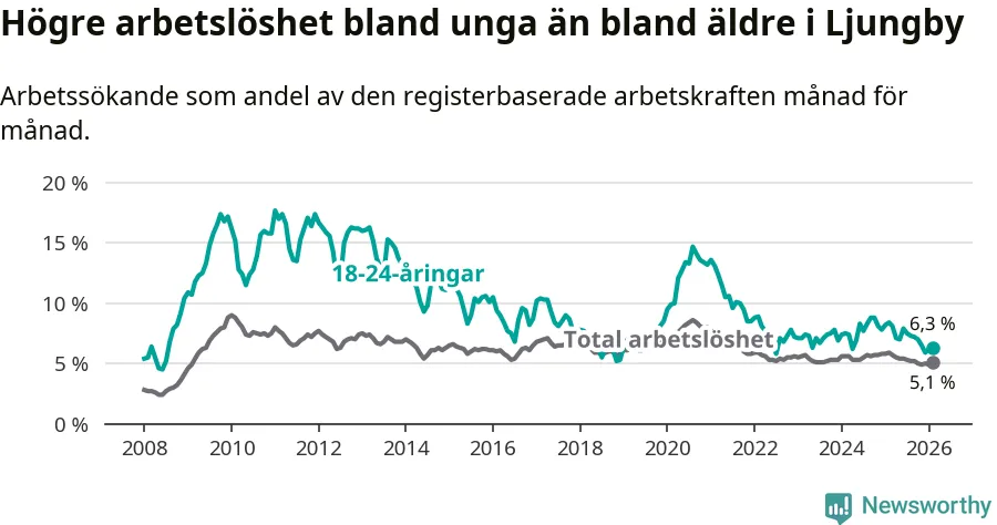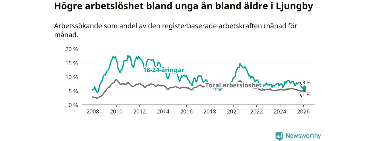 I och med den senaste månadens nedgång har de ungas arbetslöshet i Ljungby sjunkit nio månader i följd (ner från 7,0 procent i maj 2025 till 6,3 procent nu).