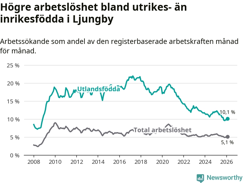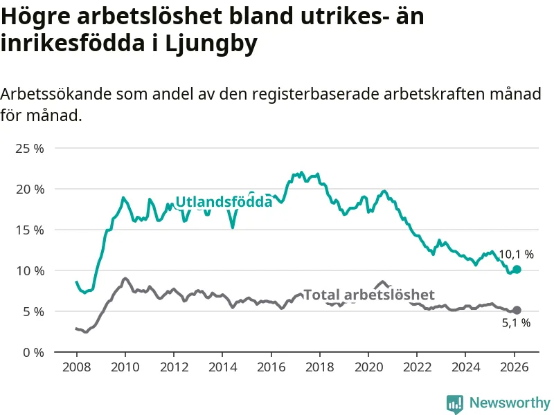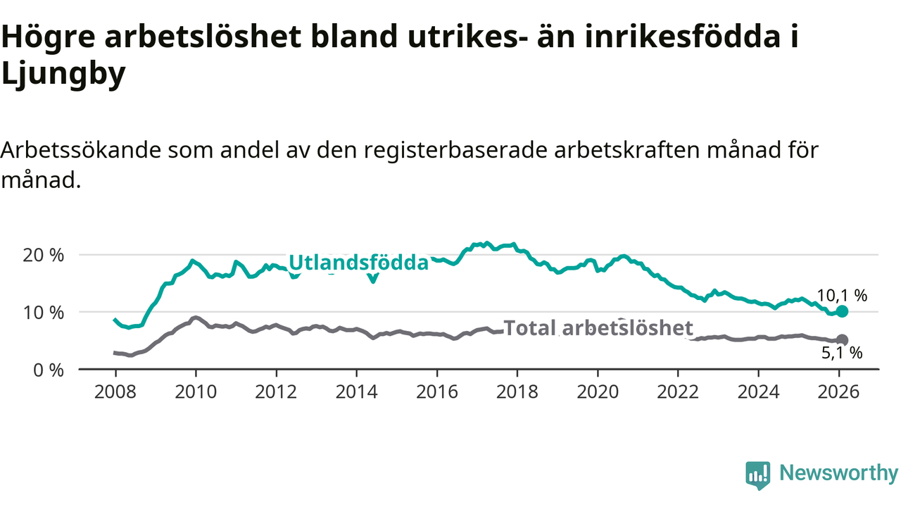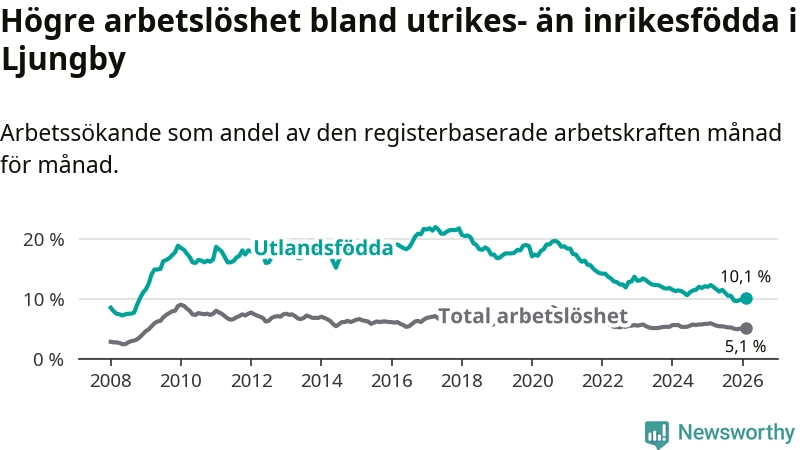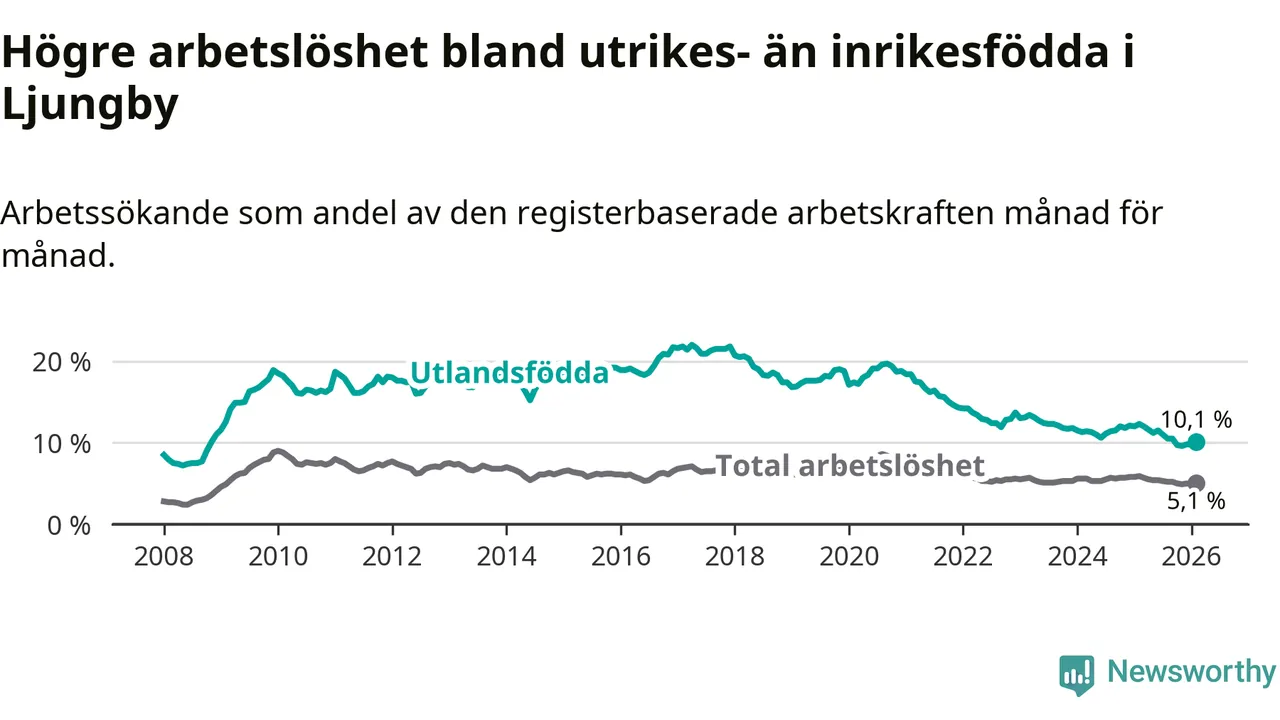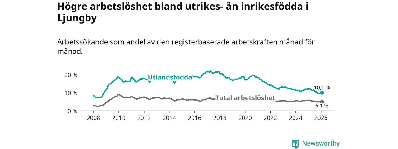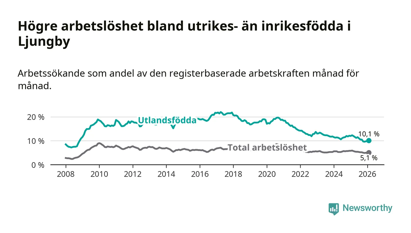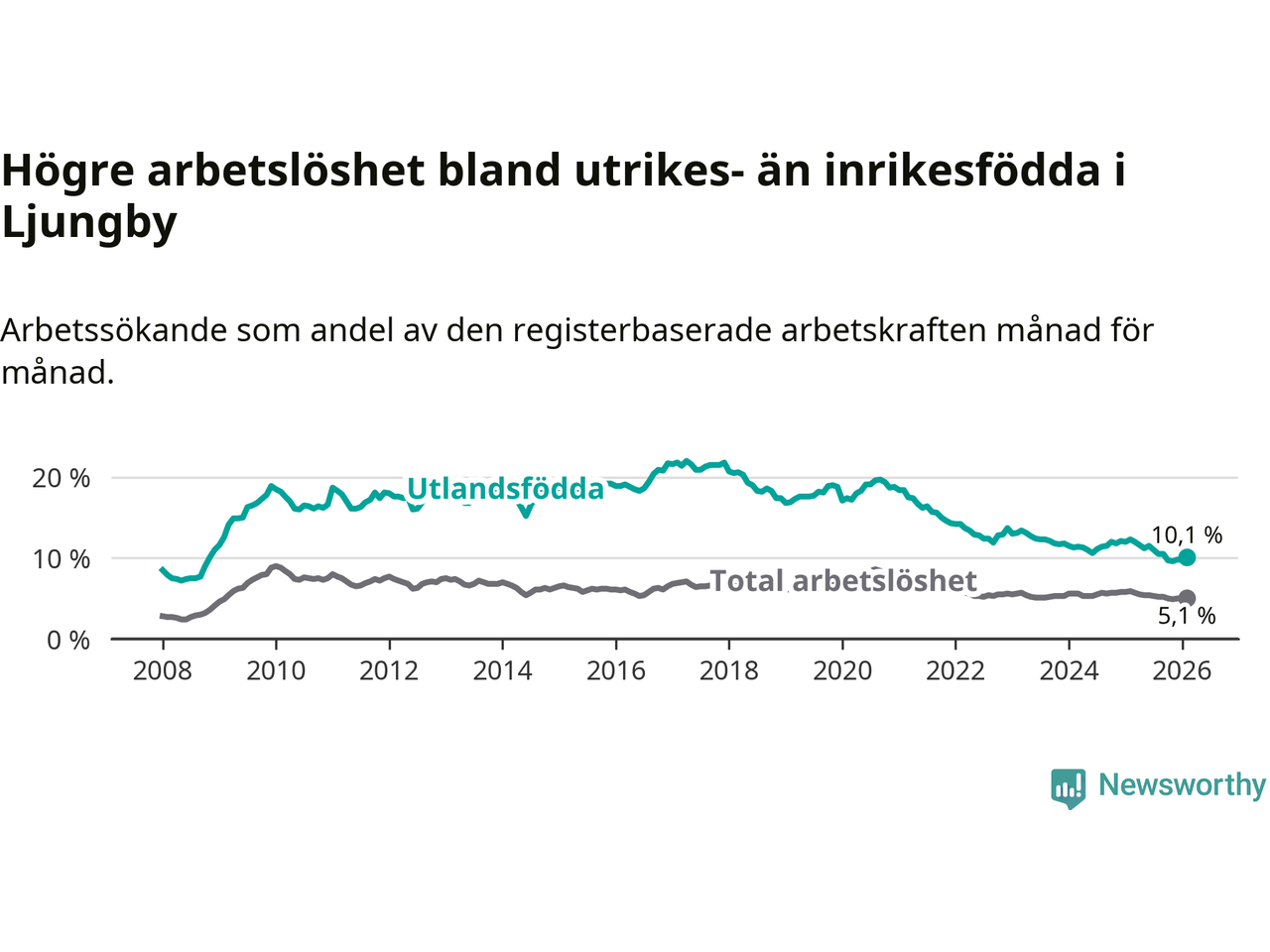 Arbetslösheten bland utlandsfödda var 10,1 procent i Ljungby under februari månad, motsvarande 345 av 3 416 personer. Det är 2,2 procentenheter färre än vid samma tidpunkt i fjol (−70 om man räknar personer). Därmed är de utlandsföddas arbetslöshet lägre än vid samma tidpunkt i fjol för åttonde månaden i följd. Sedan juni 2025 har arbetslösheten bland utlandsfödda minskat från 11,5 till 10,1 procent.
