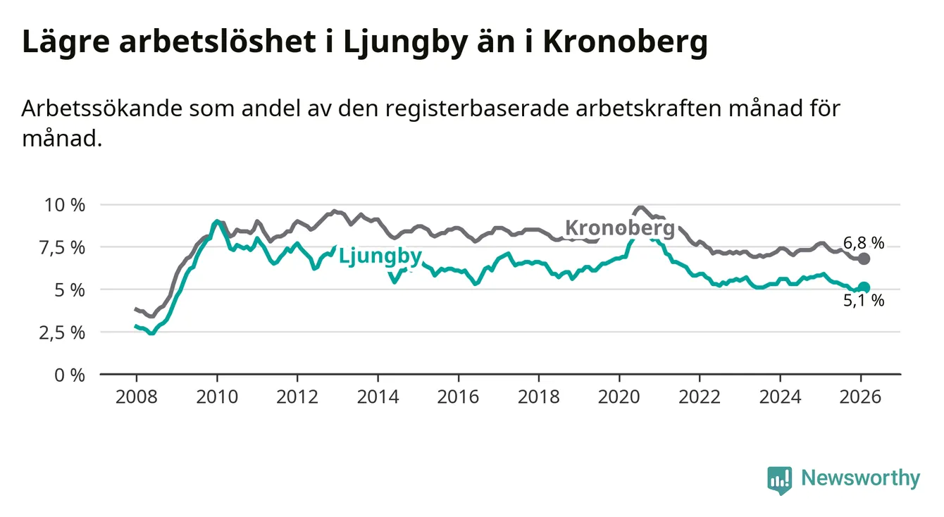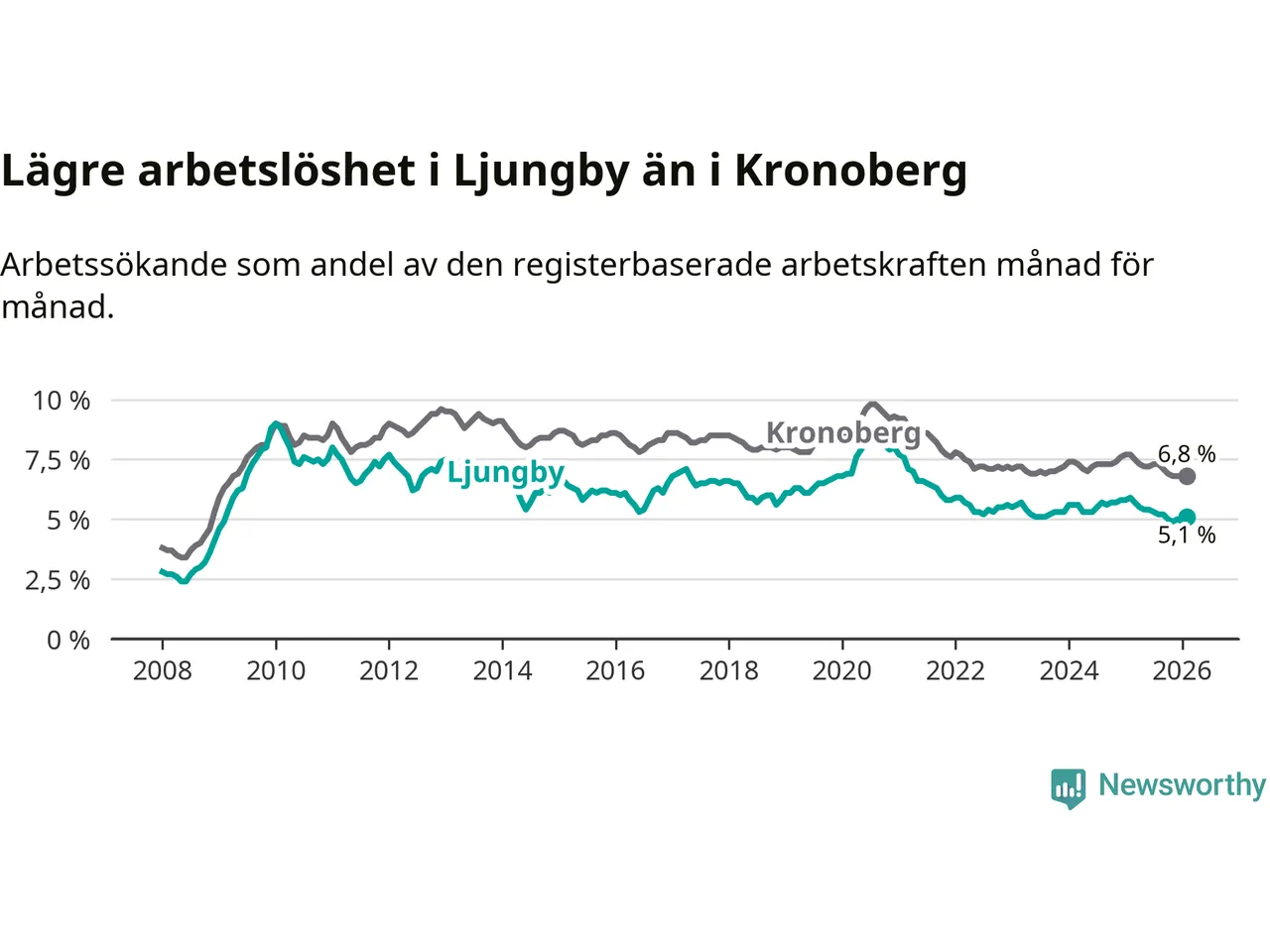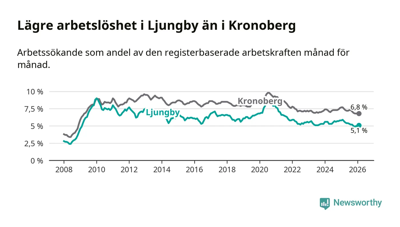 Under februari månad rapporterade Ljungby kommun en total arbetslöshet på 5,1 procent. Det är en minskning jämfört med samma tidpunkt i fjol (−0,8 procentenheter). Även i Kronobergs län sjunker arbetslösheten .
