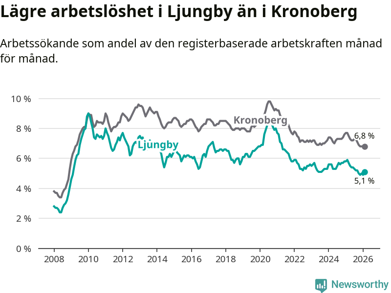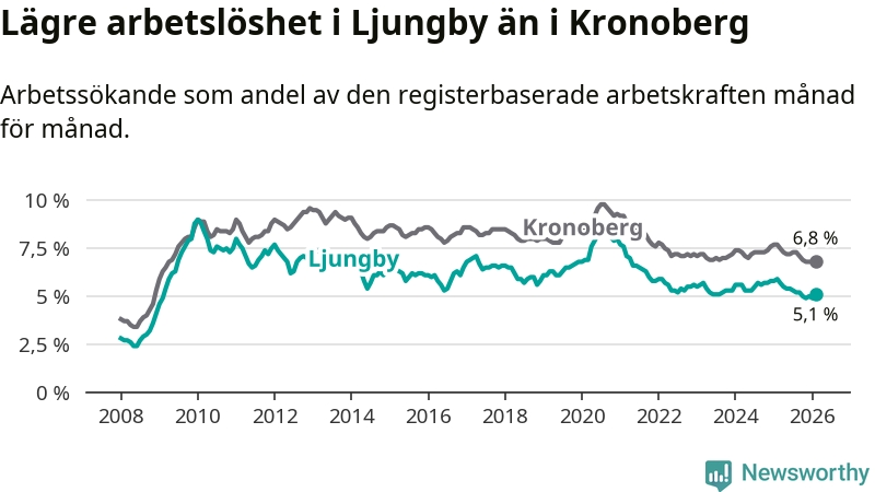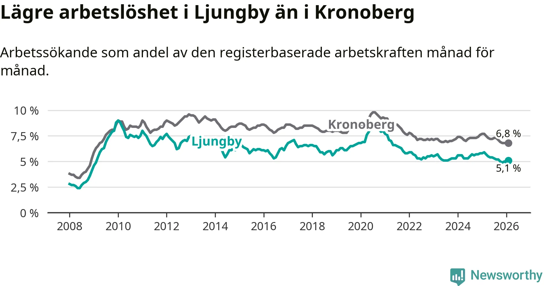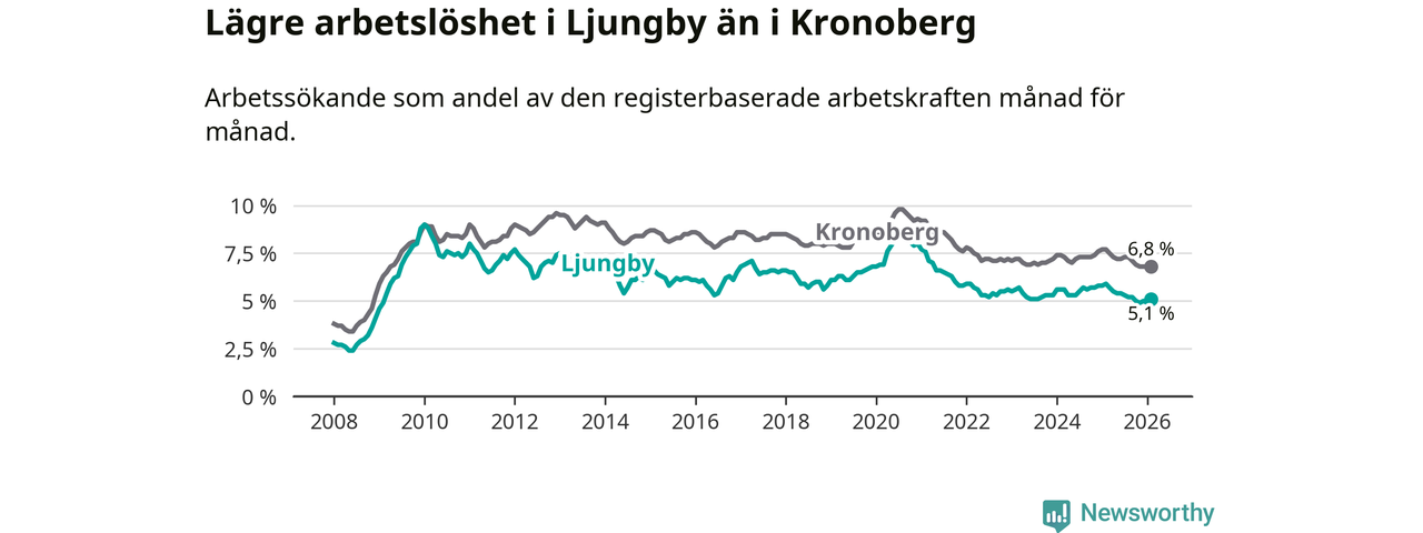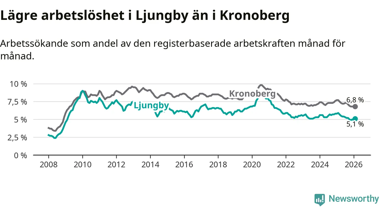 Under februari månad rapporterade Ljungby kommun en total arbetslöshet på 5,1 procent. Det är en minskning jämfört med samma tidpunkt i fjol (−0,8 procentenheter). Även i Kronobergs län sjunker arbetslösheten .