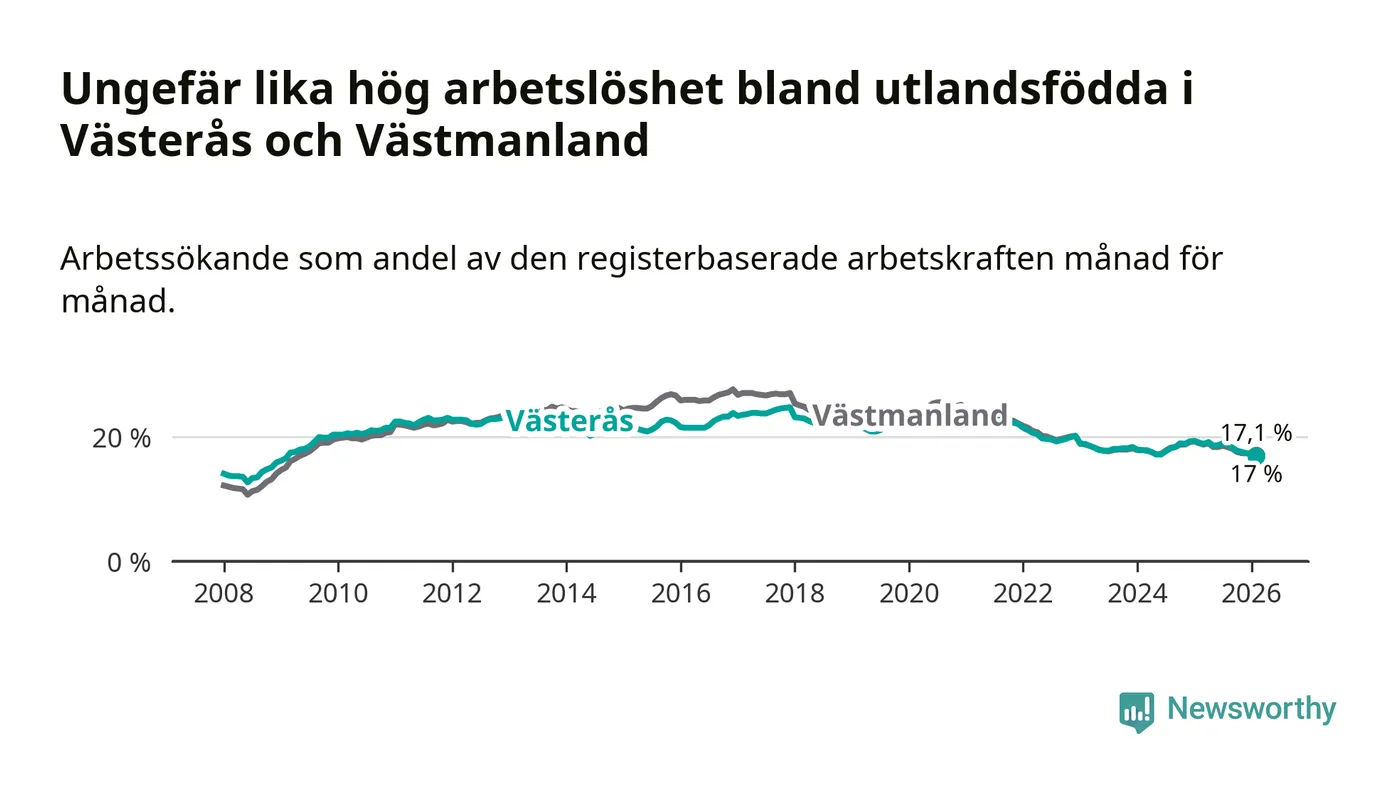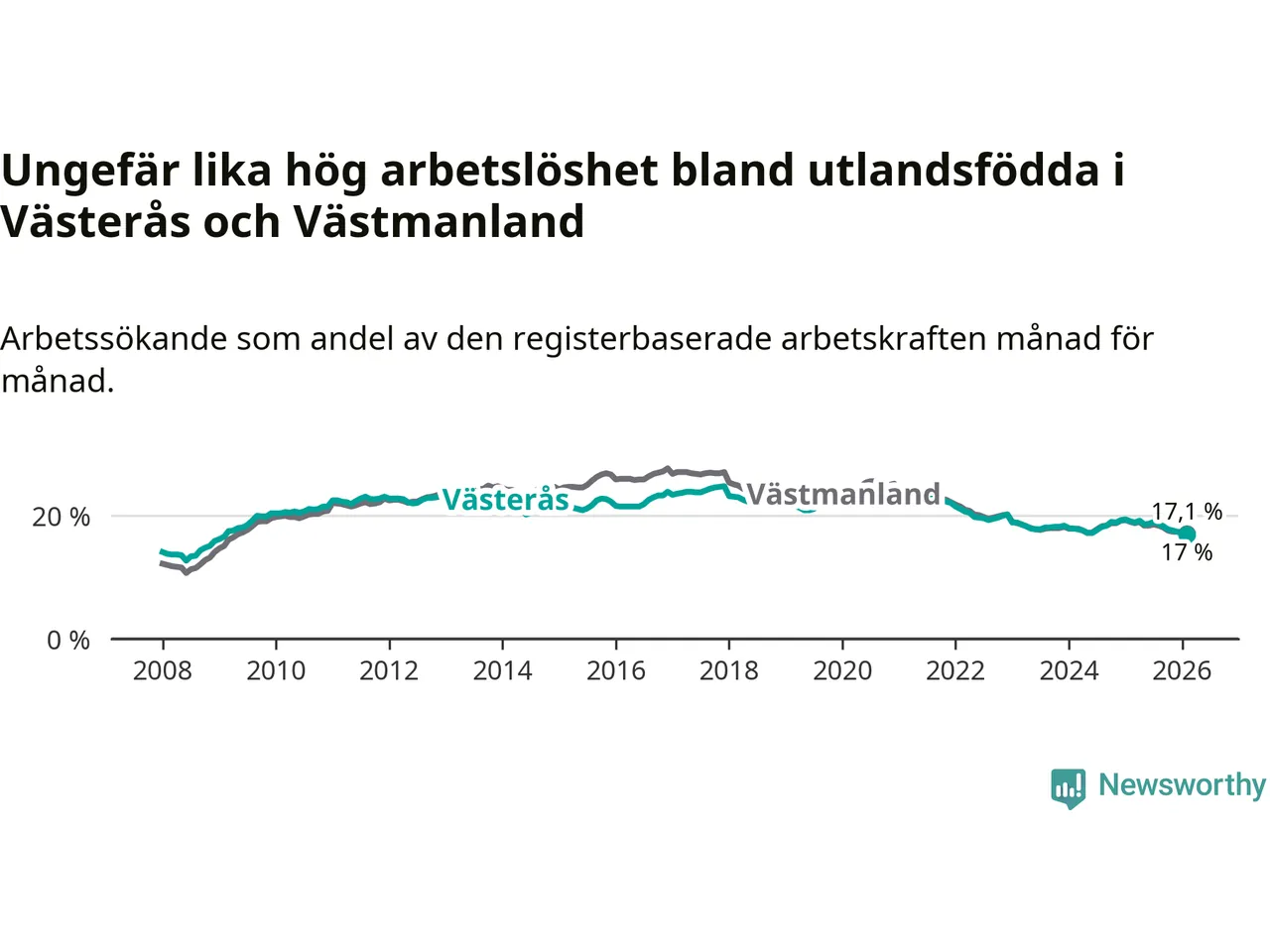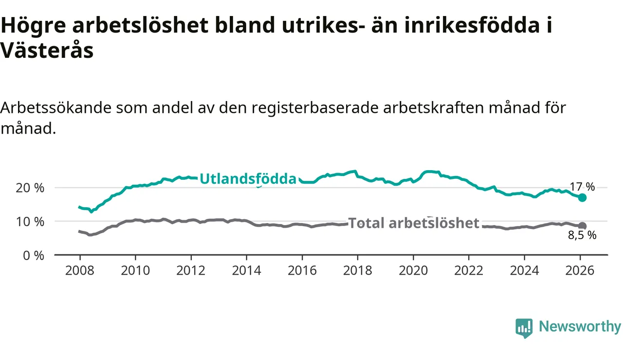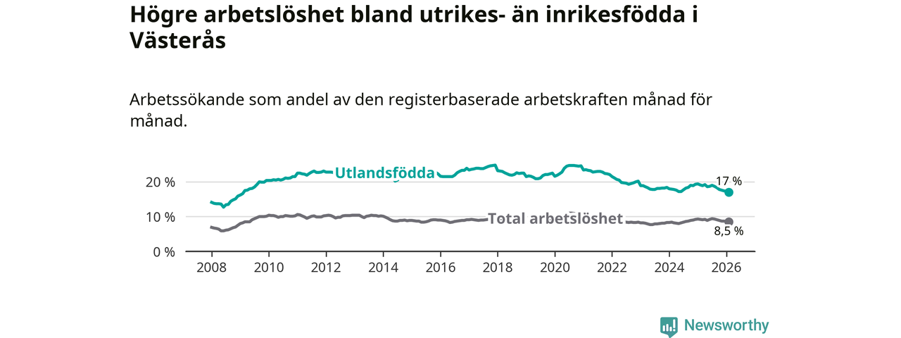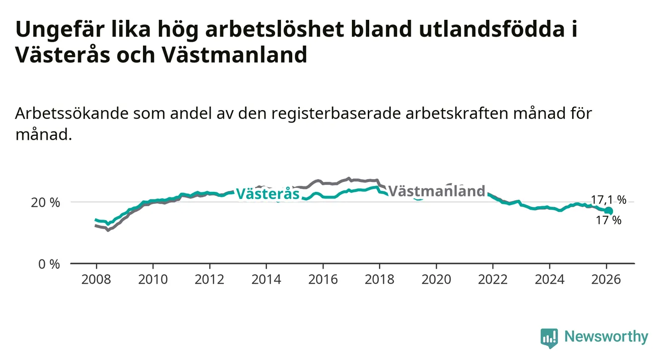 Arbetslösheten bland utlandsfödda var 17,0 procent i Västerås under februari månad, motsvarande 4 249 av 24 994 personer. Det är 2,1 procentenheter färre än vid samma tidpunkt i fjol (−404 om man räknar personer). Därmed är de utlandsföddas arbetslöshet lägre än vid samma tidpunkt i fjol för sjätte månaden i följd. Sedan augusti 2025 har arbetslösheten bland utlandsfödda minskat från 18,7 till 17,0 procent. Den nuvarande arbetslöshetsnivån är den lägsta sedan februari 2009.