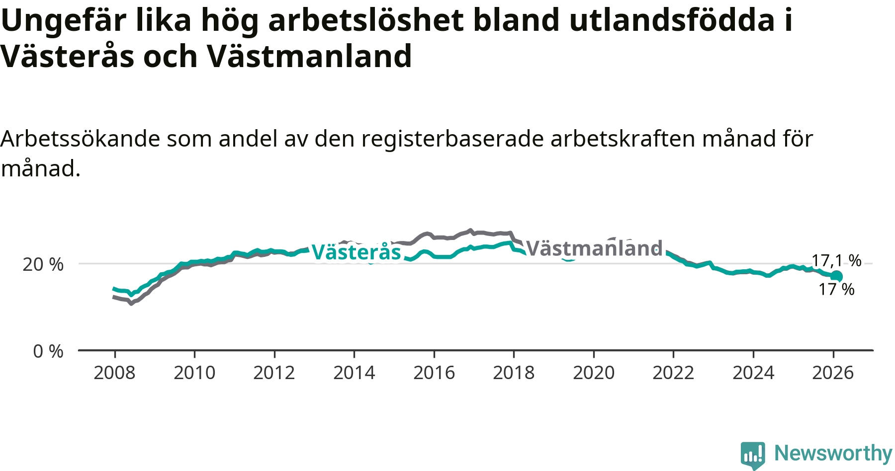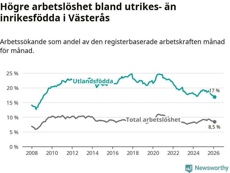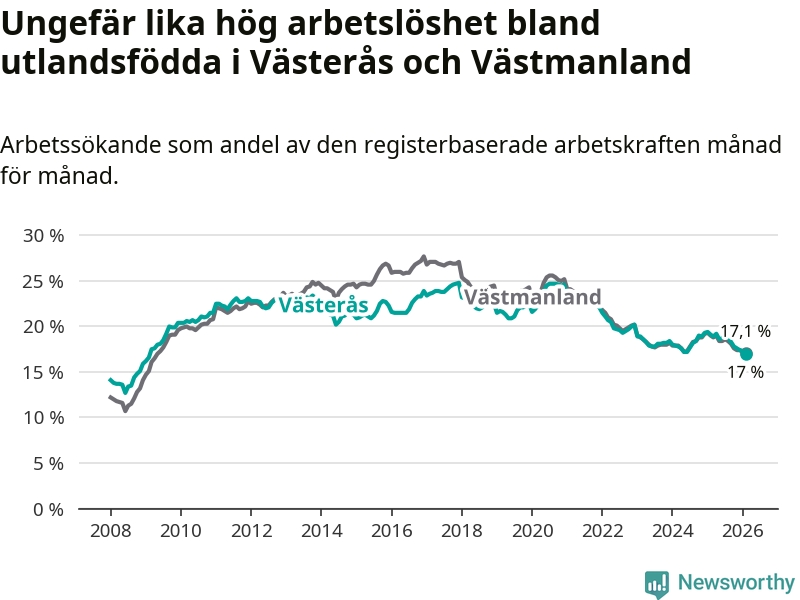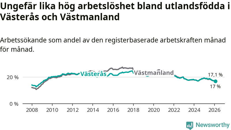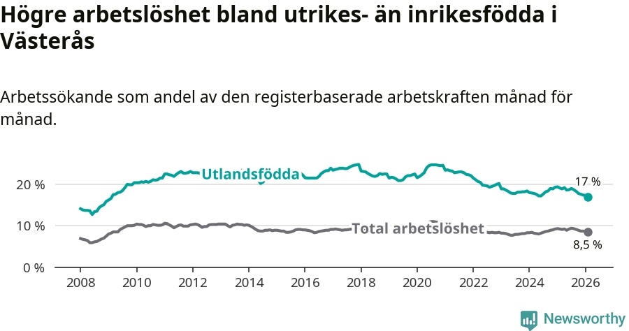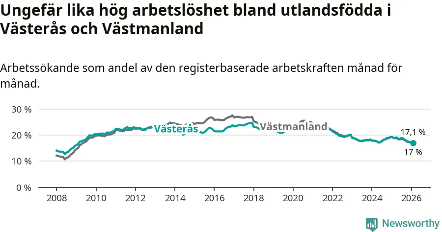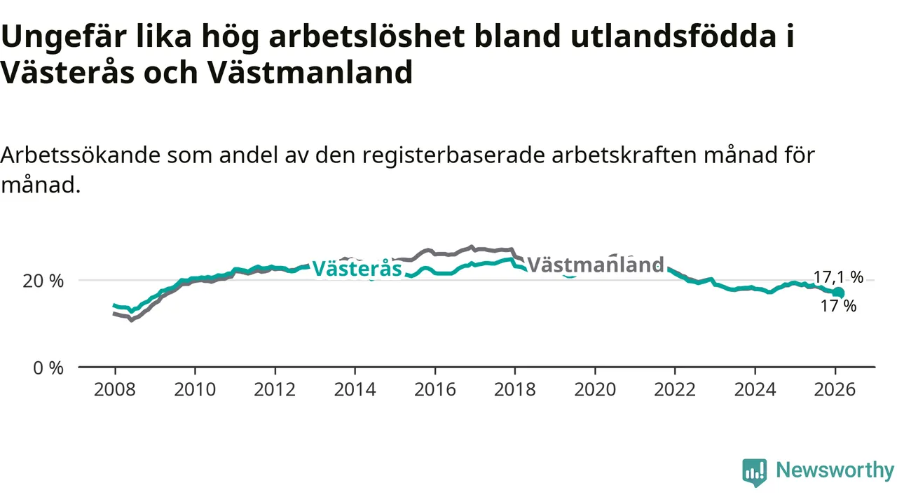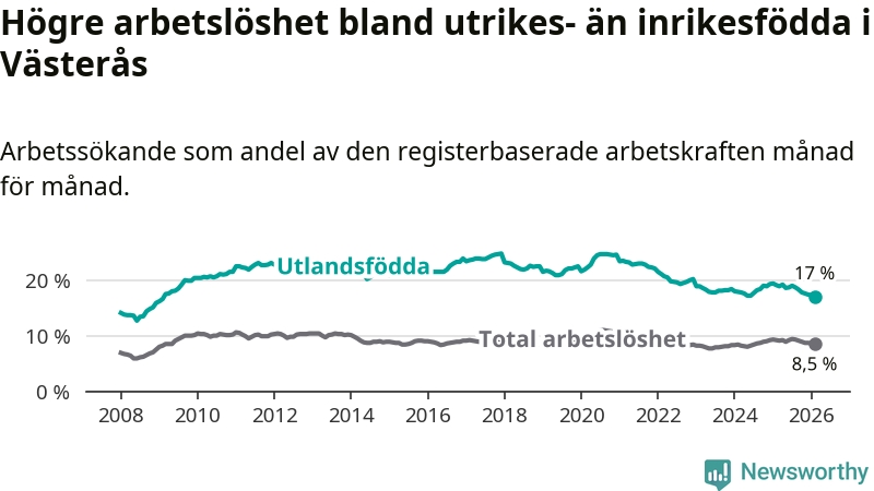 Arbetslösheten bland utlandsfödda var 17,0 procent i Västerås under februari månad, motsvarande 4 249 av 24 994 personer. Det är 2,1 procentenheter färre än vid samma tidpunkt i fjol (−404 om man räknar personer). Därmed är de utlandsföddas arbetslöshet lägre än vid samma tidpunkt i fjol för sjätte månaden i följd. Sedan augusti 2025 har arbetslösheten bland utlandsfödda minskat från 18,7 till 17,0 procent. Den nuvarande arbetslöshetsnivån är den lägsta sedan februari 2009.