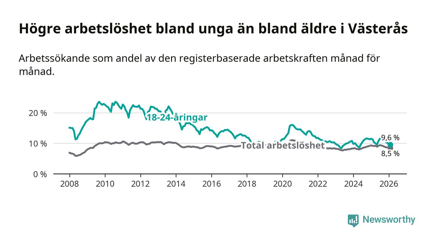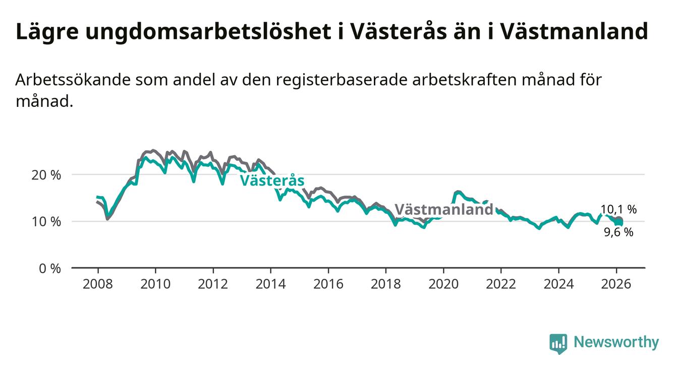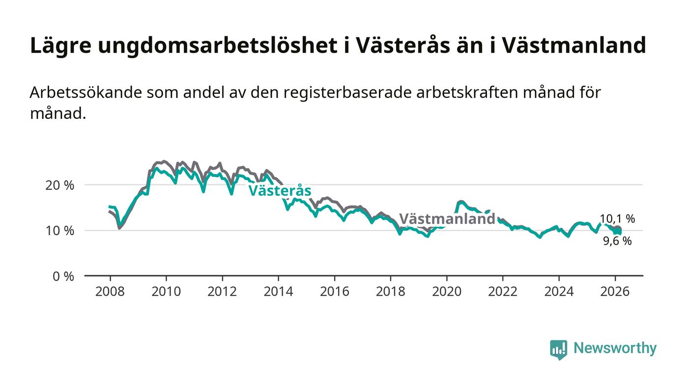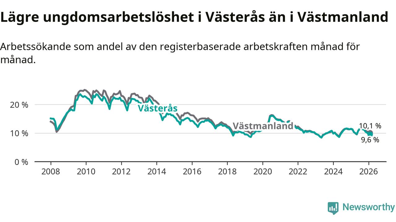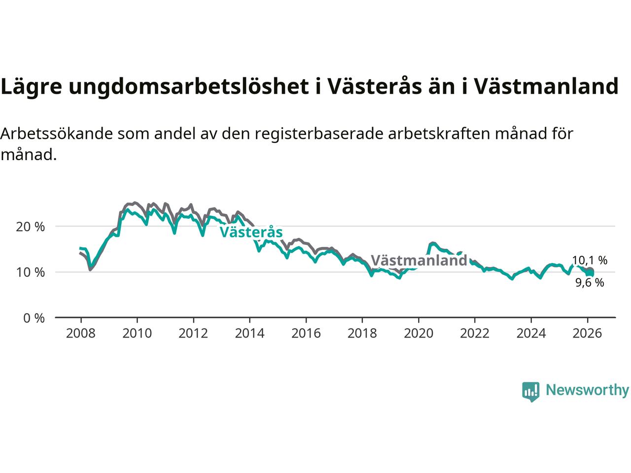 Medan Västerås har högre total arbetslöshet än Västmanland, ligger ungdomsarbetslösheten 0,5 procentenheter lägre i Västerås.