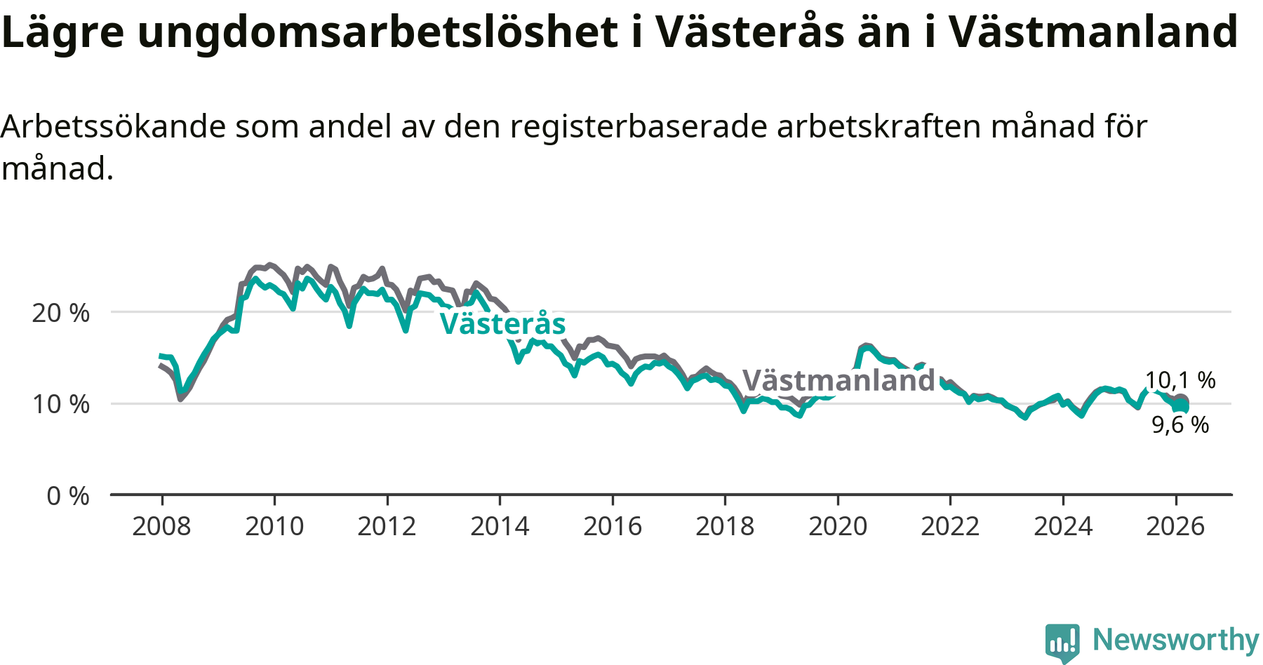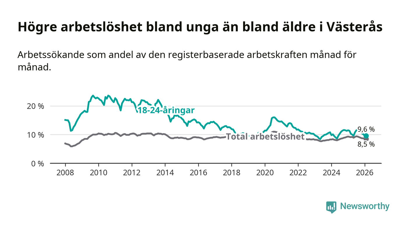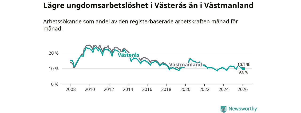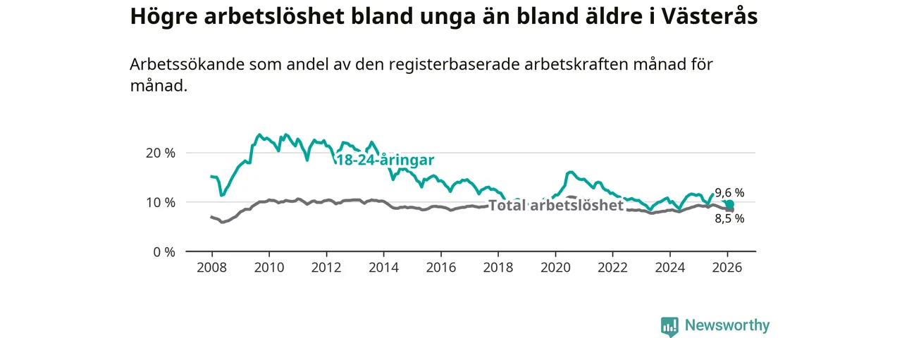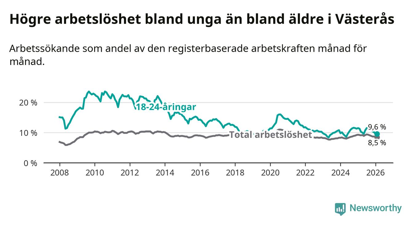 Medan Västerås har högre total arbetslöshet än Västmanland, ligger ungdomsarbetslösheten 0,5 procentenheter lägre i Västerås.