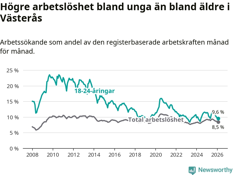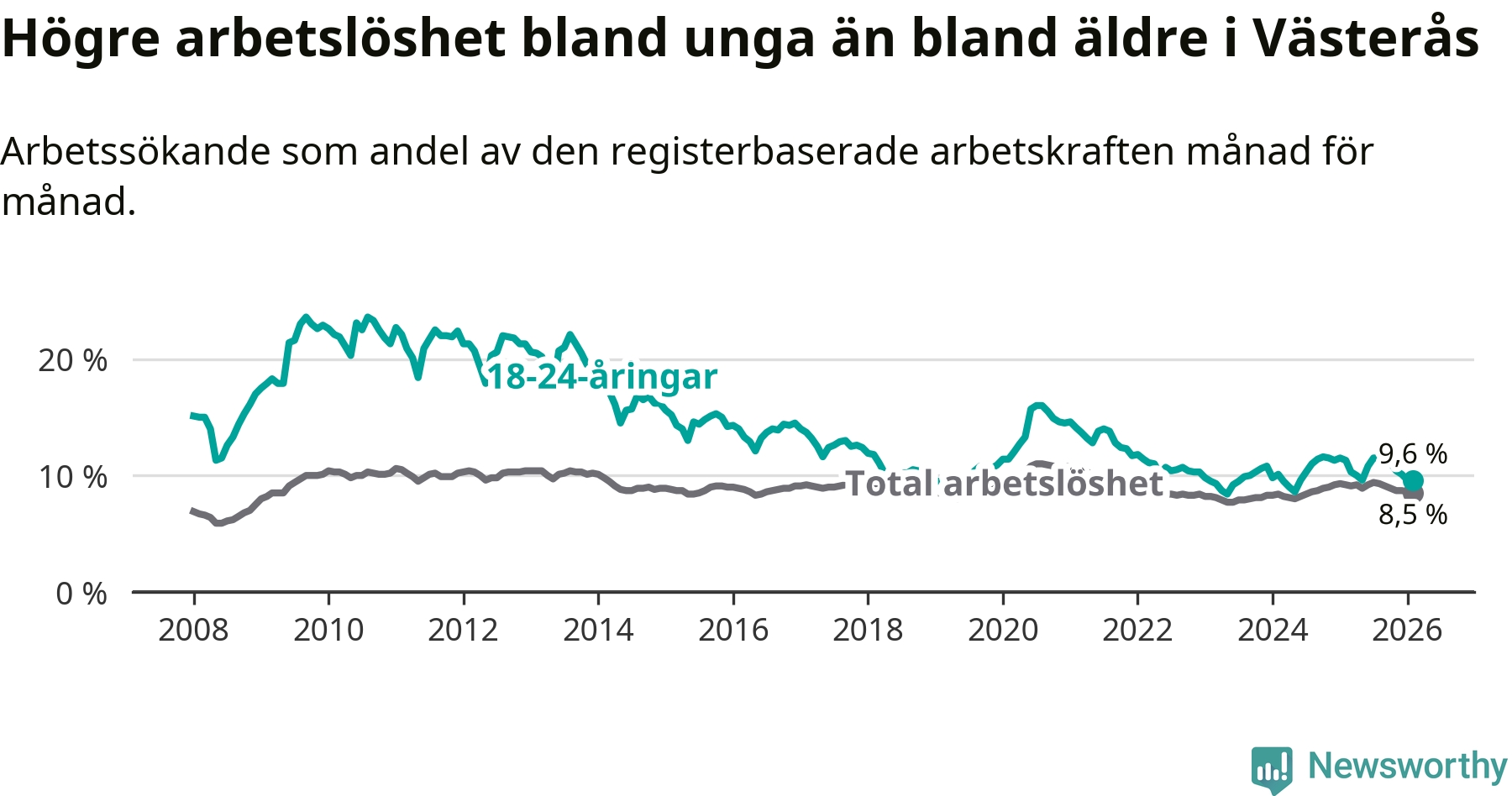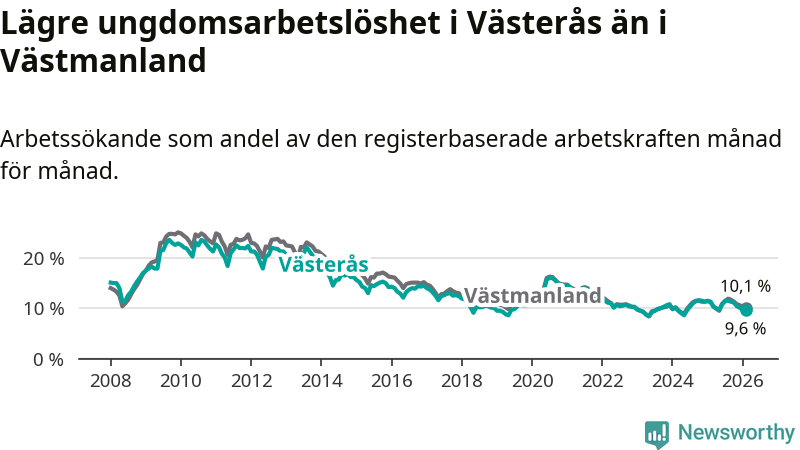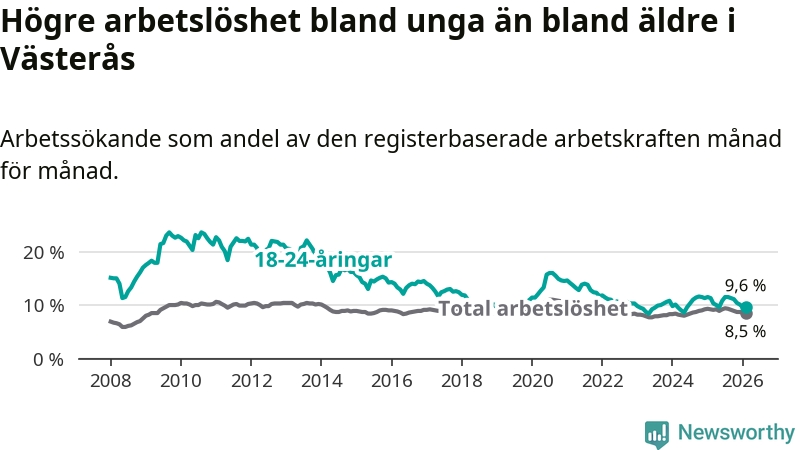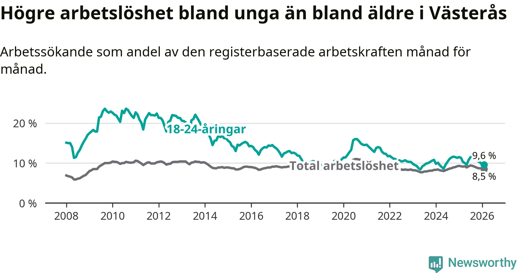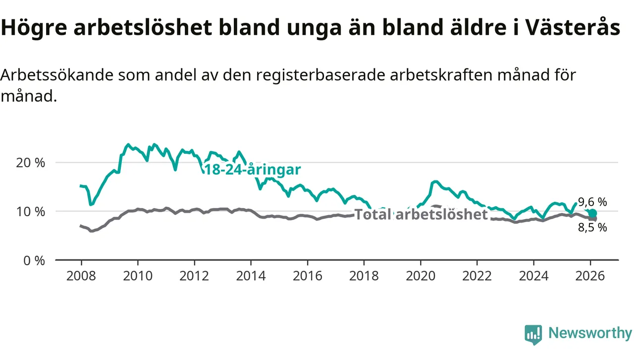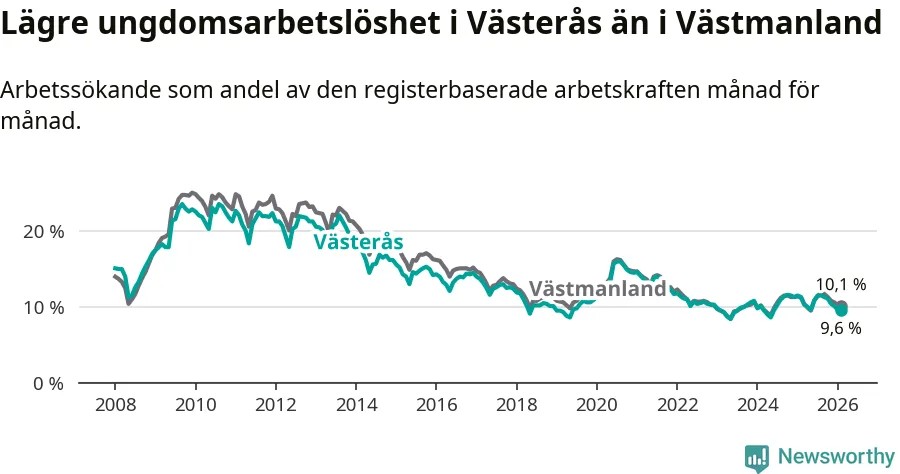 Medan Västerås har högre total arbetslöshet än Västmanland, ligger ungdomsarbetslösheten 0,5 procentenheter lägre i Västerås.