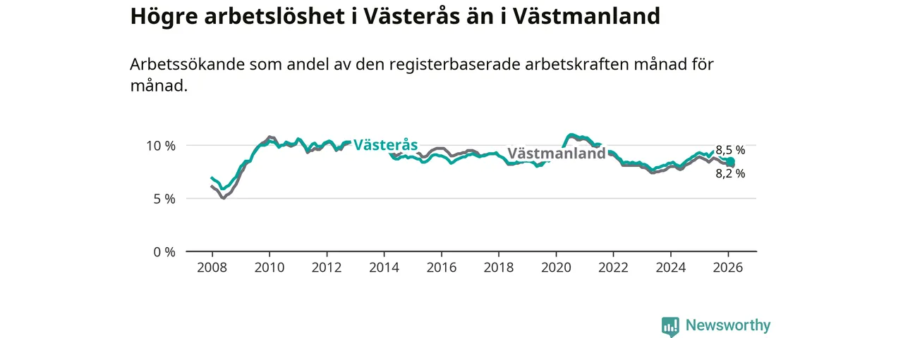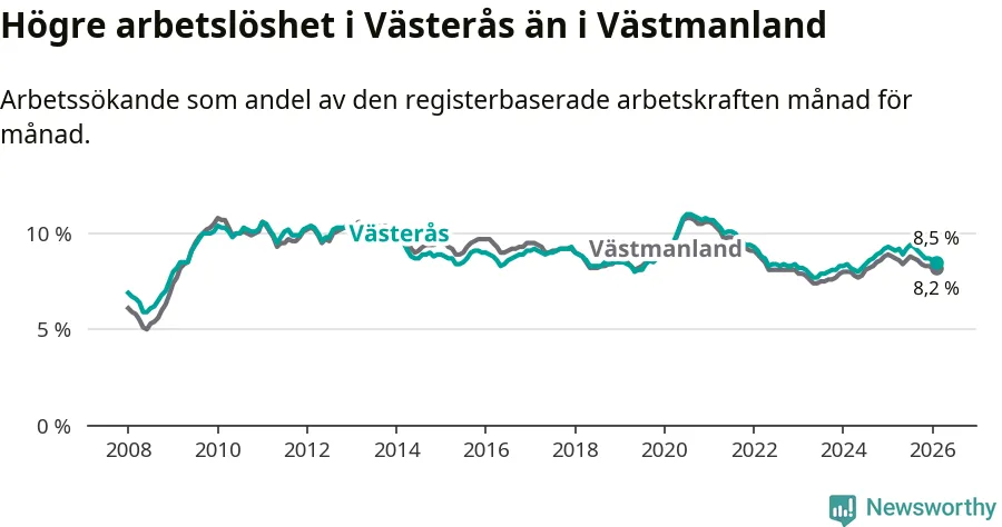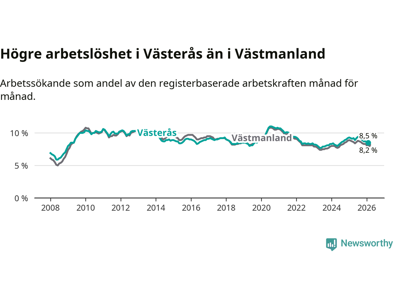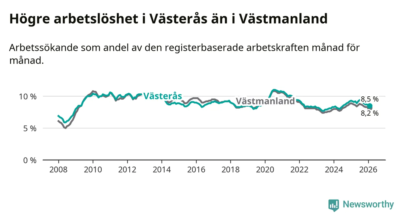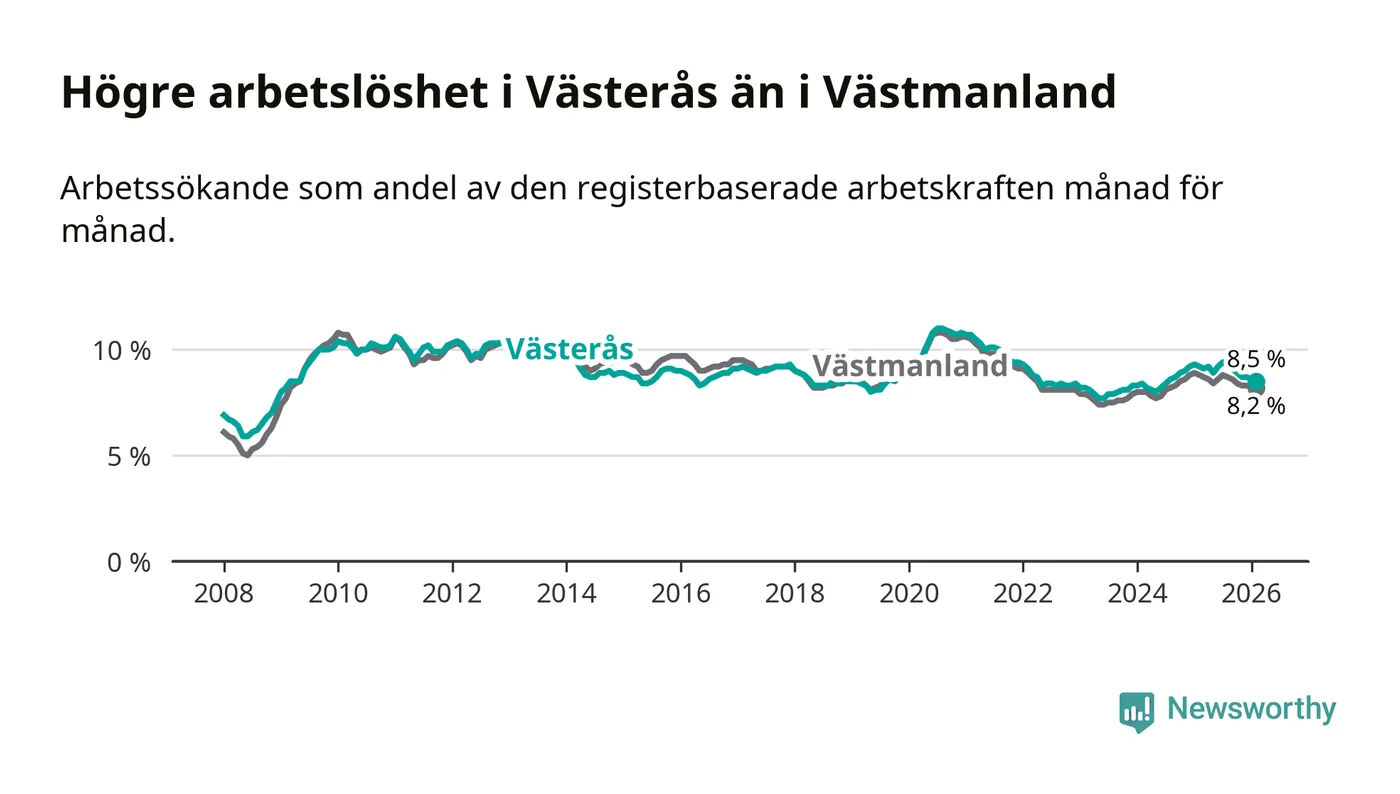 Anmärkningsvärt är att arbetslösheten nu, för första gången sedan augusti 2024, är lägre i Västerås än snittet i Västmanland, även om skillnaden bara är 0,1 procentenheter.