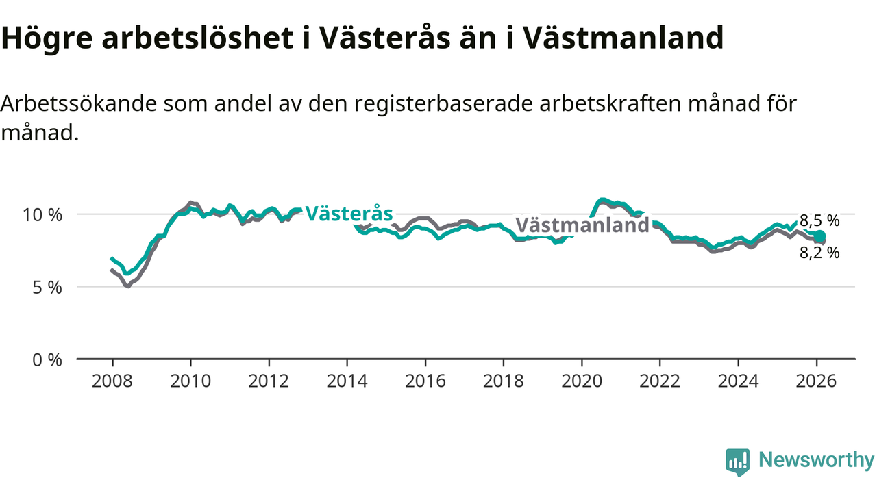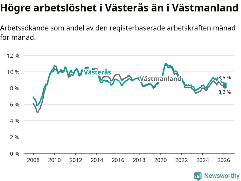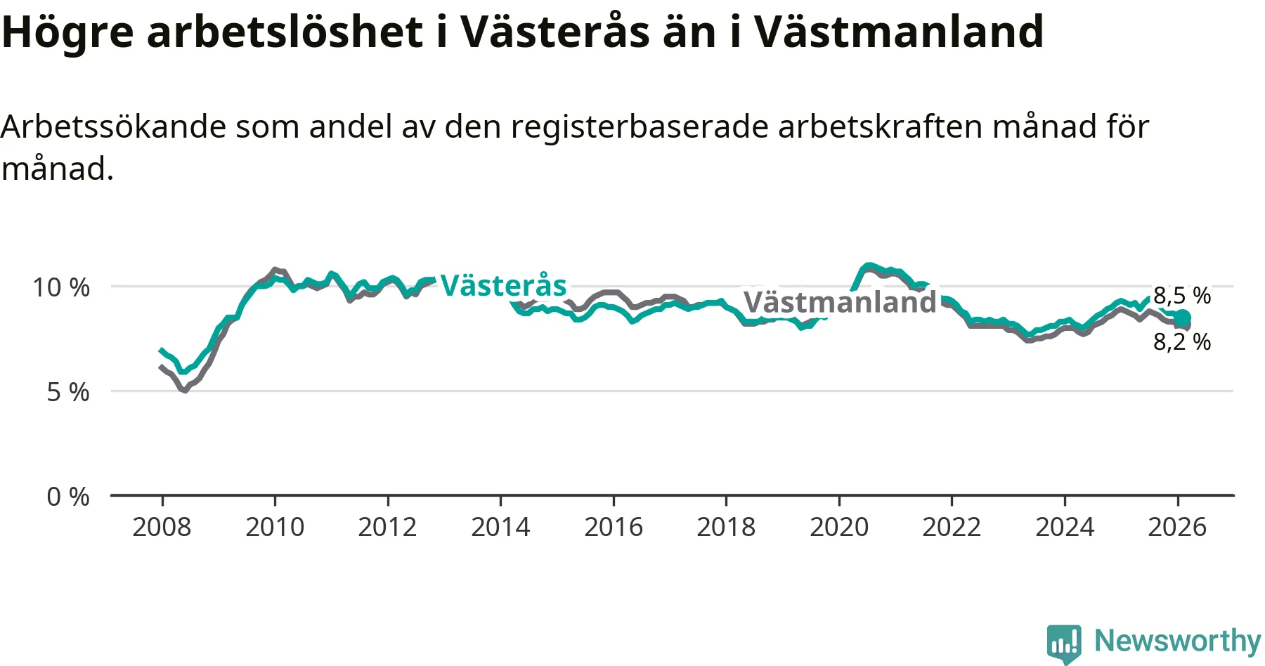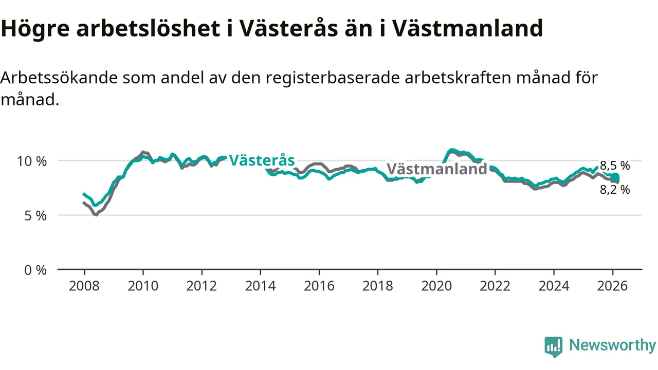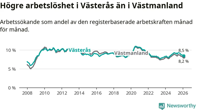 Anmärkningsvärt är att arbetslösheten nu, för första gången sedan augusti 2024, är lägre i Västerås än snittet i Västmanland, även om skillnaden bara är 0,1 procentenheter.