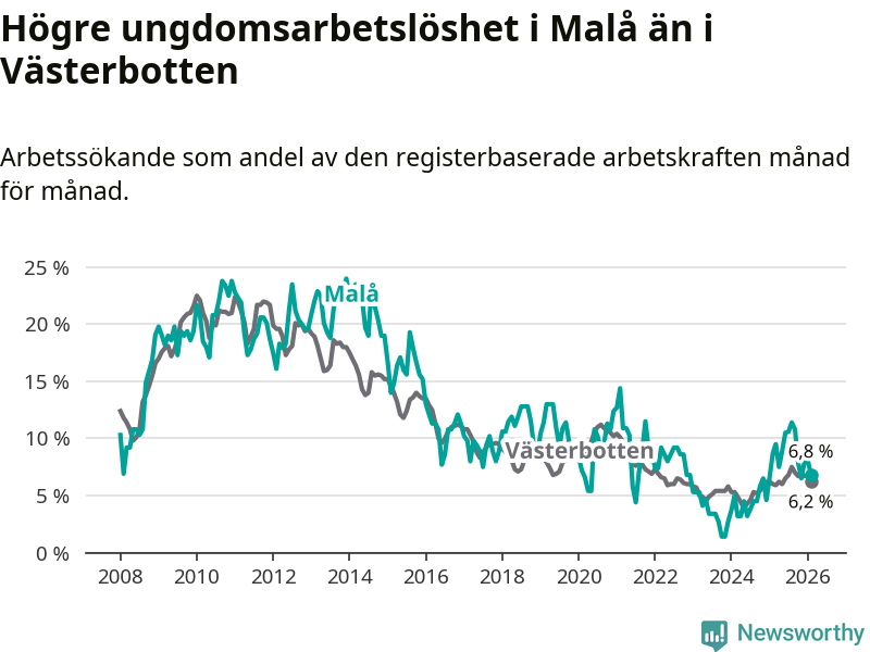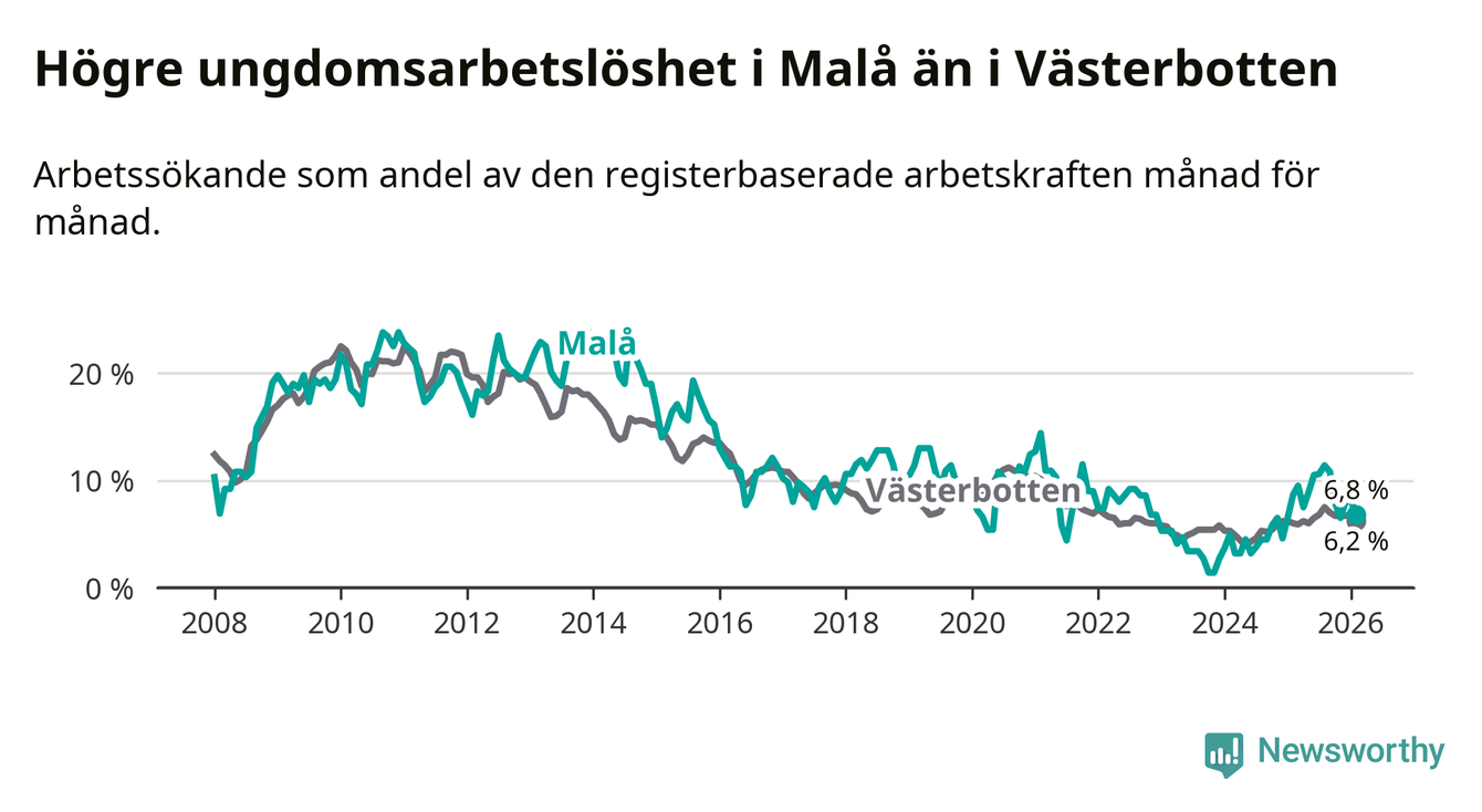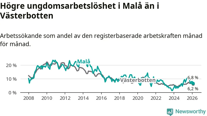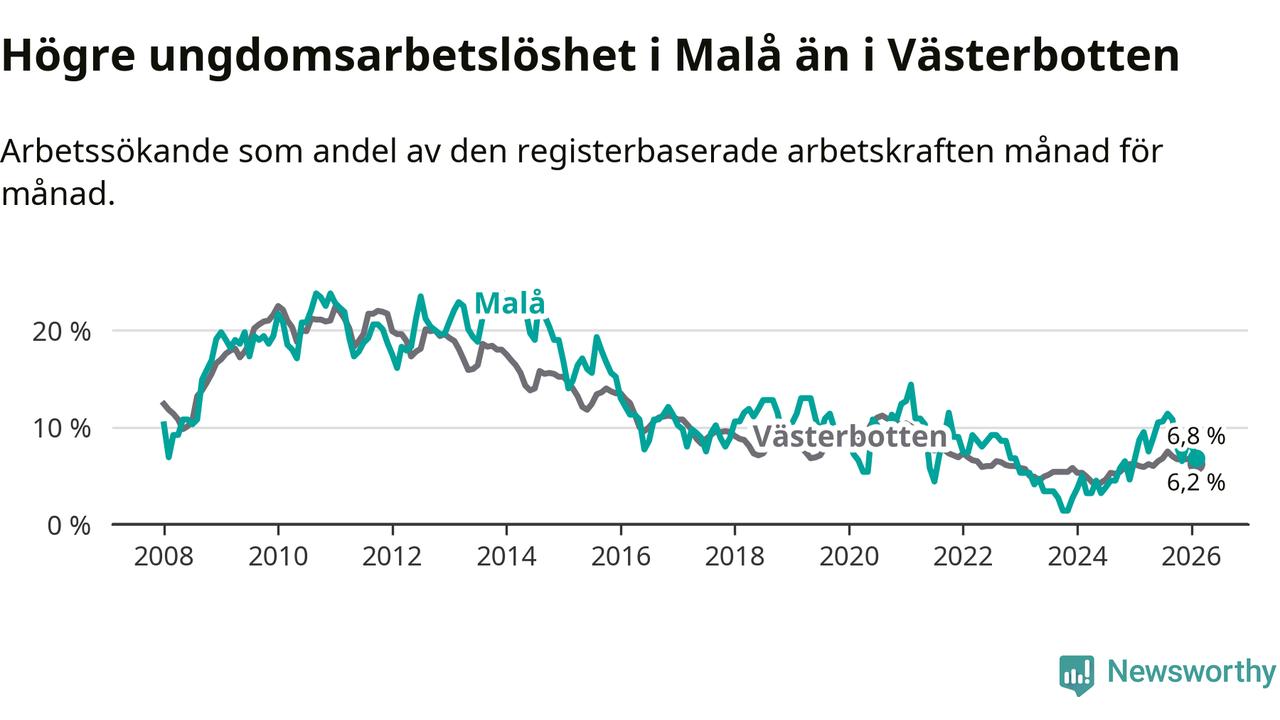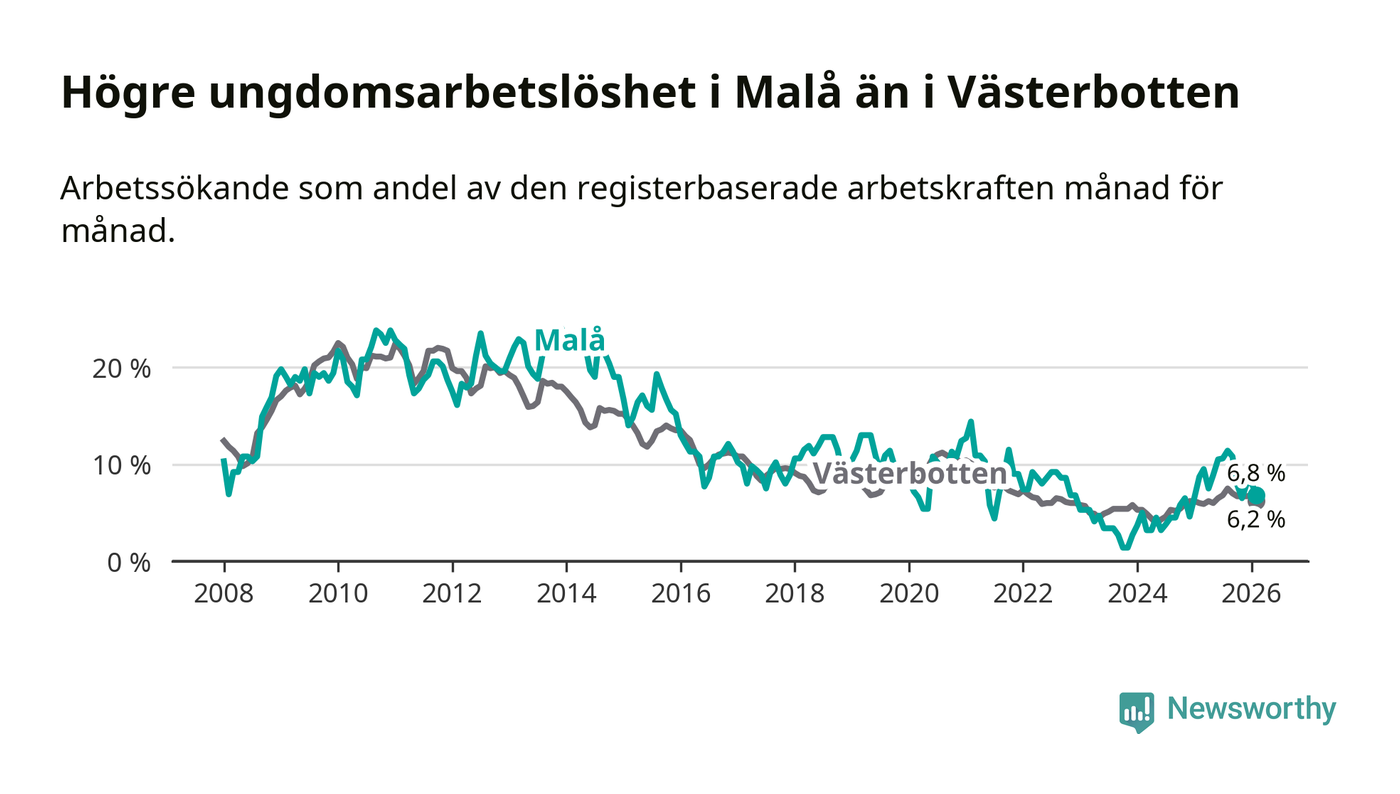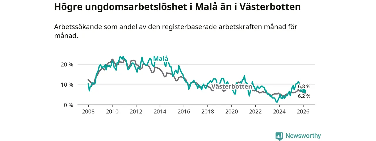 Medan Malå har lägre total arbetslöshet än Västerbotten, ligger ungdomsarbetslösheten 0,6 procentenheter högre i Malå.