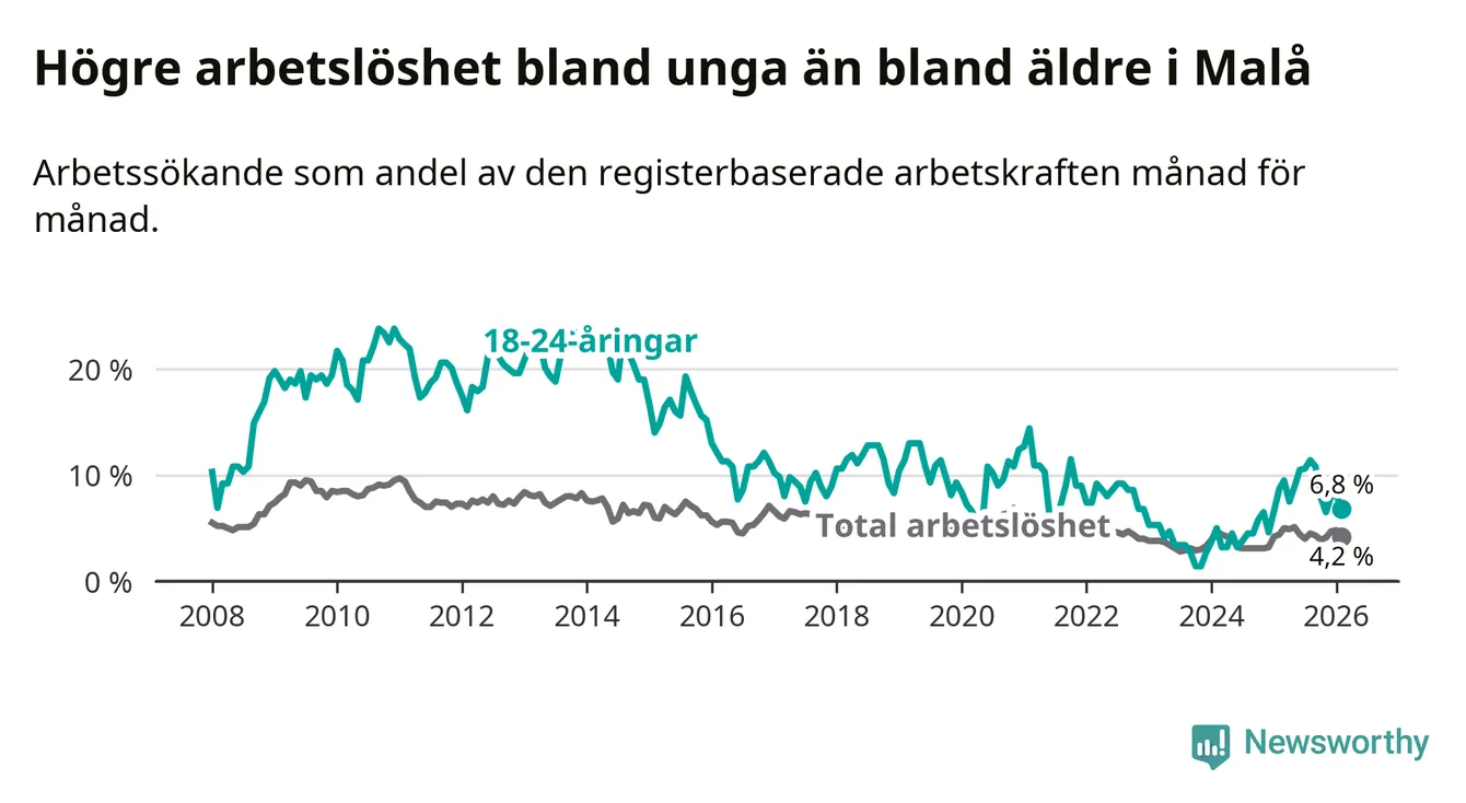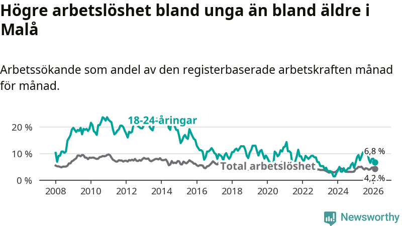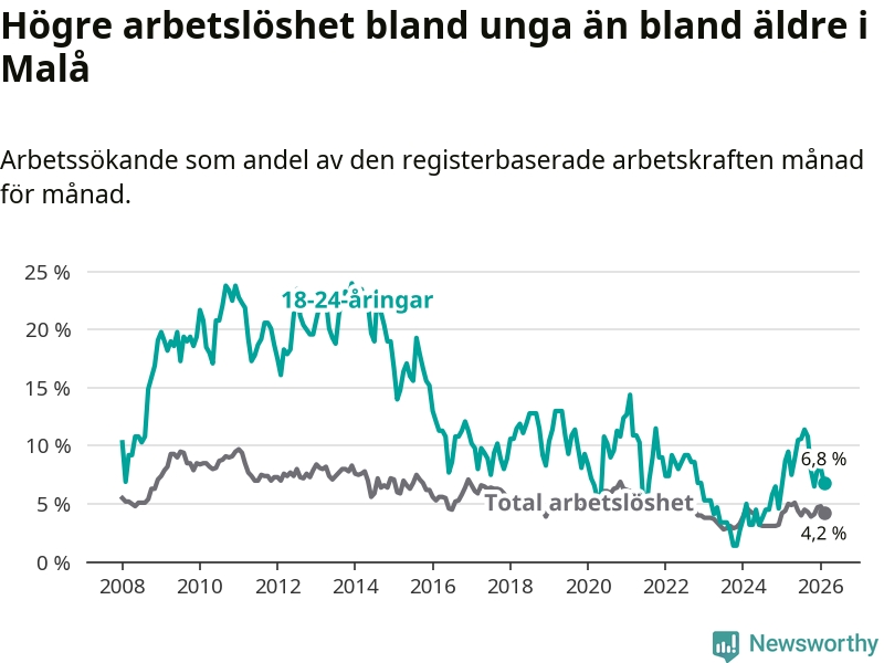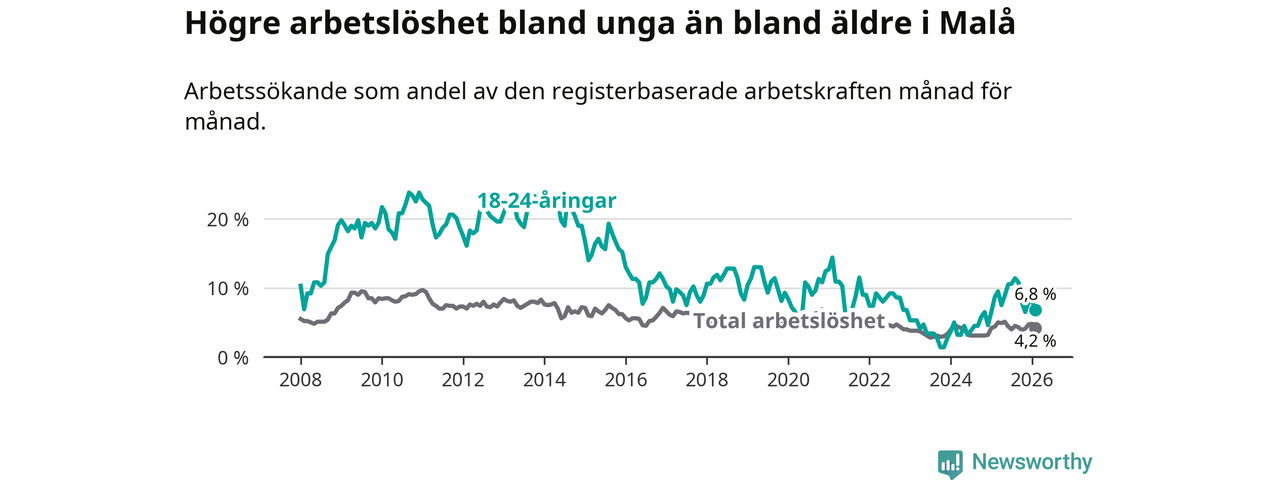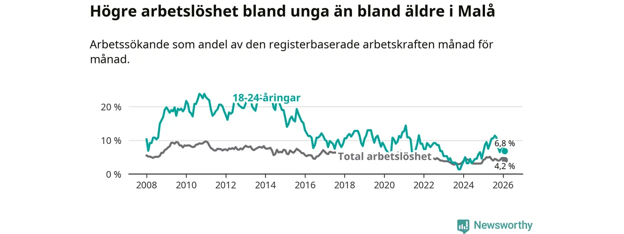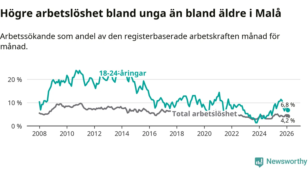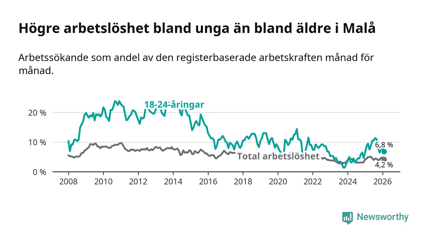 Medan Malå har lägre total arbetslöshet än Västerbotten, ligger ungdomsarbetslösheten 0,6 procentenheter högre i Malå.