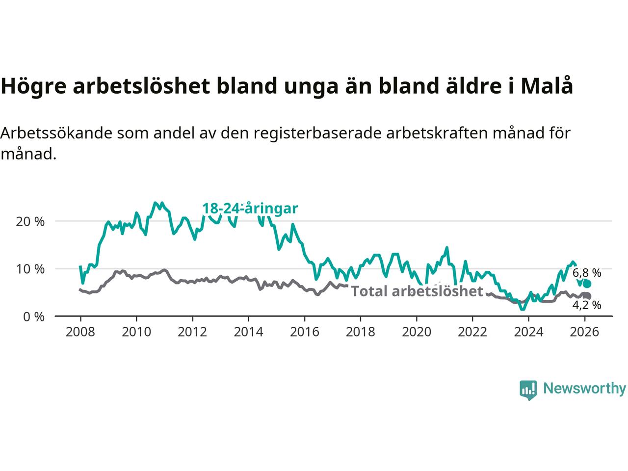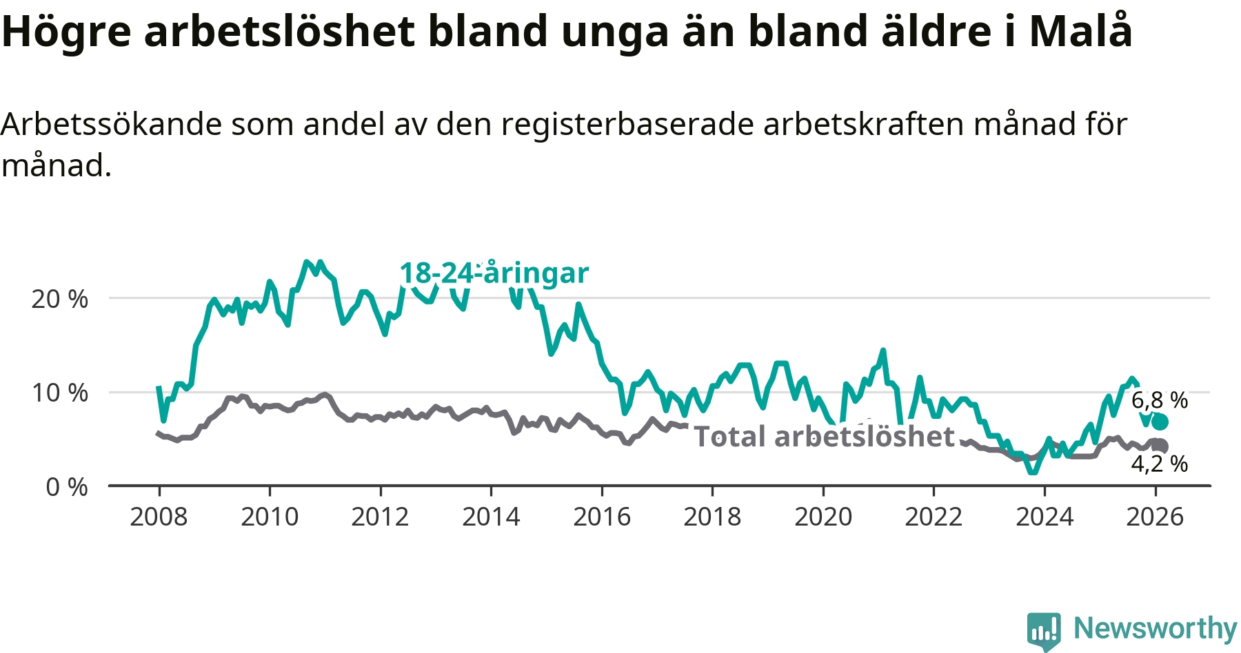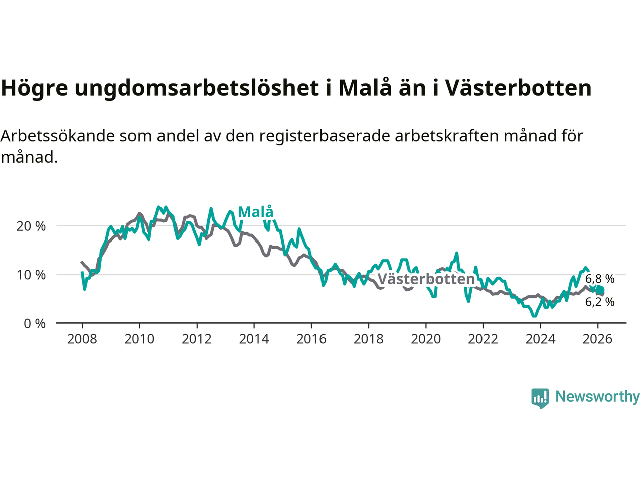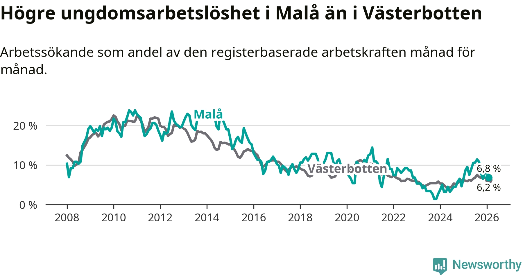 Medan Malå har lägre total arbetslöshet än Västerbotten, ligger ungdomsarbetslösheten 0,6 procentenheter högre i Malå.