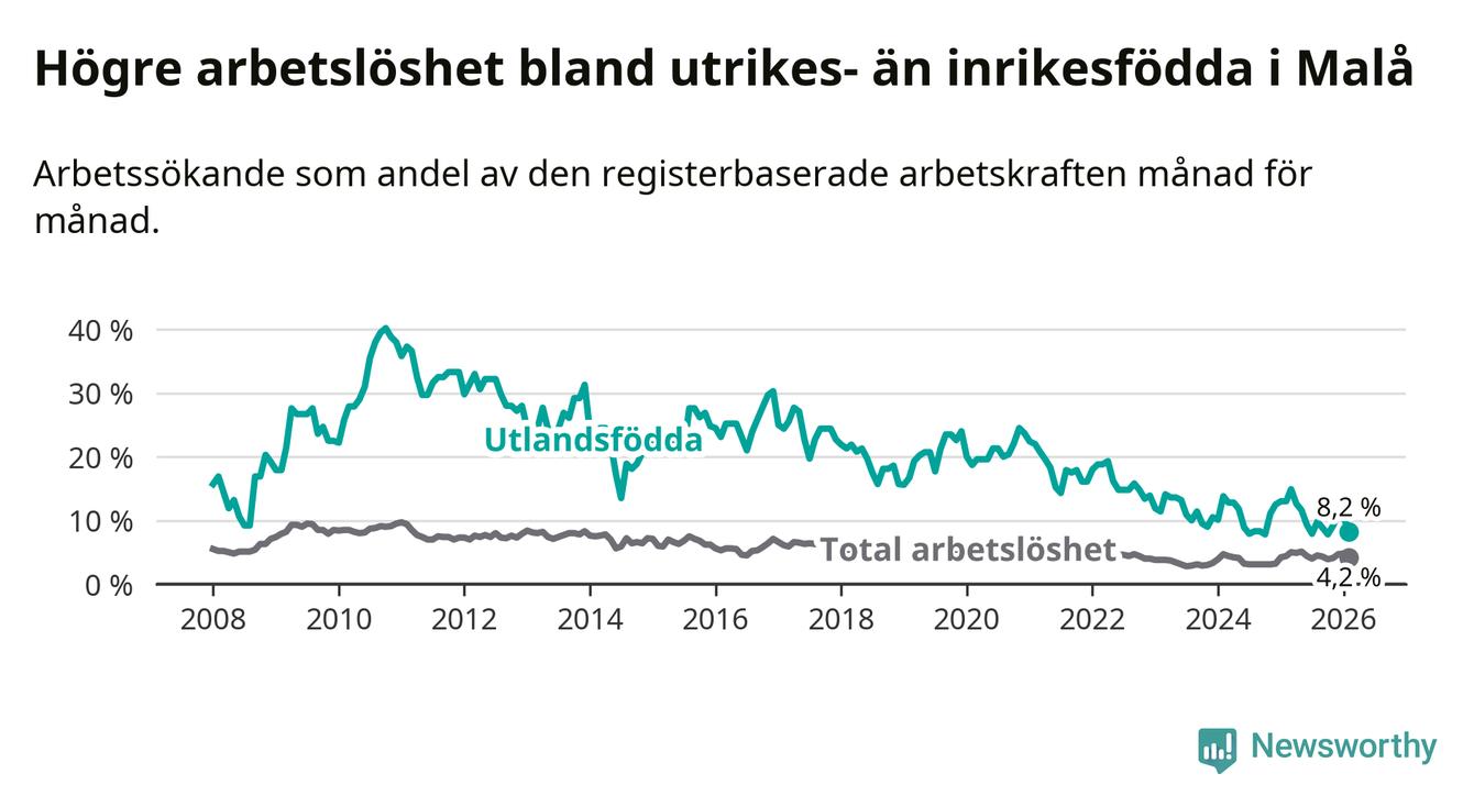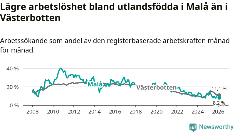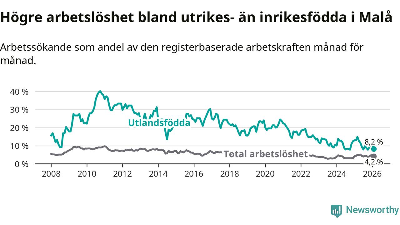 Arbetslösheten bland utlandsfödda var 8,2 procent i Malå under februari månad, motsvarande 18 av 220 personer. Det är 4,8 procentenheter färre än vid samma tidpunkt i fjol (−10 om man räknar personer).