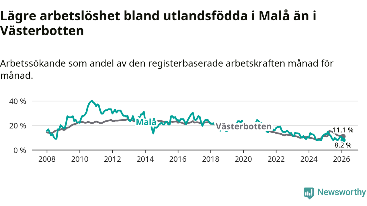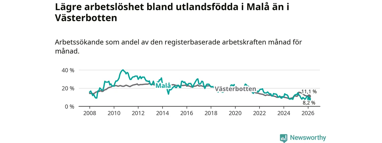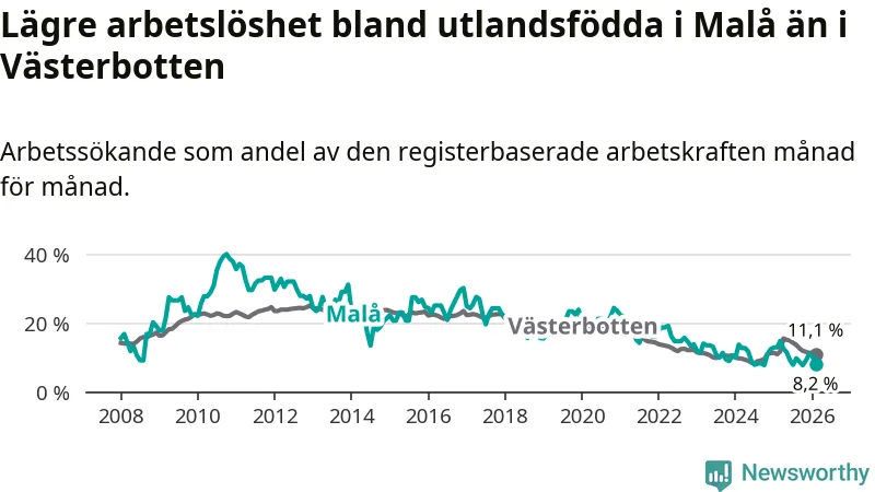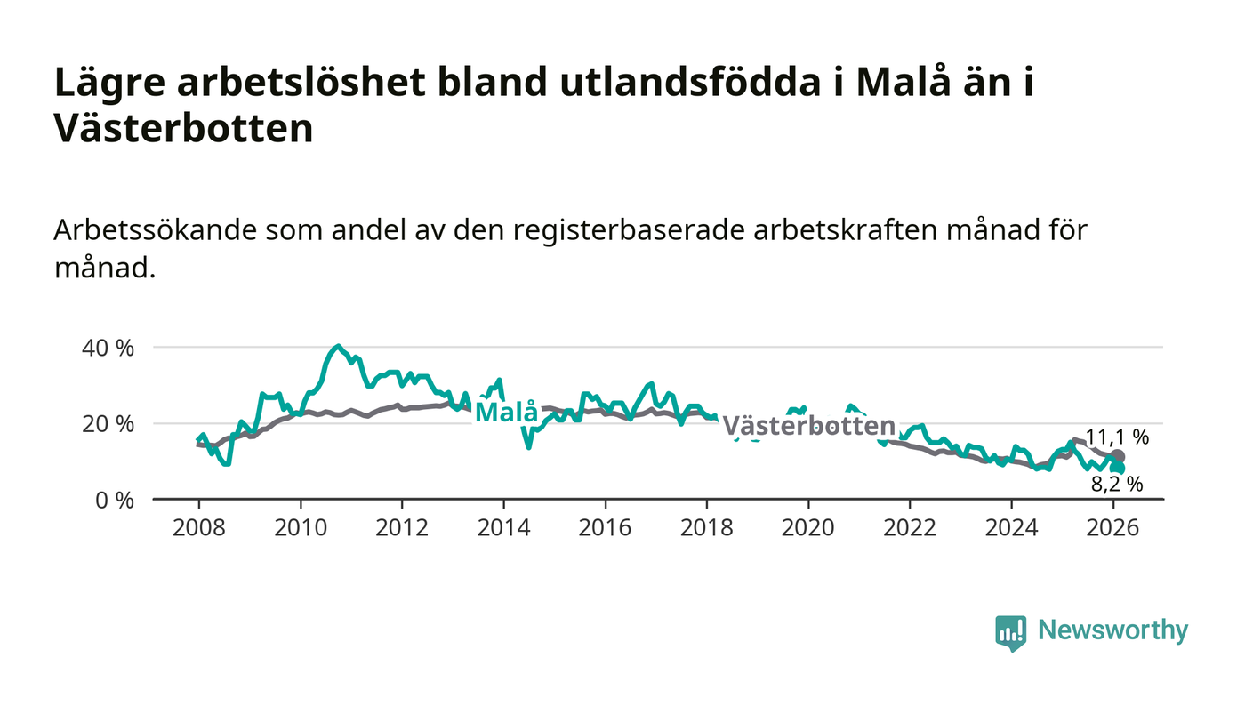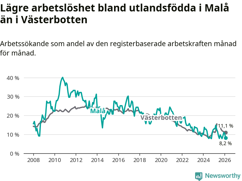 Medan arbetslösheten bland utlandsfödda alltså minskar i Malå så ökar den i Västerbotten. Jämfört med februari förra året har andelen arbetslösa utlandsfödda i länet ökat med 0,1 procentenheter (till 11,1 procent).