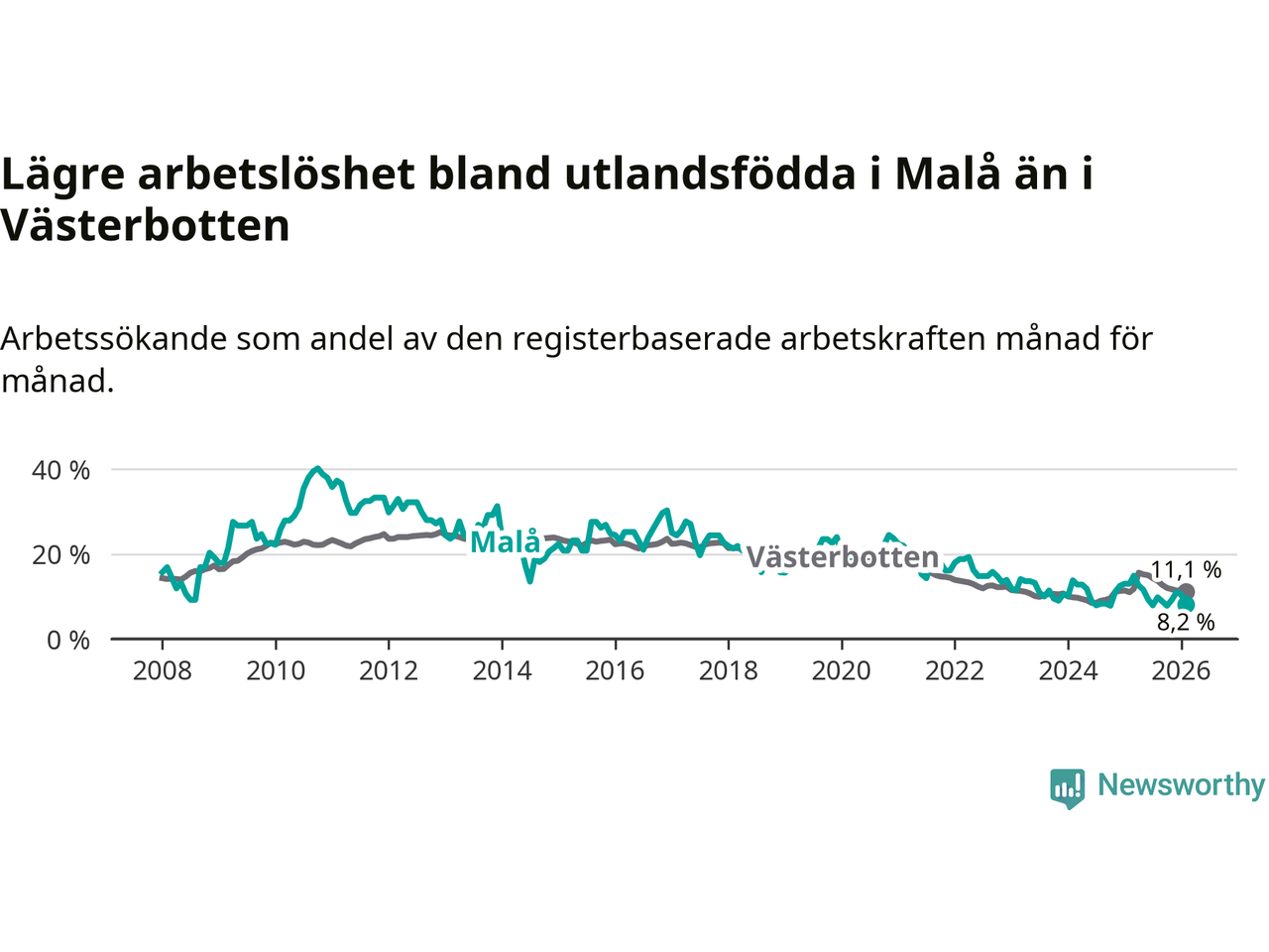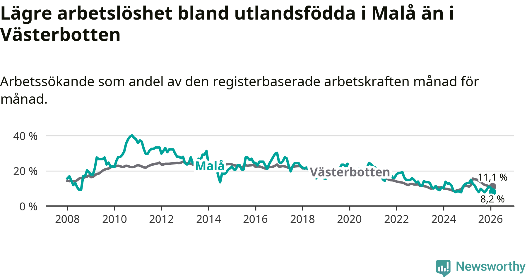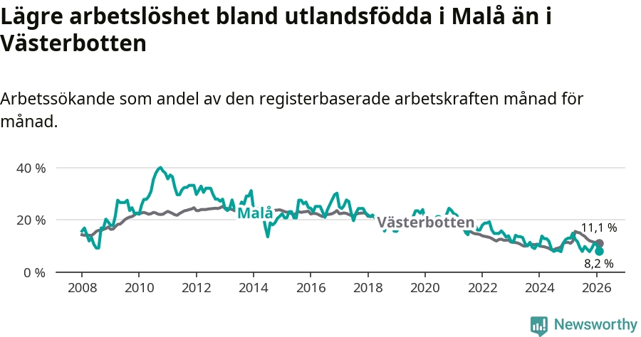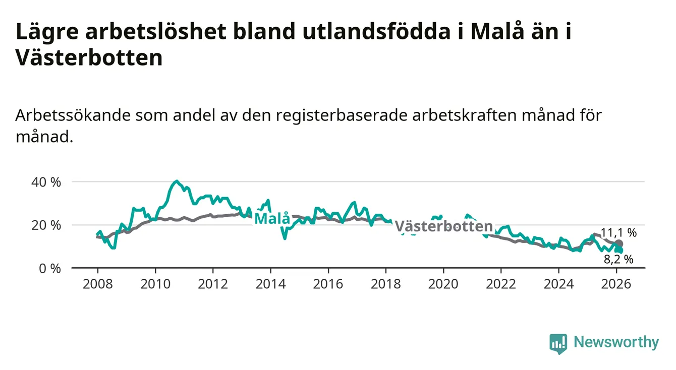 Medan arbetslösheten bland utlandsfödda alltså minskar i Malå så ökar den i Västerbotten. Jämfört med februari förra året har andelen arbetslösa utlandsfödda i länet ökat med 0,1 procentenheter (till 11,1 procent).