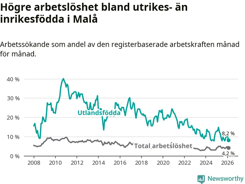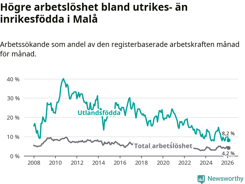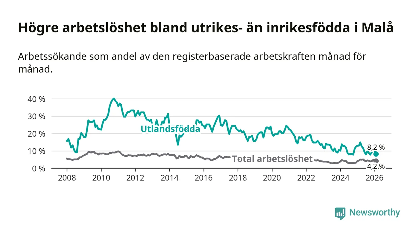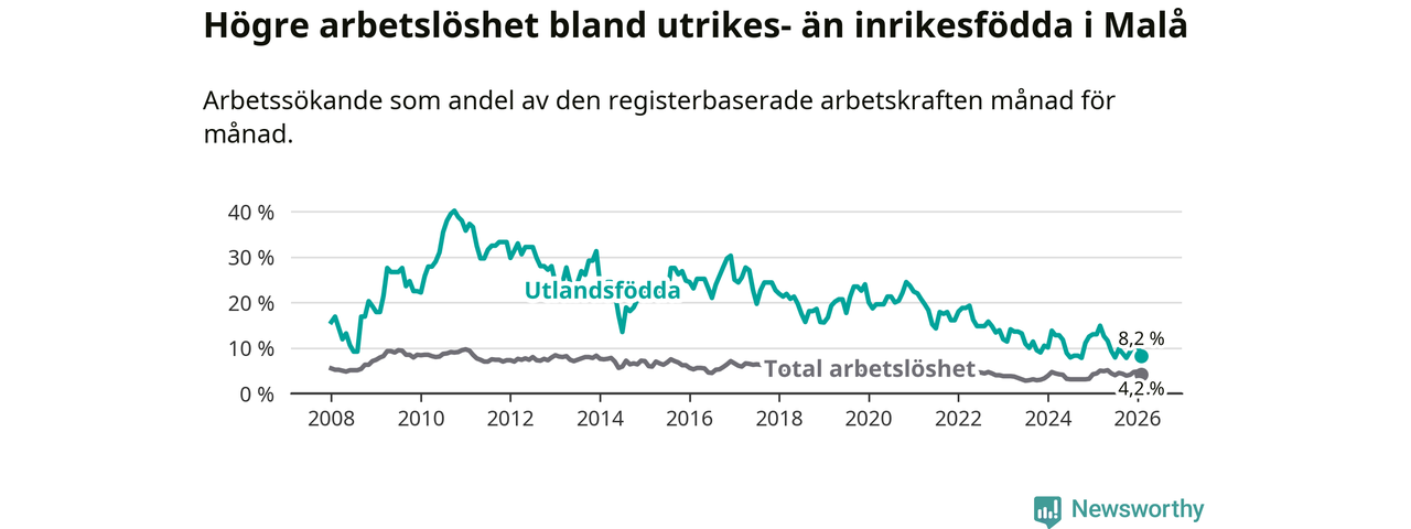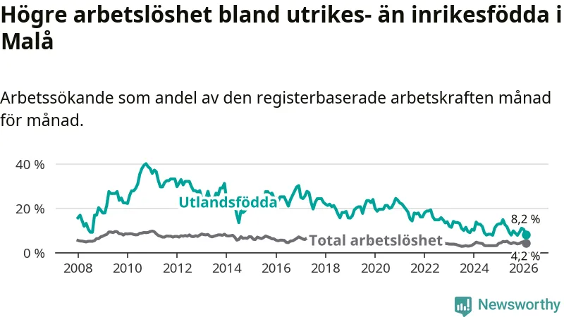 Skillnaden i arbetslöshet mellan utrikesfödda och hela befolkningen är 4,0 procentenheter i Malå. Det är en betydligt mindre skillnad än för ett år sedan (−4,6 procentenheter).