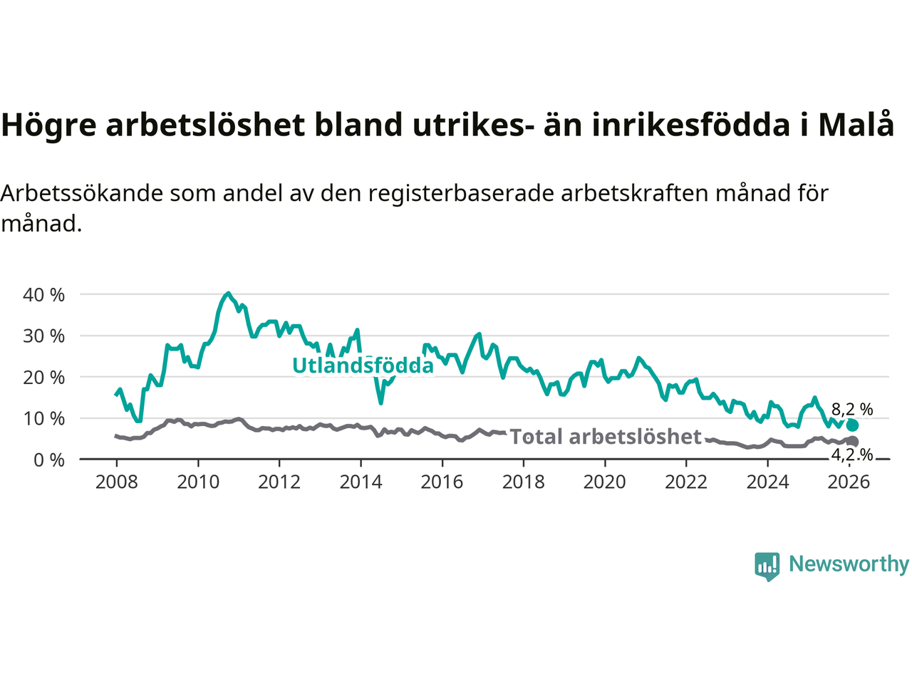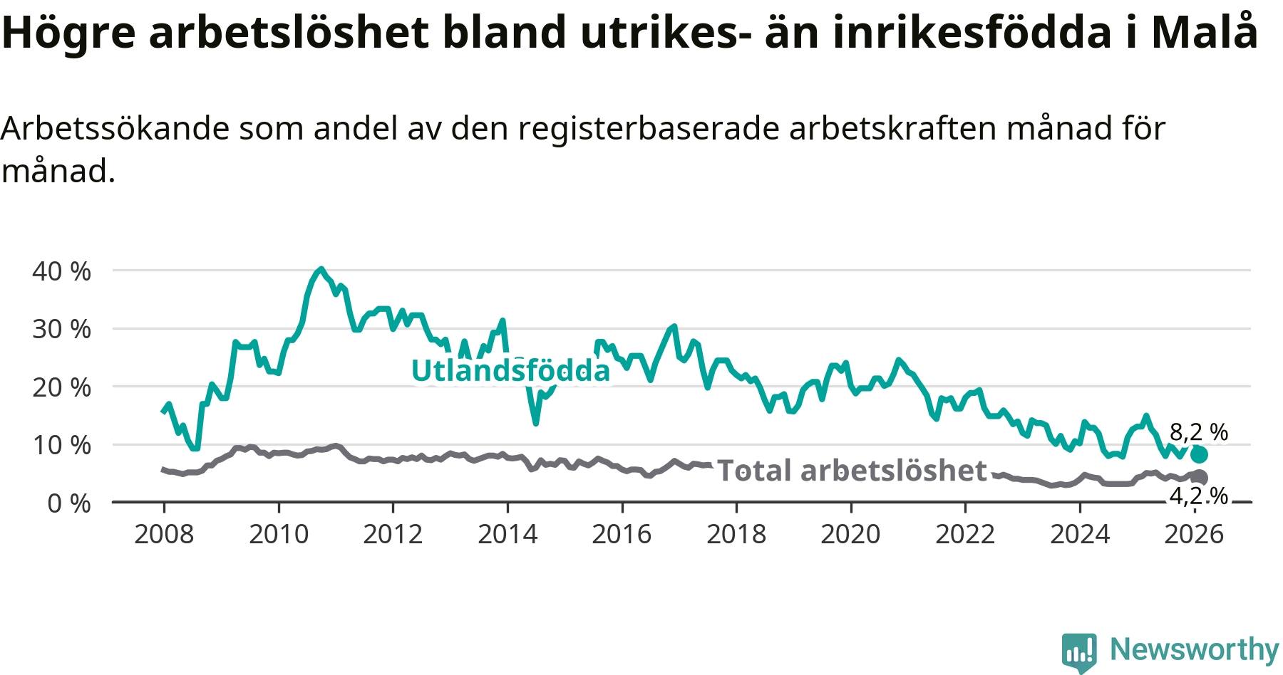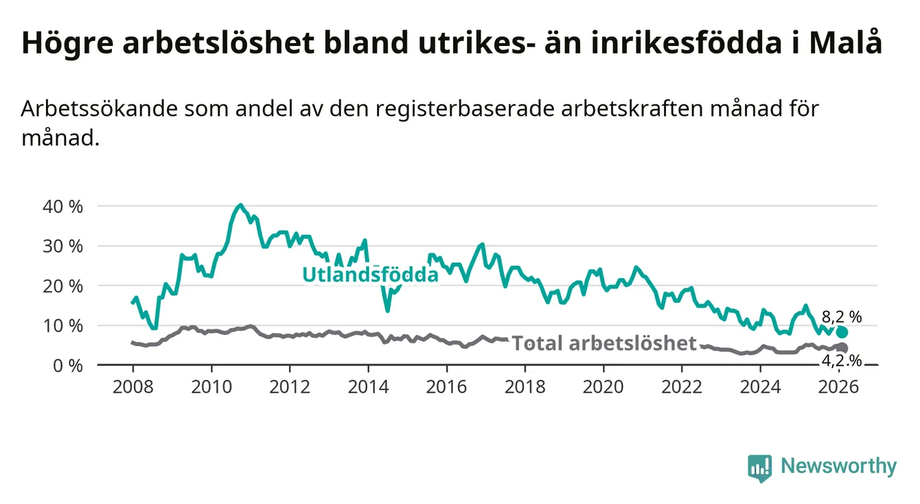 Skillnaden i arbetslöshet mellan utrikesfödda och hela befolkningen är 4,0 procentenheter i Malå. Det är en betydligt mindre skillnad än för ett år sedan (−4,6 procentenheter).