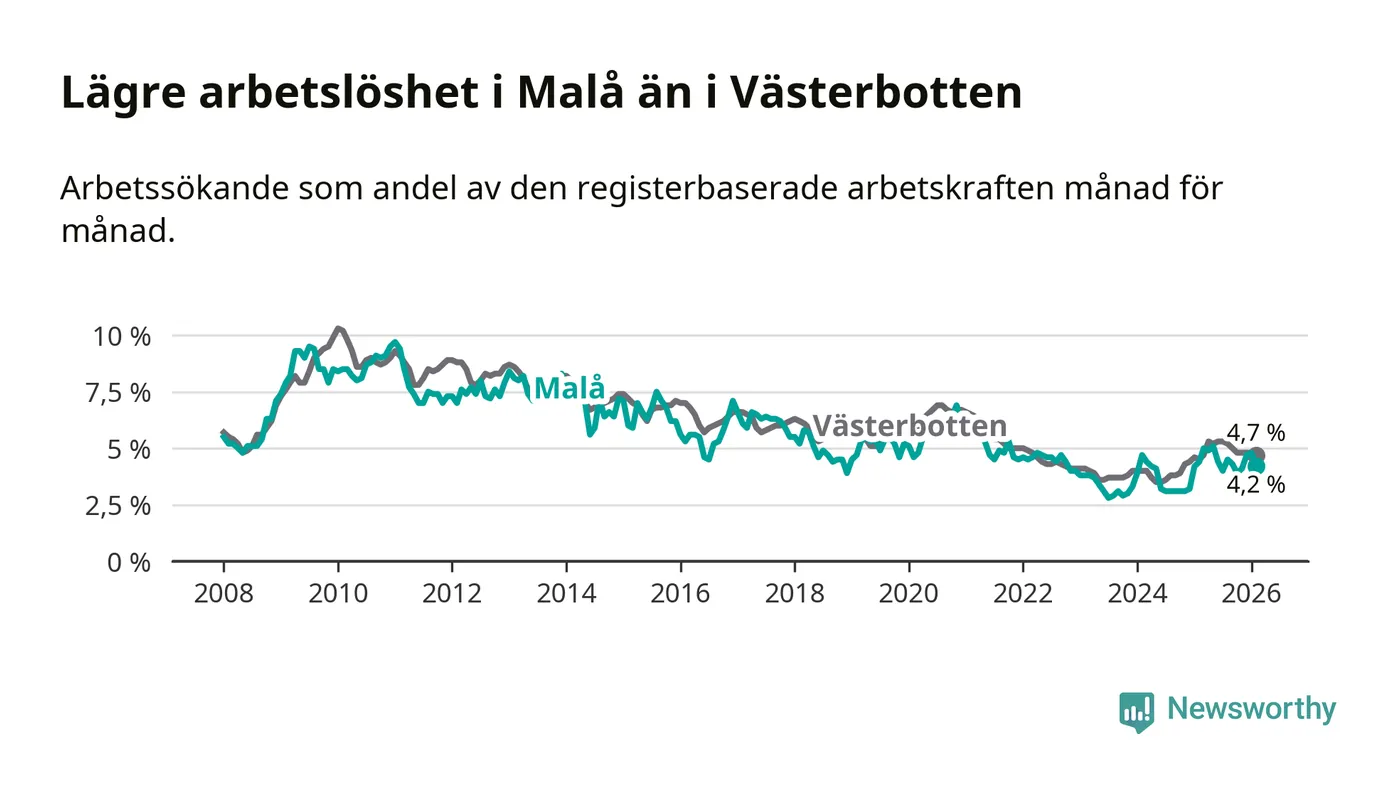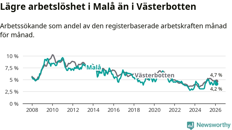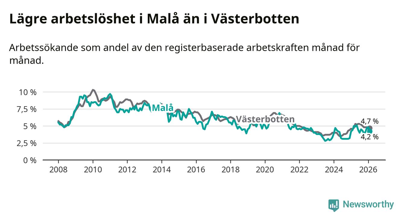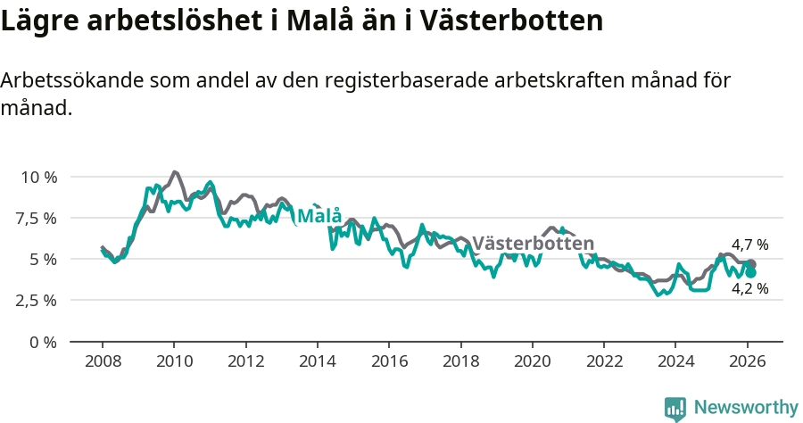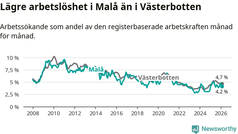 Under februari månad rapporterade Malå kommun en total arbetslöshet på 4,2 procent. Det är en minskning jämfört med samma tidpunkt i fjol (−0,2 procentenheter). I Västerbottens län däremot stiger arbetslösheten .