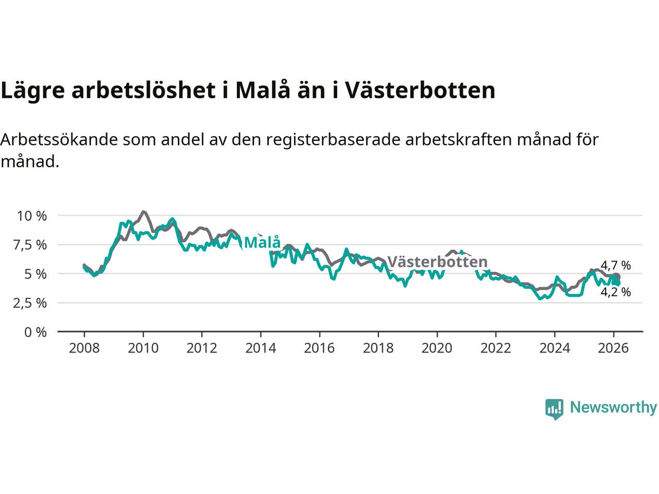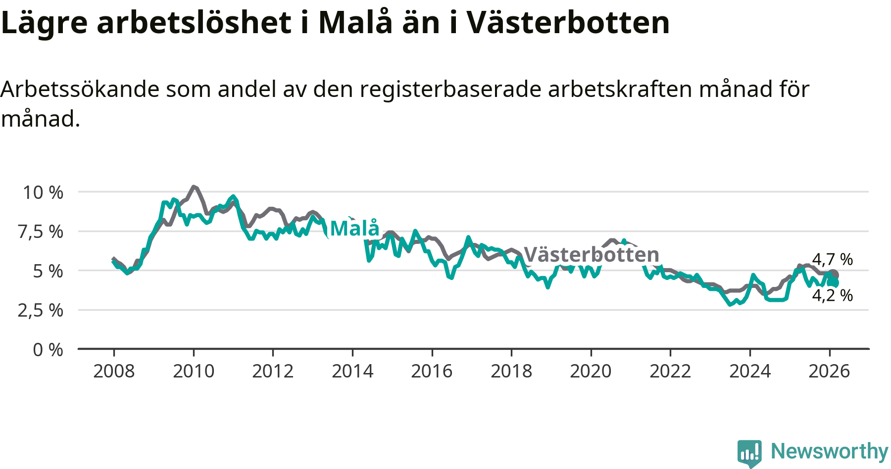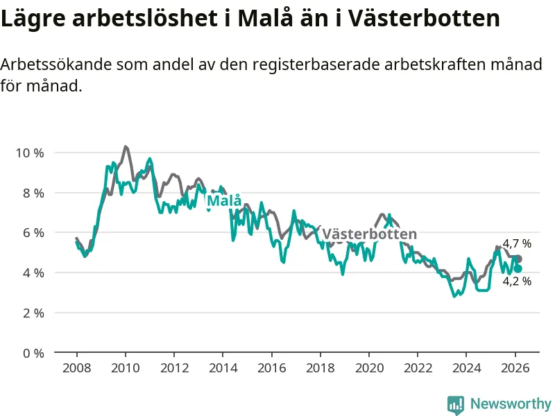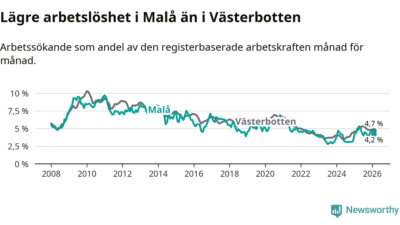 Under februari månad rapporterade Malå kommun en total arbetslöshet på 4,2 procent. Det är en minskning jämfört med samma tidpunkt i fjol (−0,2 procentenheter). I Västerbottens län däremot stiger arbetslösheten .