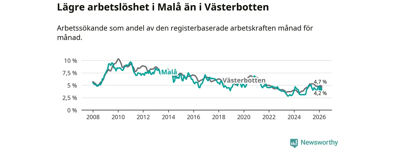 Sedan februari 2025 har arbetslösheten i Malå kommun ökat, men i februari vände utvecklingen då andelen arbetslösa sjönk något jämfört med året innan.