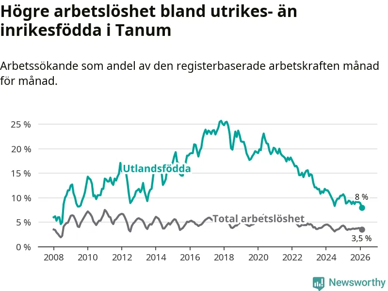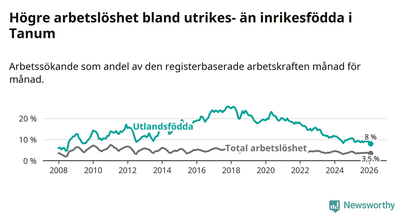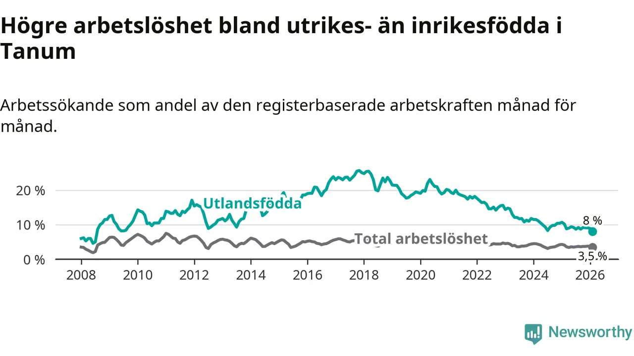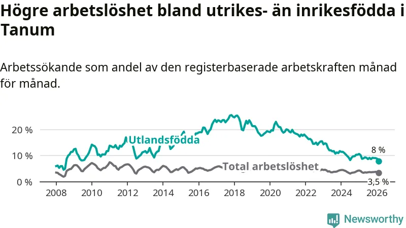 Skillnaden i arbetslöshet mellan utrikesfödda och hela befolkningen är 4,5 procentenheter i Tanum. Det är en betydligt mindre skillnad än för ett år sedan (−1,6 procentenheter).