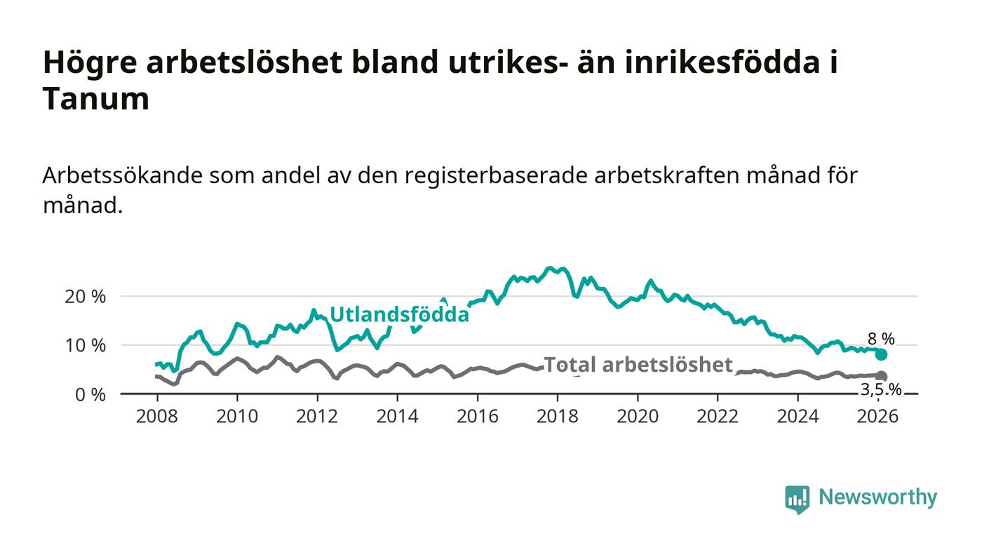 Arbetslösheten bland utlandsfödda var 8,0 procent i Tanum under februari månad, motsvarande 66 av 825 personer. Det är 2,2 procentenheter färre än vid samma tidpunkt i fjol (−17 om man räknar personer). Därmed är de utlandsföddas arbetslöshet lägre än vid samma tidpunkt i fjol för sjunde månaden i följd. Den nuvarande arbetslöshetsnivån är den lägsta sedan juli 2008.