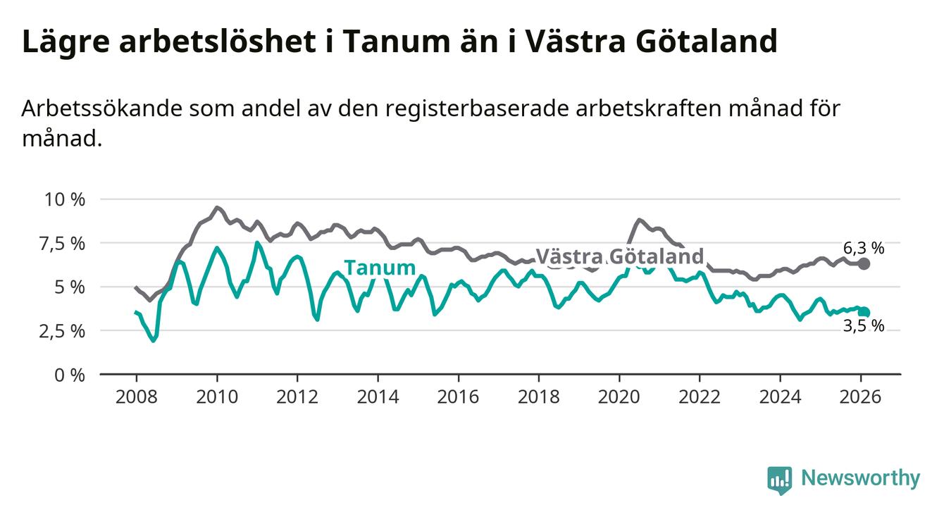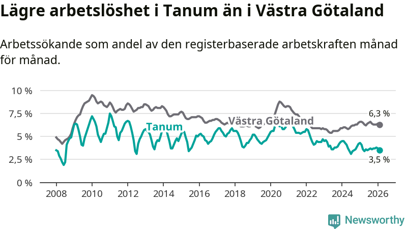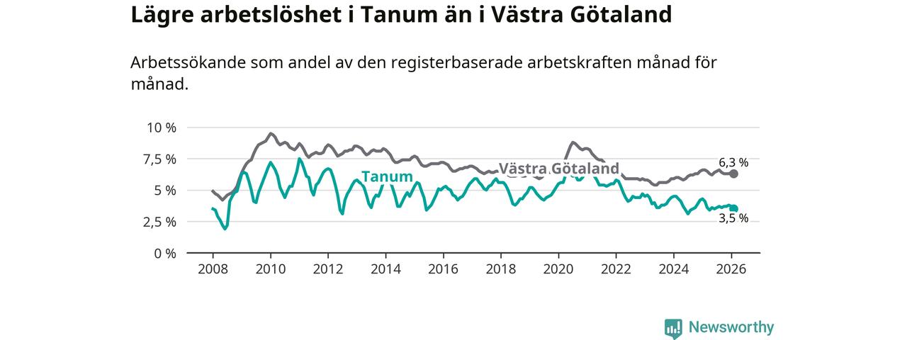Tanum hade redan tidigare lägre arbetslöshet än snittet i hela Västra Götalands län och nu växer klyftan (3,5 procent i kommunen, jämfört med 6,3 procent i hela länet). Öckerö har den lägsta arbetslösheten i länet (2,7 procent), medan Gullspång har den högsta (8,3 procent). För att Tanum skulle komma ner i samma arbetslöshetsnivå som Öckerö skulle 45 personer behöva sysselsättas.