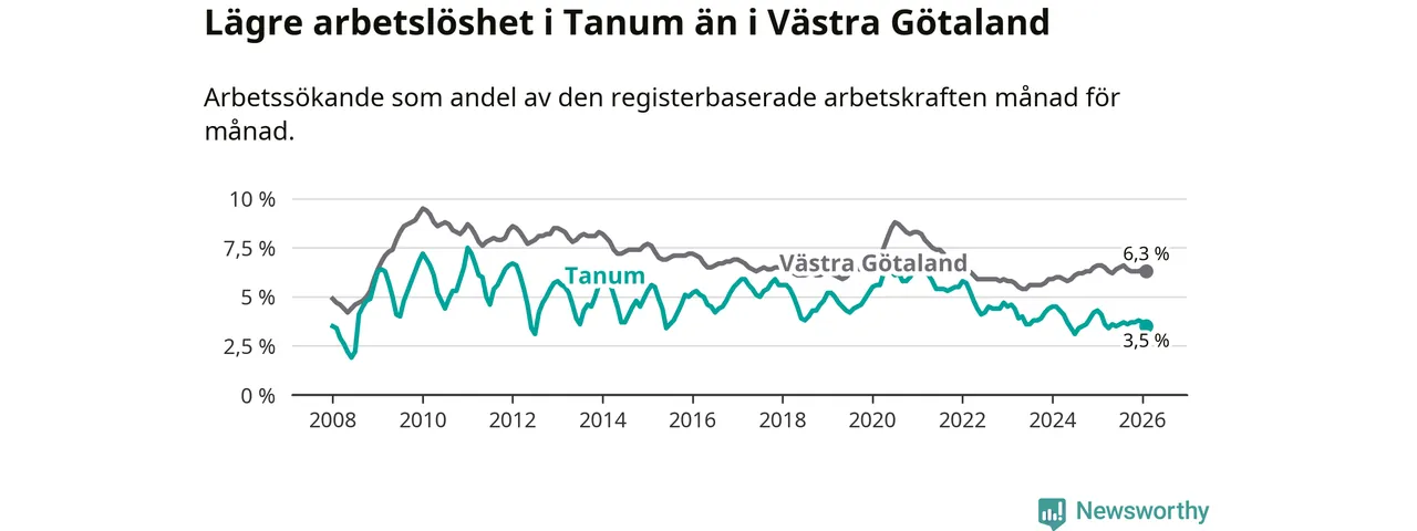 Under februari månad rapporterade Tanums kommun en total arbetslöshet på 3,5 procent. Det är en minskning jämfört med samma tidpunkt i fjol (−0,6 procentenheter). Även i Västra Götalands län sjunker arbetslösheten .