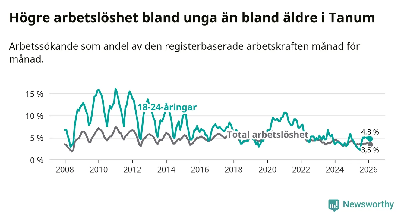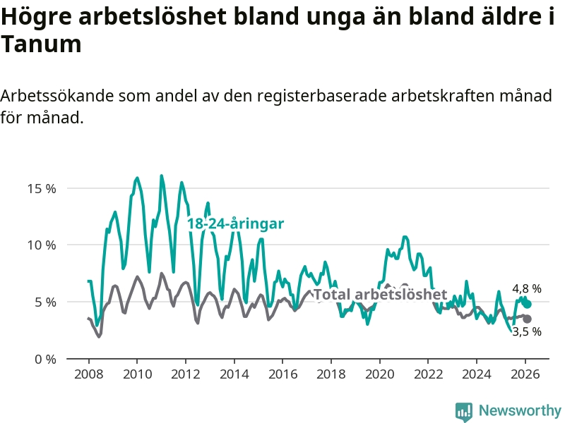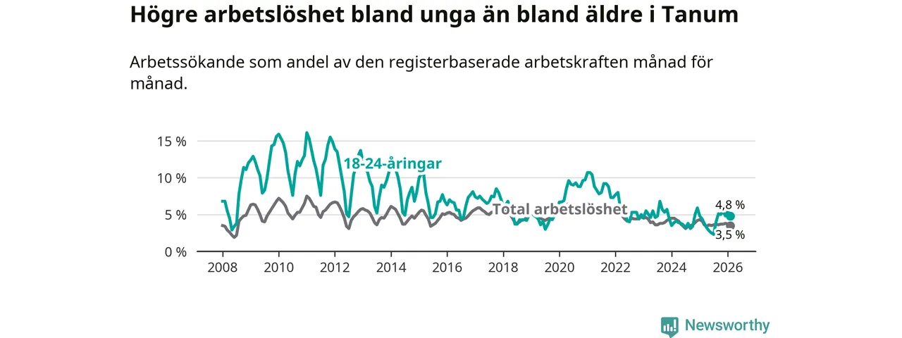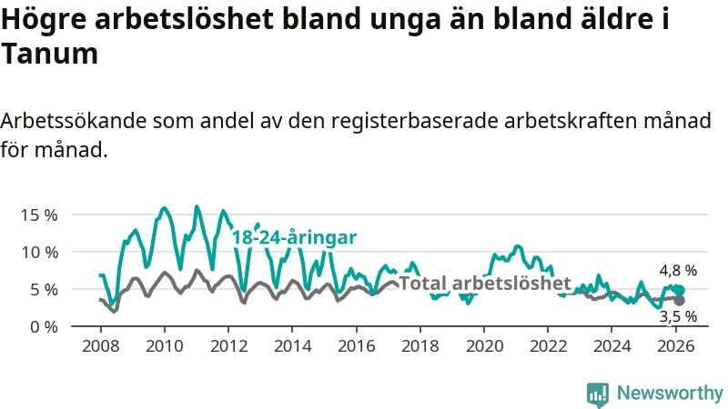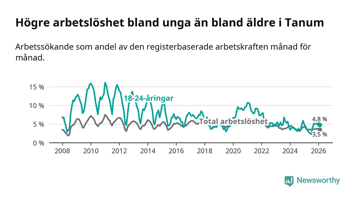 Till skillnad från den totala arbetslösheten stiger arbetslösheten bland unga (+0,4 procentenheter). I februari var 4,8 procent av 18–24-åringarna inskrivna som arbetssökande (motsvarande 25 personer). Mäter vi antalet inskrivna ser vi en ökning med två personer på ett års sikt.