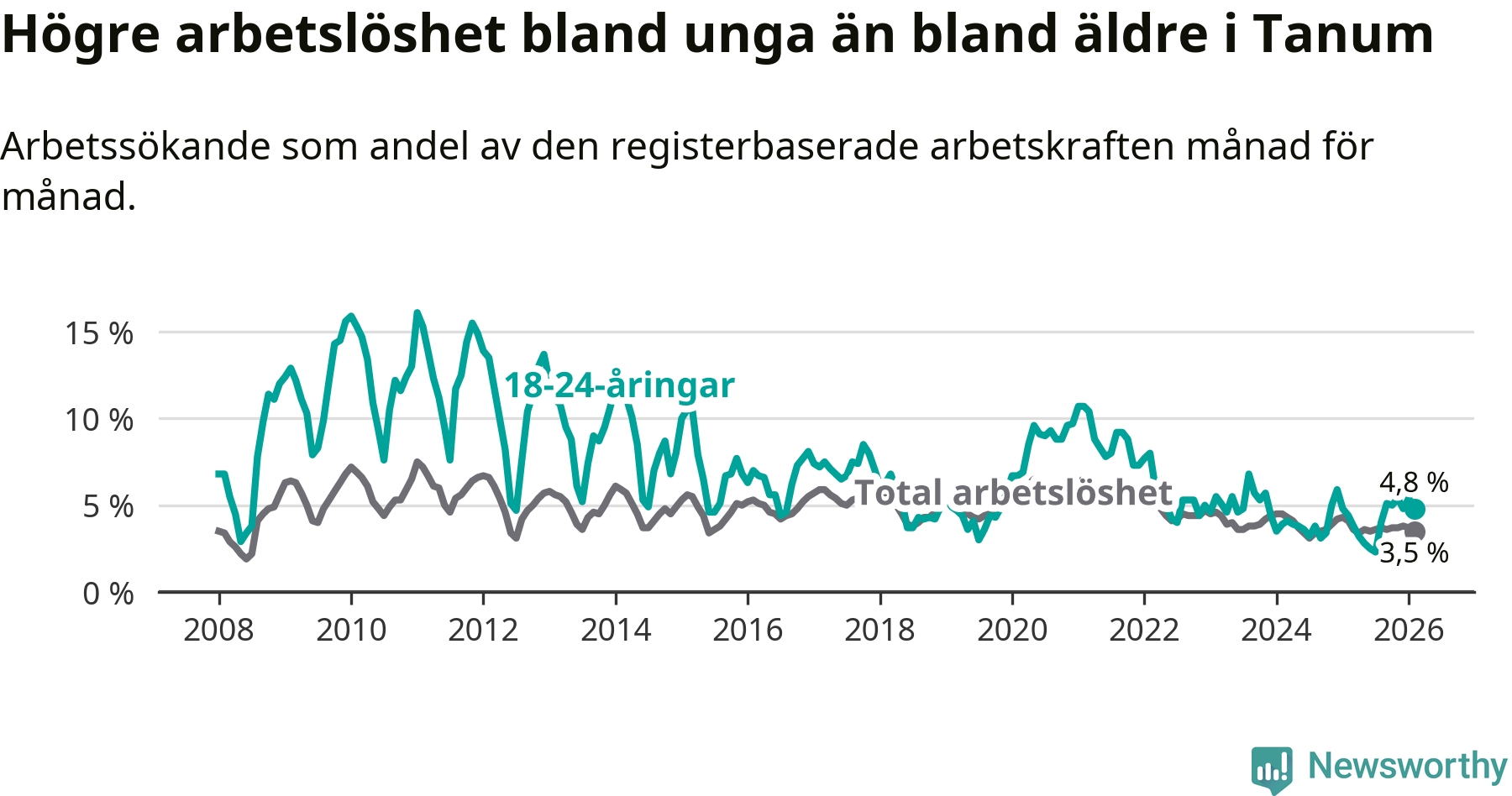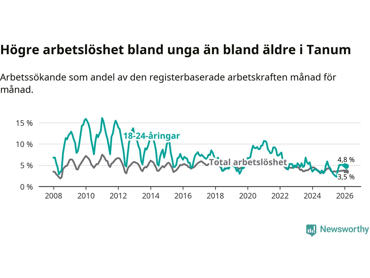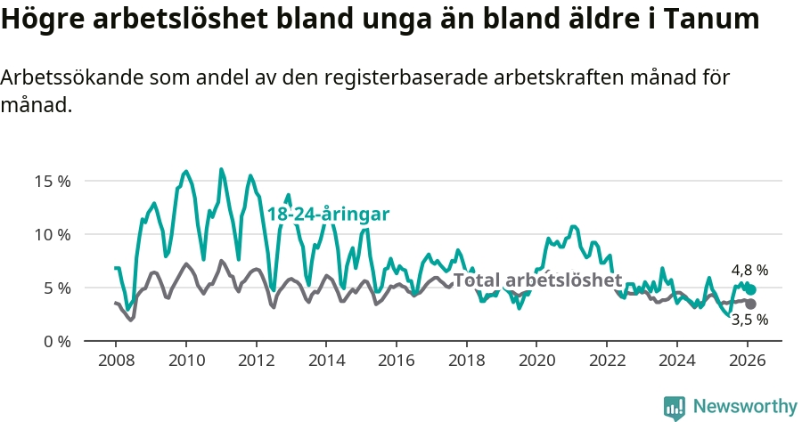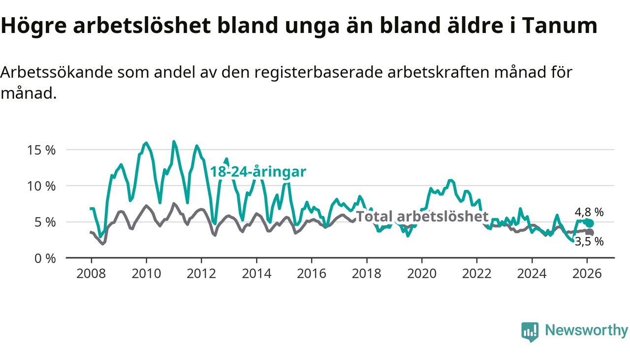 Till skillnad från den totala arbetslösheten stiger arbetslösheten bland unga (+0,4 procentenheter). I februari var 4,8 procent av 18–24-åringarna inskrivna som arbetssökande (motsvarande 25 personer). Mäter vi antalet inskrivna ser vi en ökning med två personer på ett års sikt.