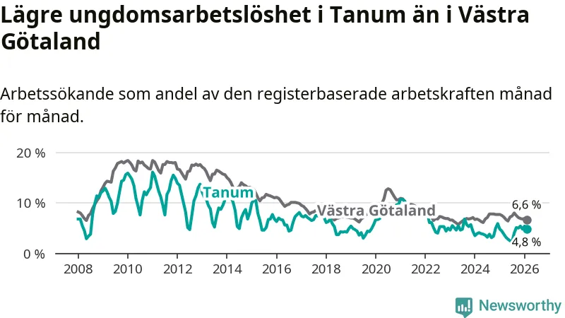 Precis som den totala arbetslösheten ligger ungdomsarbetslösheten i Tanum lägre än i Västra Götaland som helhet. Skillnaden mellan kommunen och länet är 1,8 procentenheter.