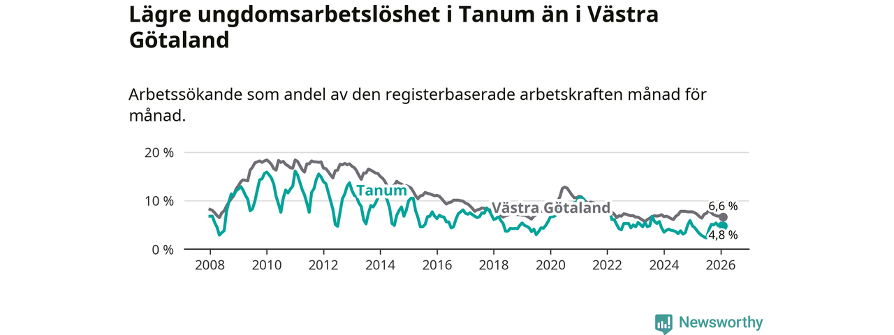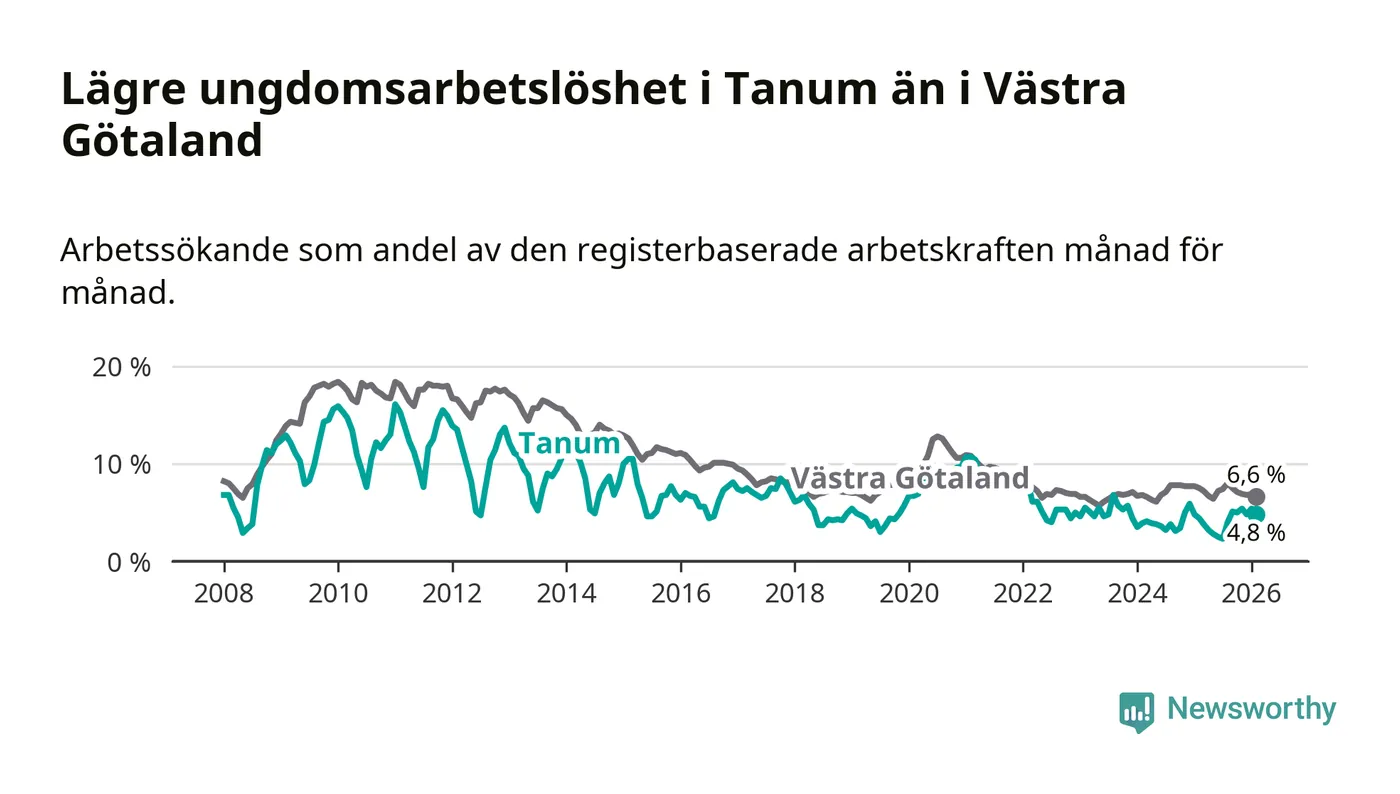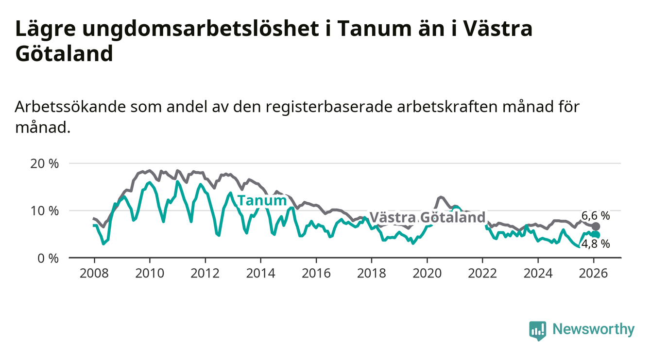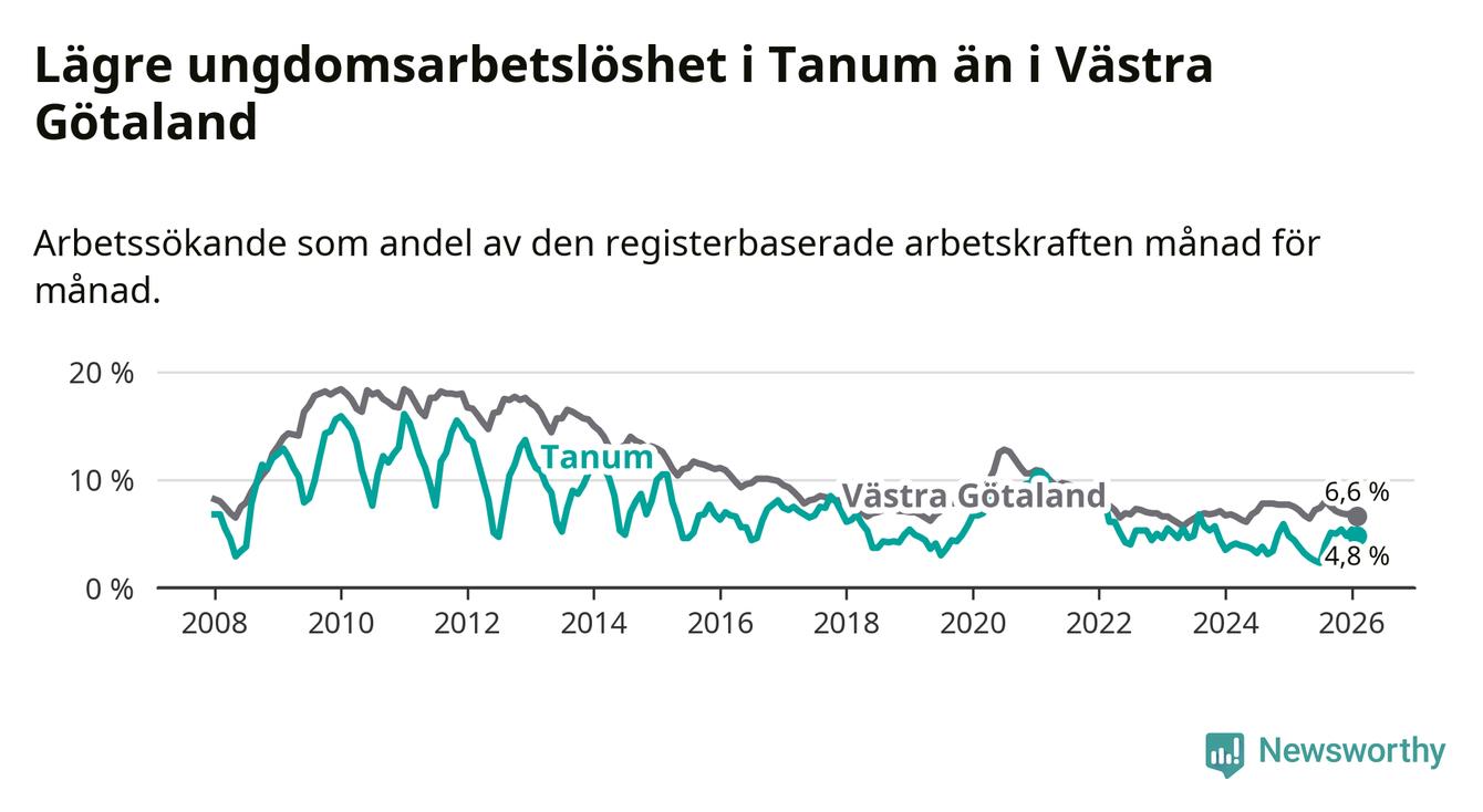 Graf: Arbetslöshet bland unga i Tanums kommun och Västra Götalands län