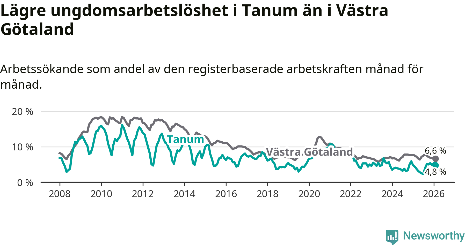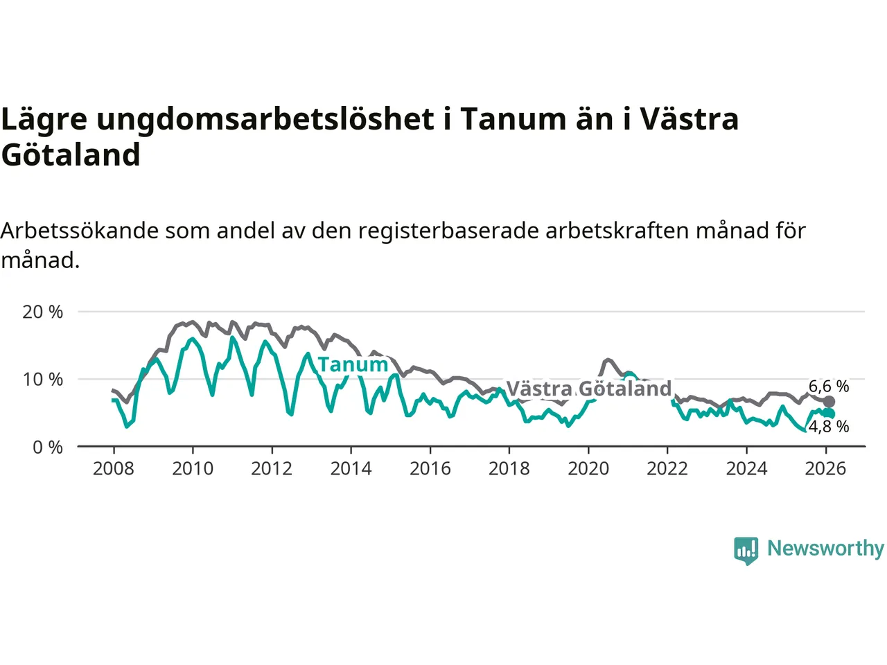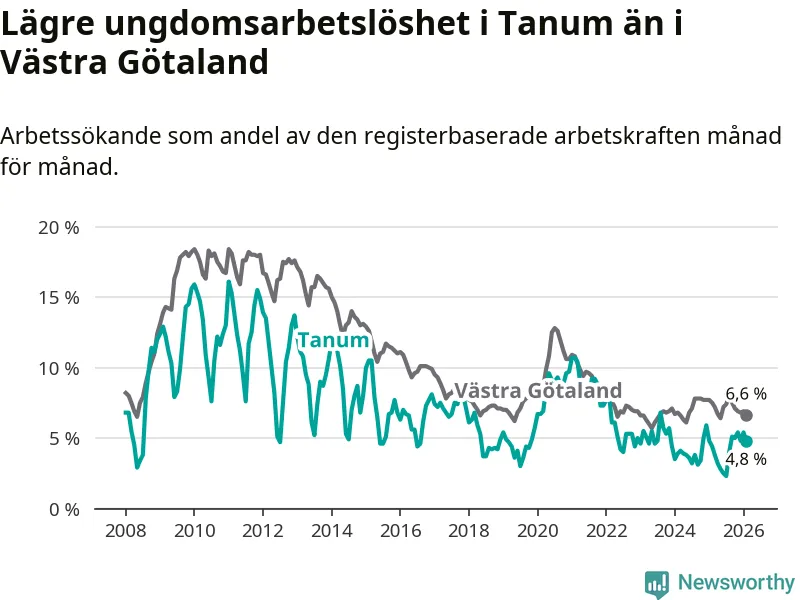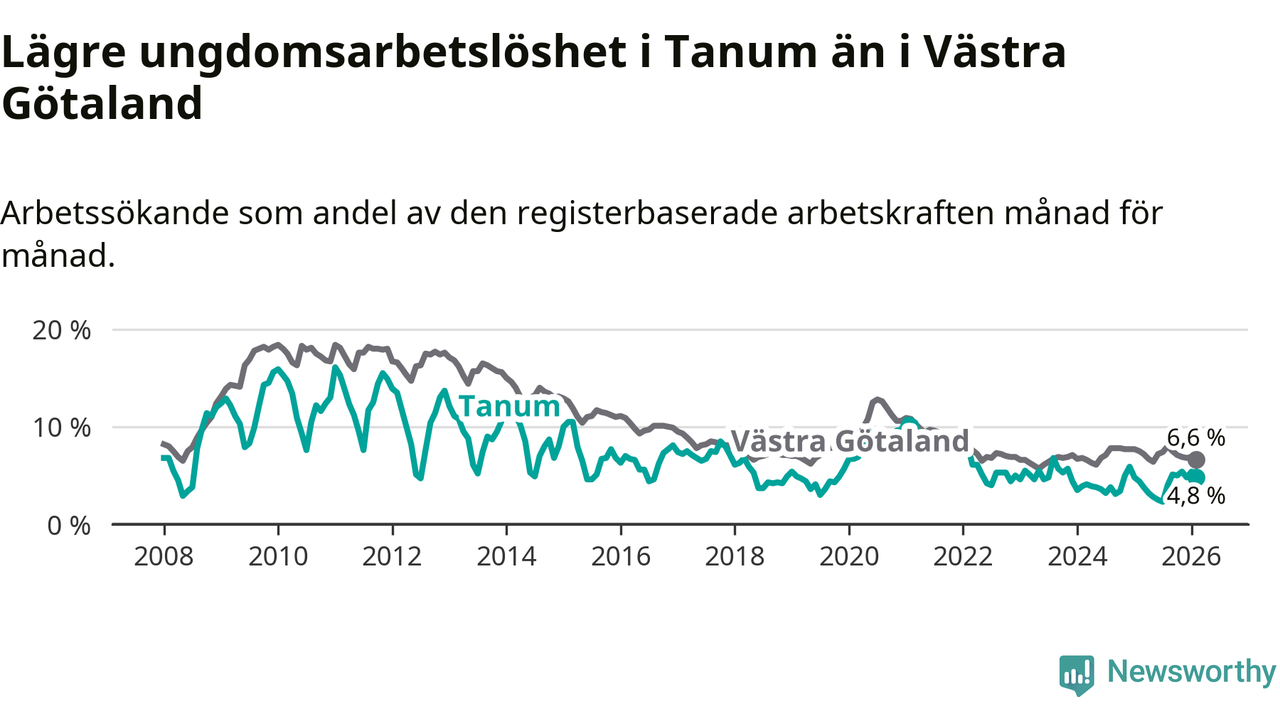 Graf: Arbetslöshet bland unga i Tanums kommun och Västra Götalands län