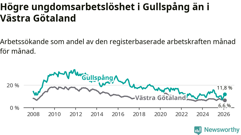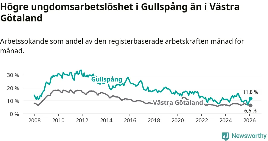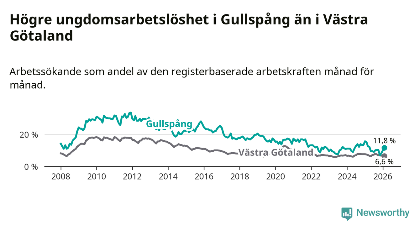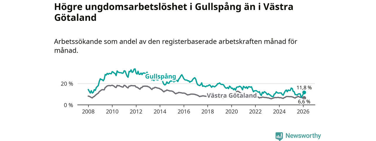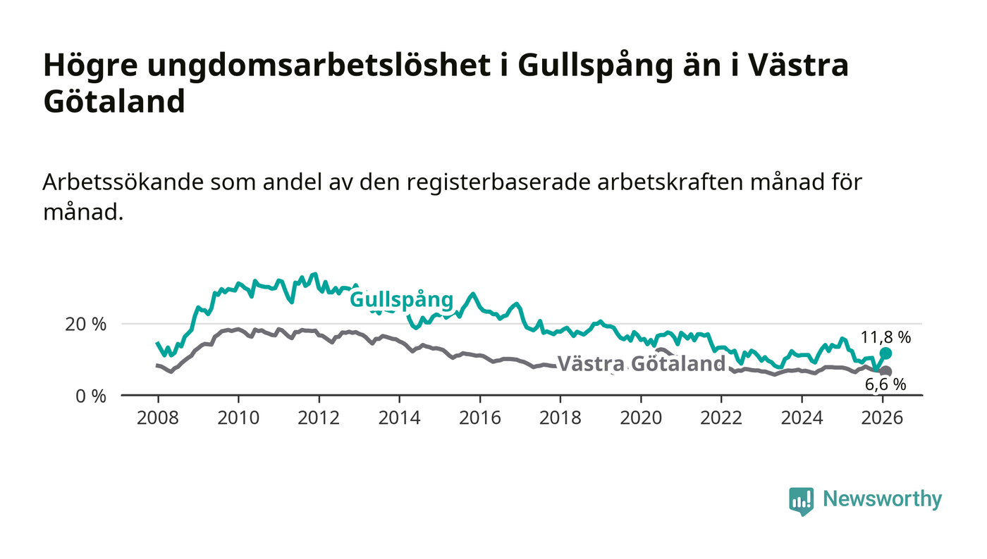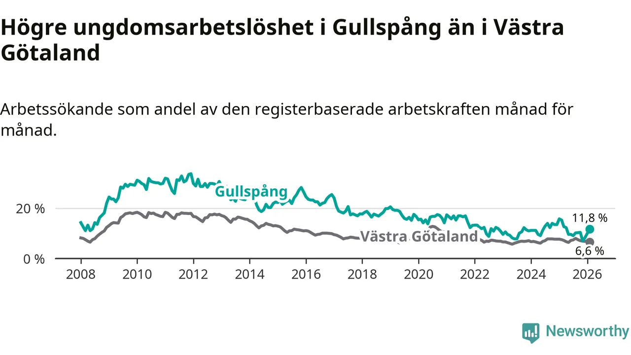 Precis som den totala arbetslösheten ligger ungdomsarbetslösheten i Gullspång högre än i Västra Götaland som helhet. Skillnaden mellan kommunen och länet är 5,2 procentenheter.