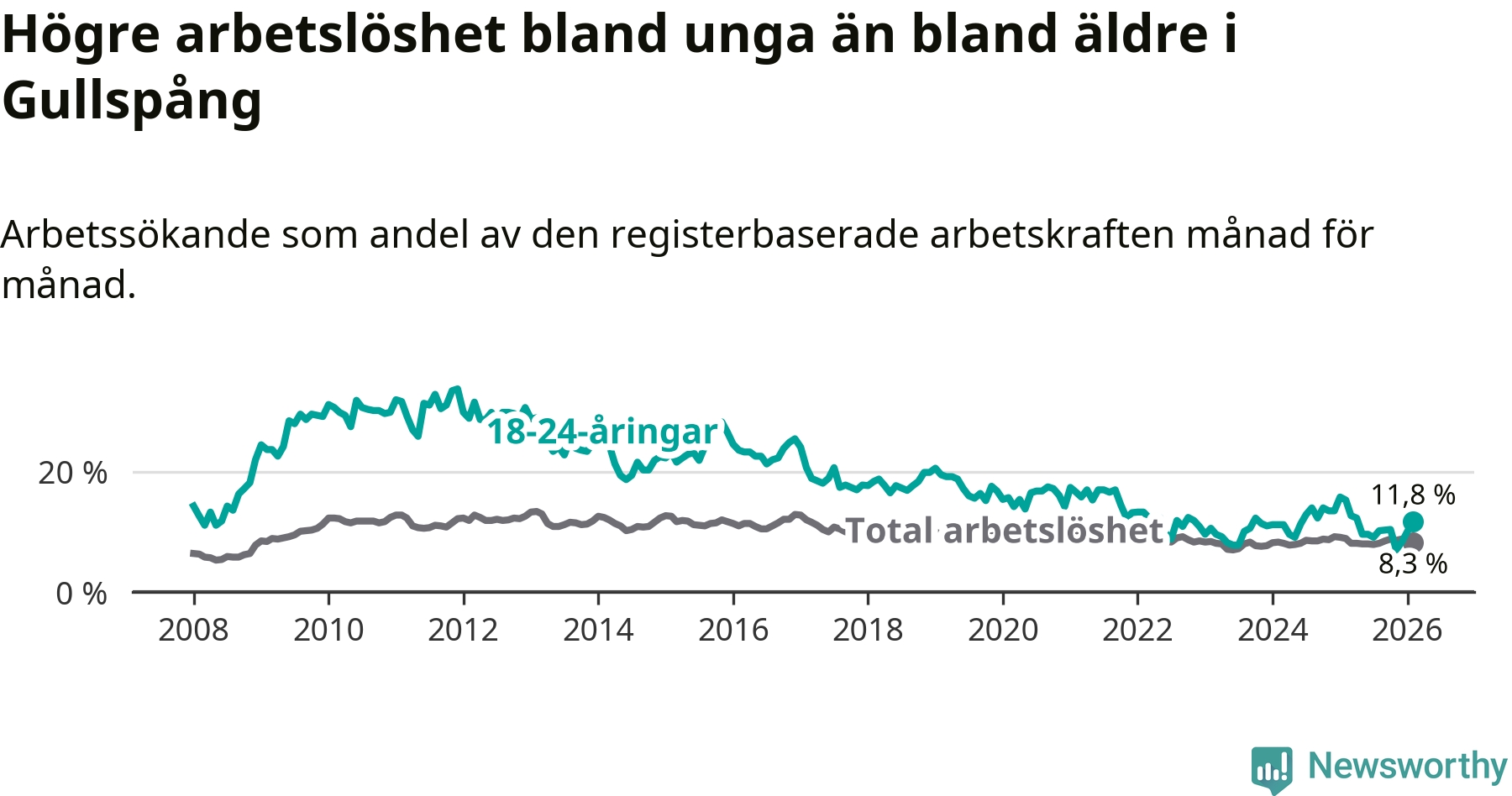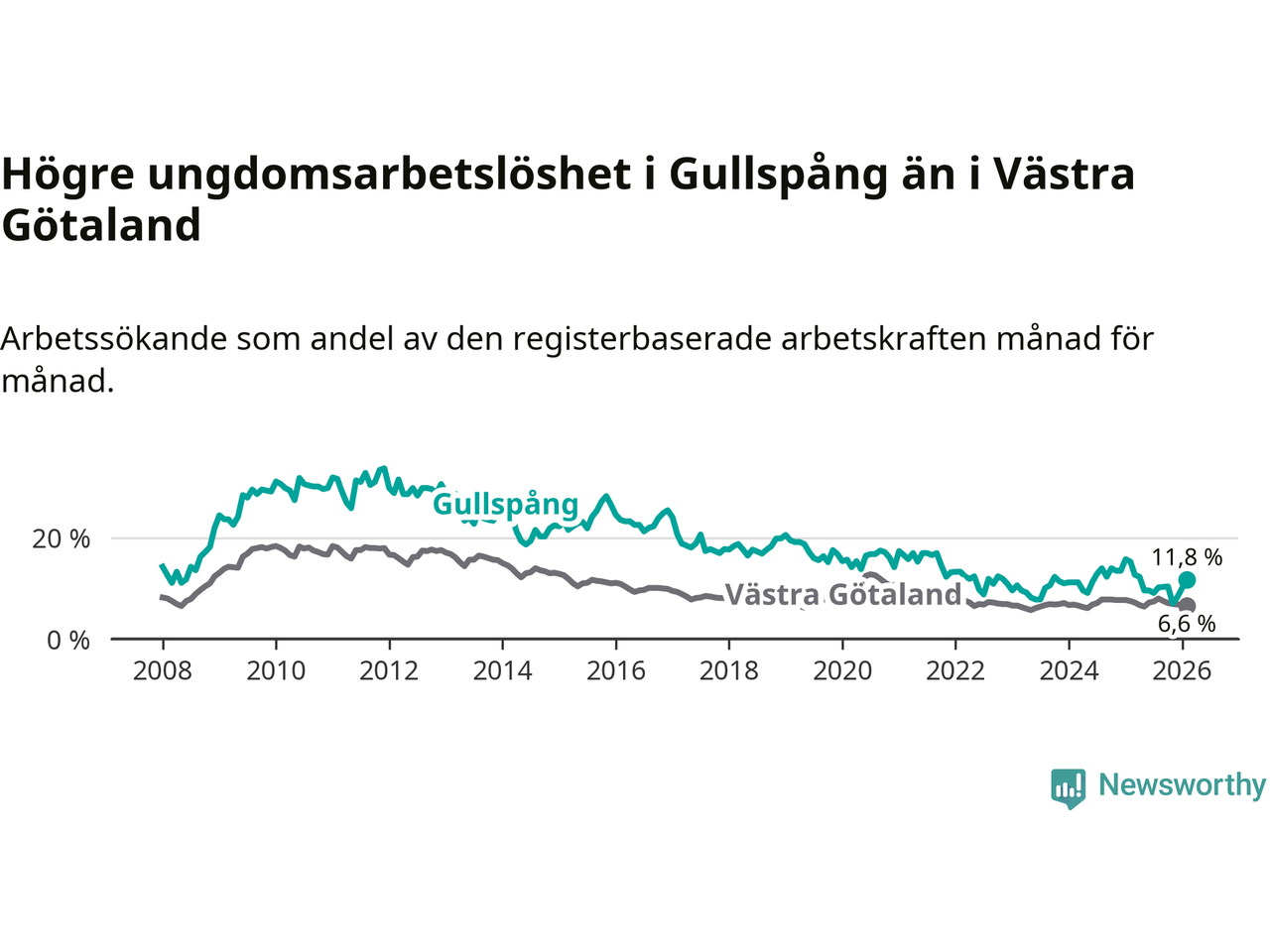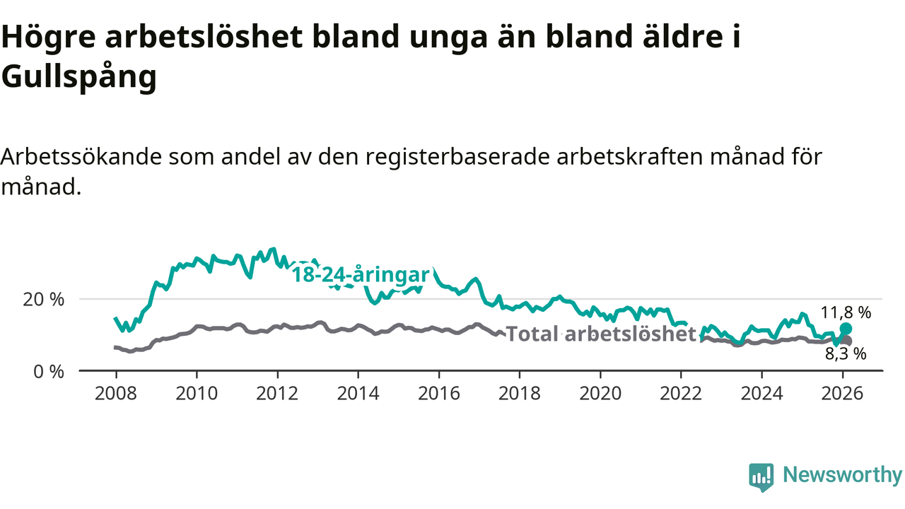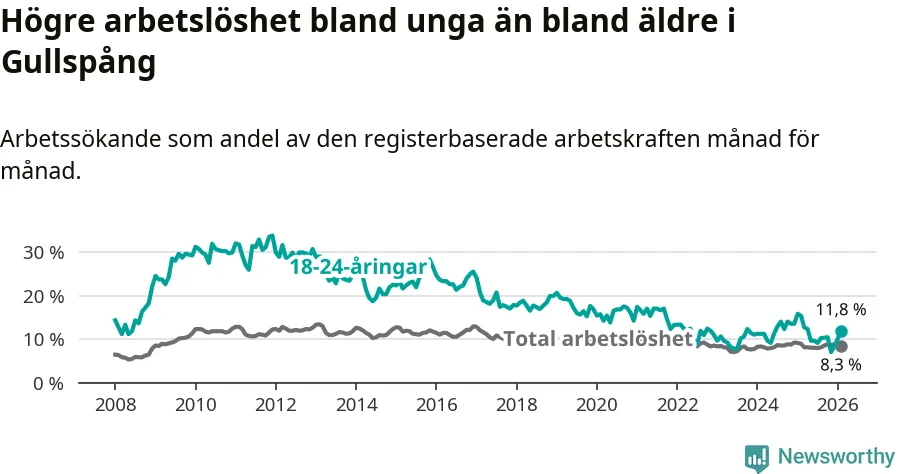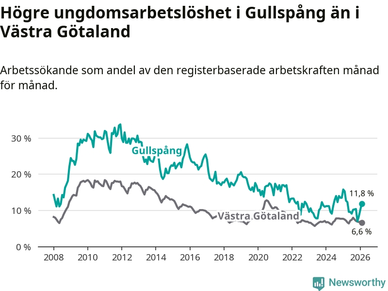 Precis som den totala arbetslösheten ligger ungdomsarbetslösheten i Gullspång högre än i Västra Götaland som helhet. Skillnaden mellan kommunen och länet är 5,2 procentenheter.