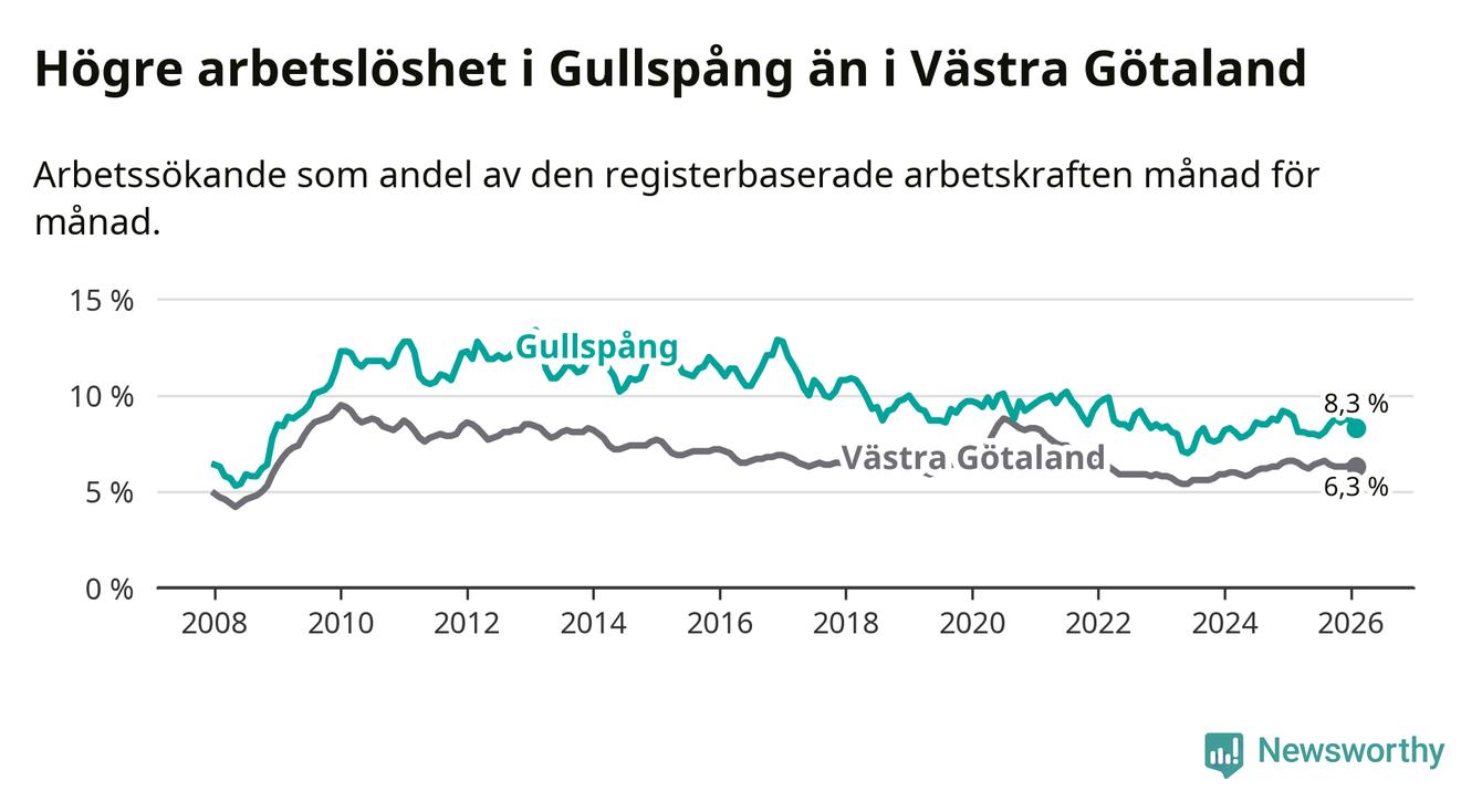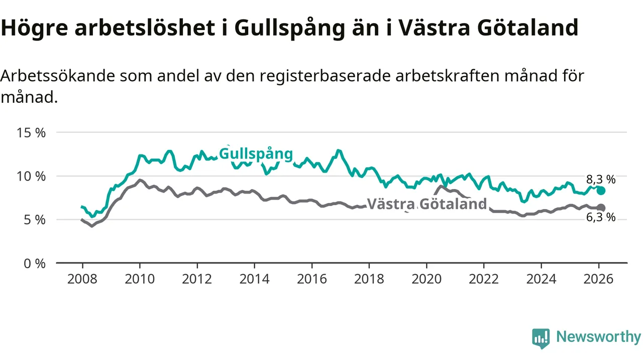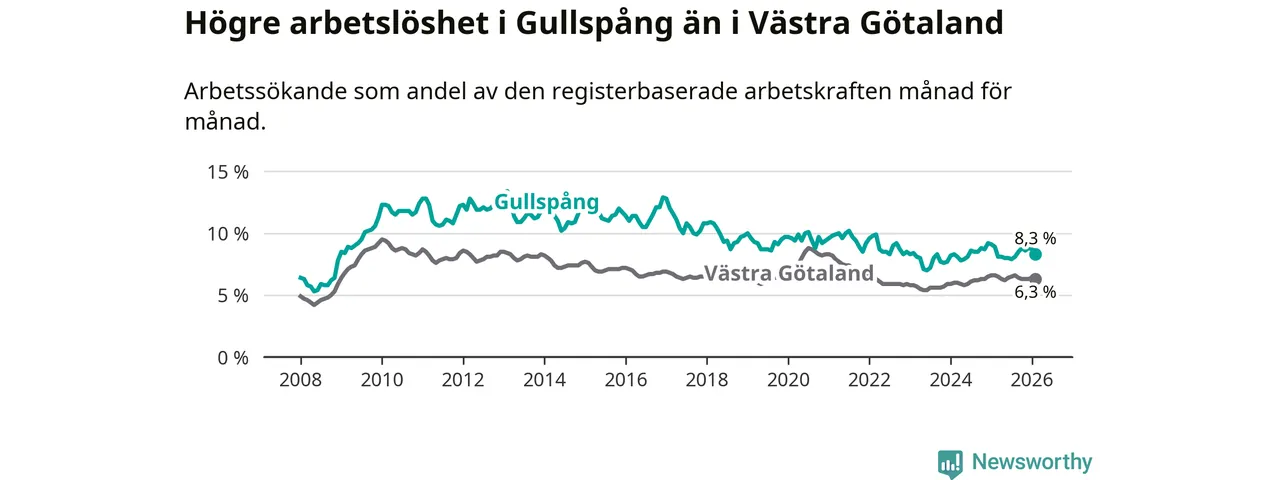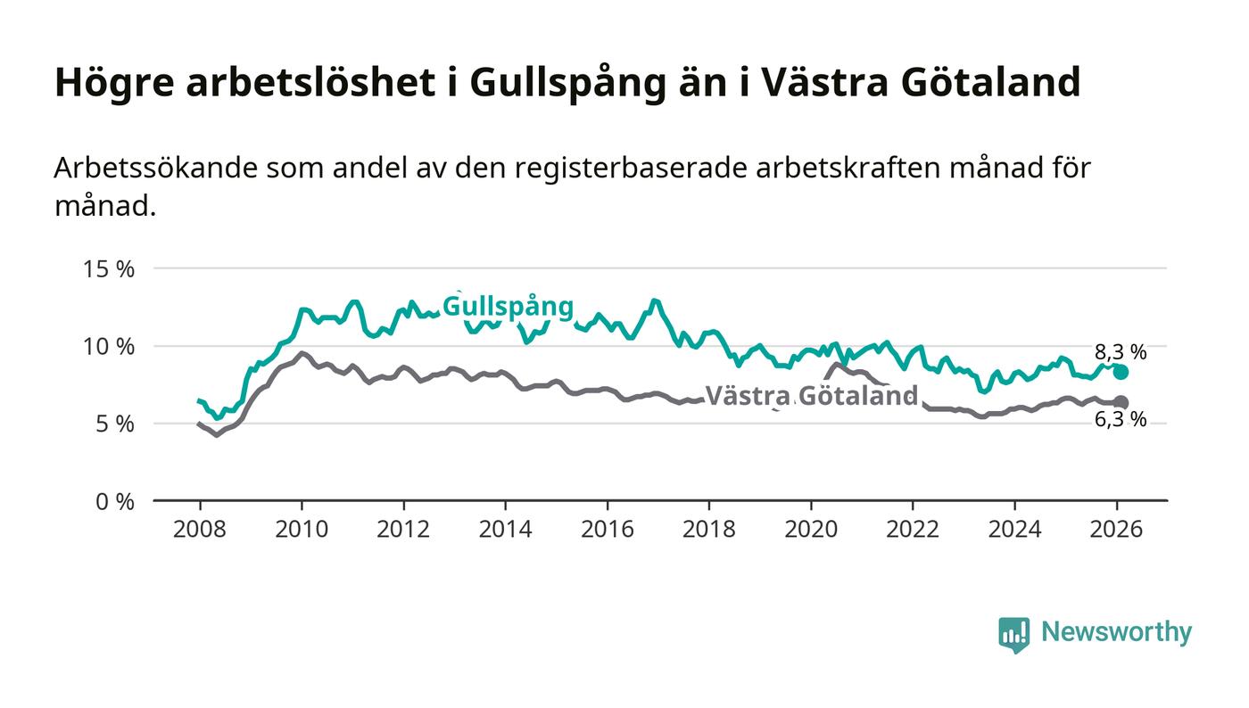 Under februari månad rapporterade Gullspångs kommun en total arbetslöshet på 8,3 procent. Det är en minskning jämfört med samma tidpunkt i fjol (−0,6 procentenheter). Även i Västra Götalands län sjunker arbetslösheten .