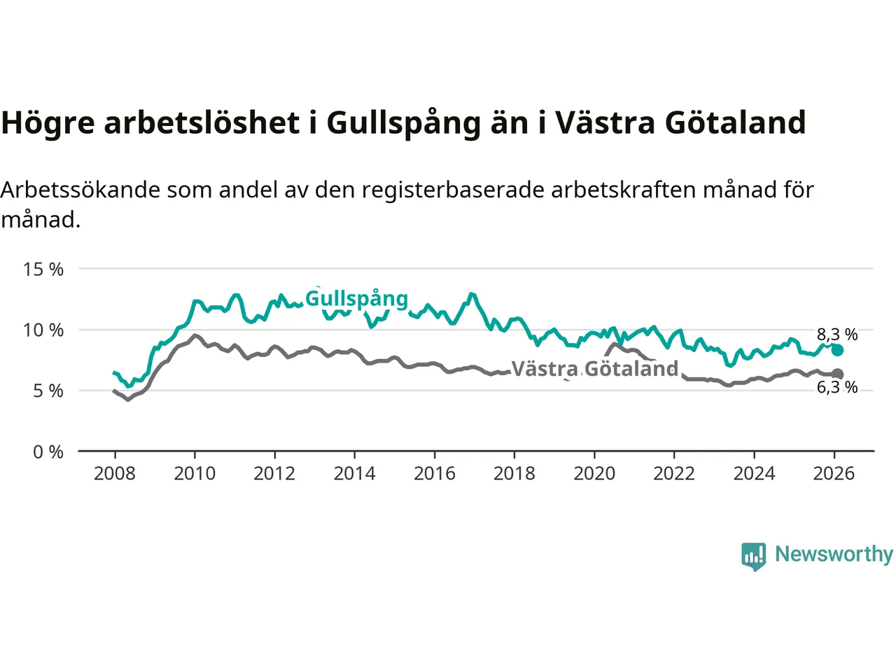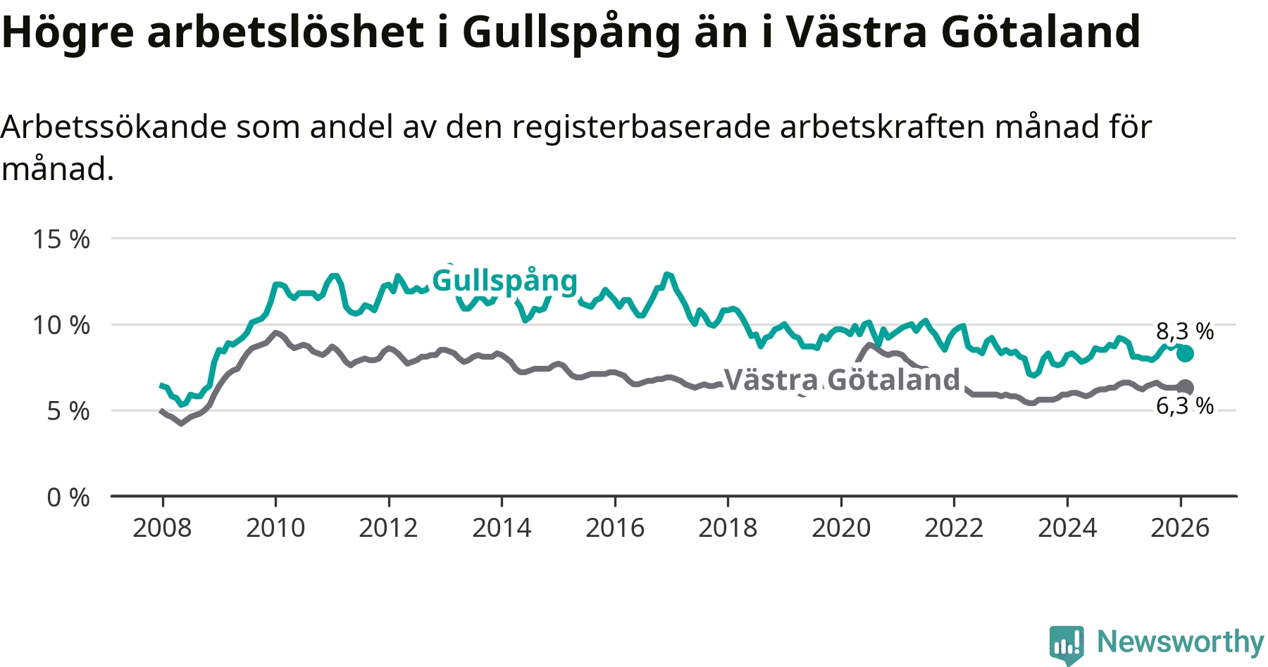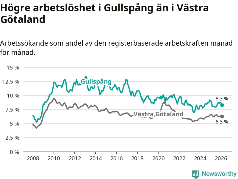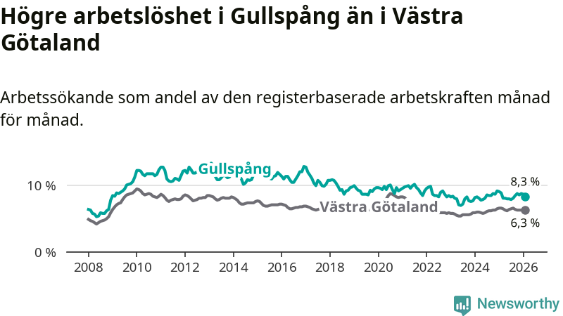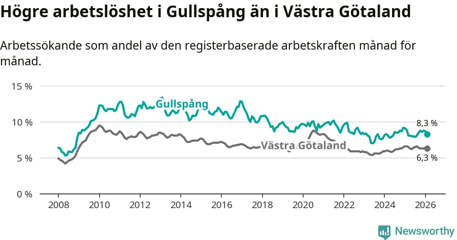 Under februari månad rapporterade Gullspångs kommun en total arbetslöshet på 8,3 procent. Det är en minskning jämfört med samma tidpunkt i fjol (−0,6 procentenheter). Även i Västra Götalands län sjunker arbetslösheten .