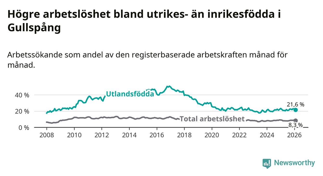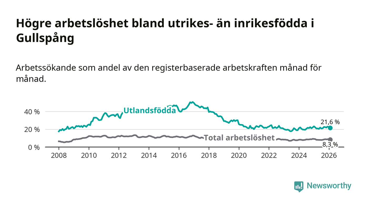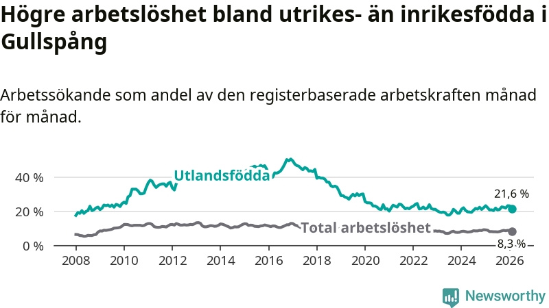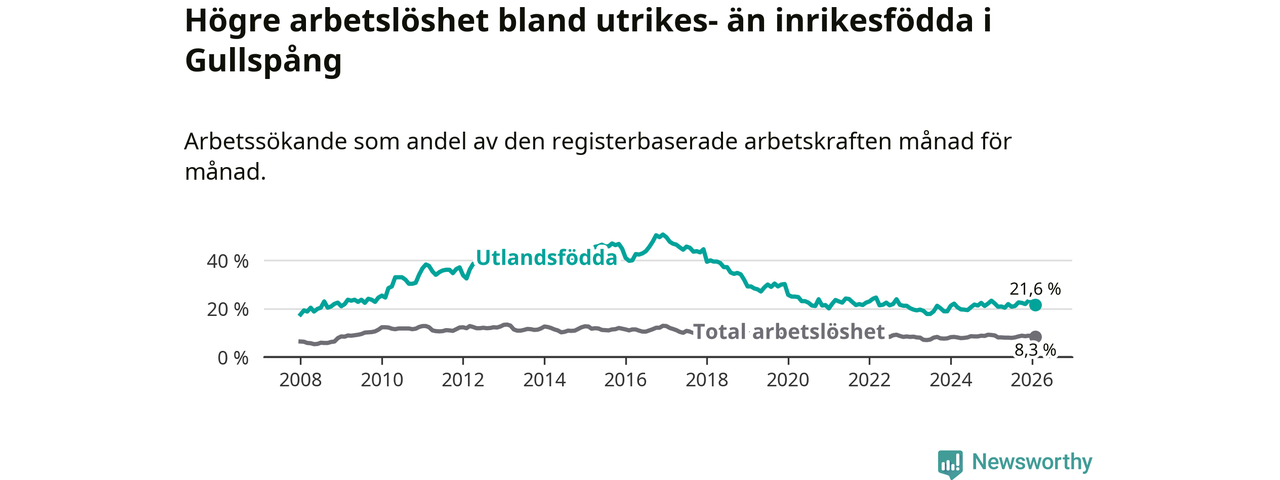 Arbetslösheten bland utlandsfödda var 21,6 procent i Gullspång under februari månad, motsvarande 81 av 375 personer. Det är 0,5 procentenheter färre än vid samma tidpunkt i fjol (−2 om man räknar personer).