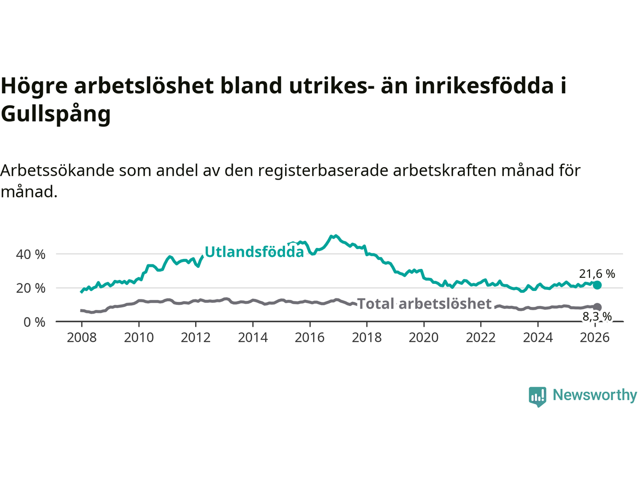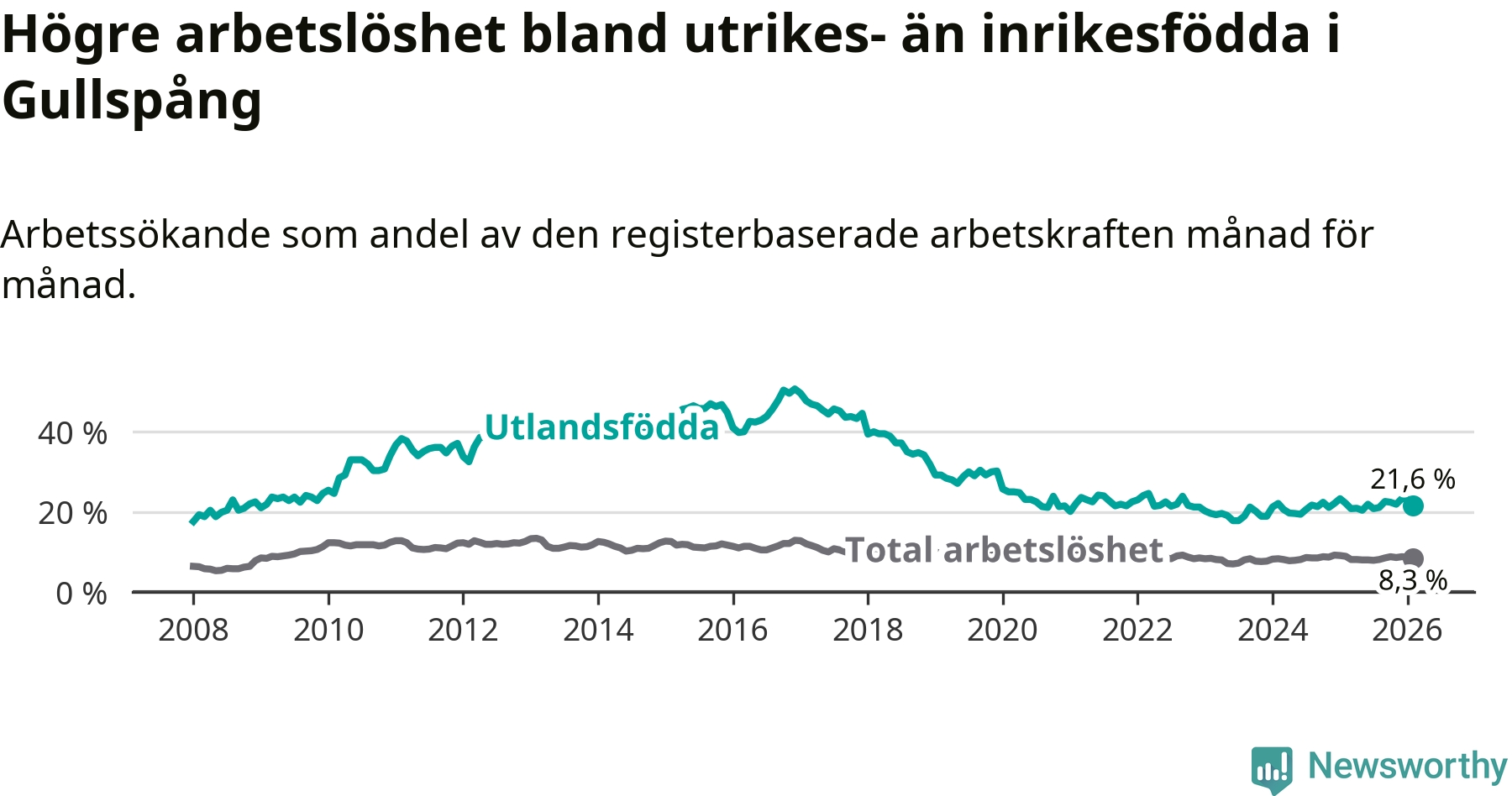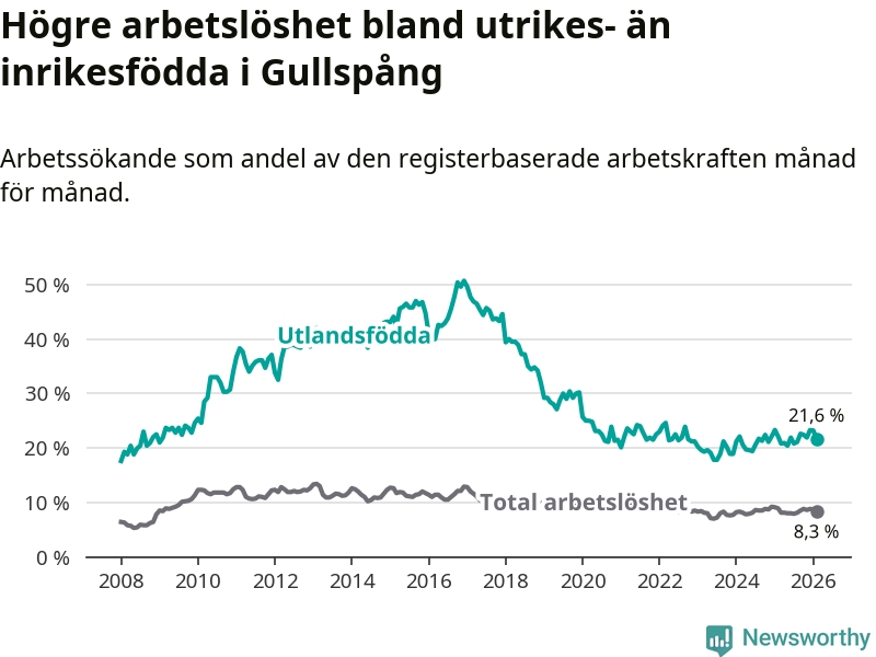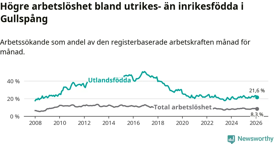 Arbetslösheten bland utlandsfödda var 21,6 procent i Gullspång under februari månad, motsvarande 81 av 375 personer. Det är 0,5 procentenheter färre än vid samma tidpunkt i fjol (−2 om man räknar personer).