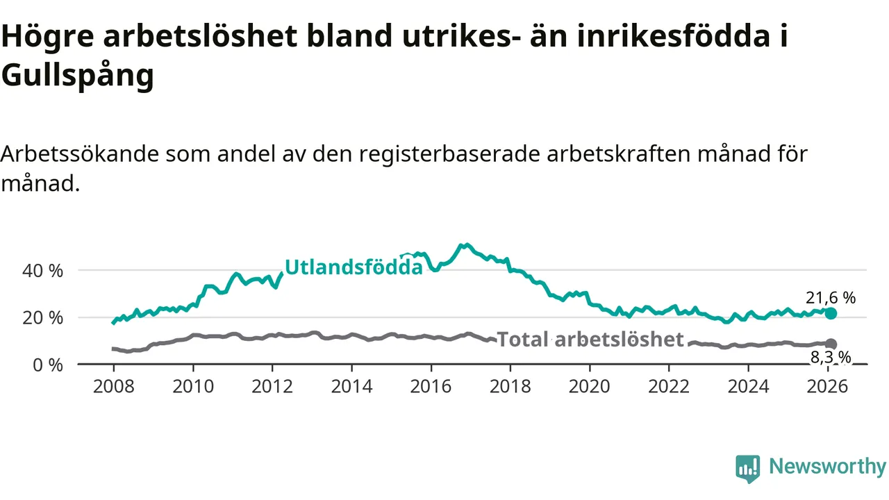 Skillnaden i arbetslöshet mellan utrikesfödda och hela befolkningen är 13,3 procentenheter i Gullspång.