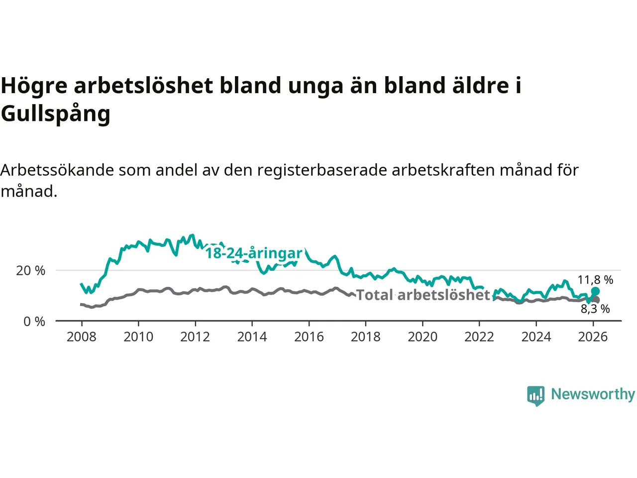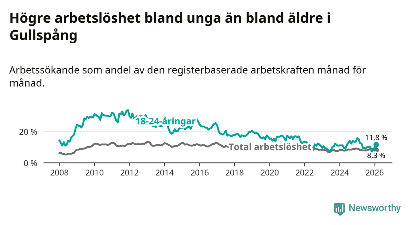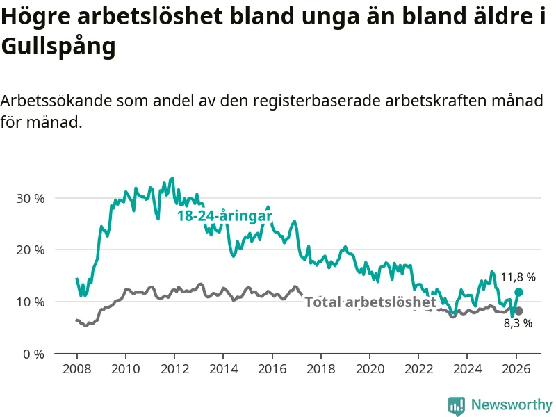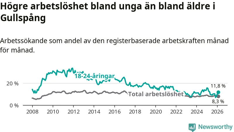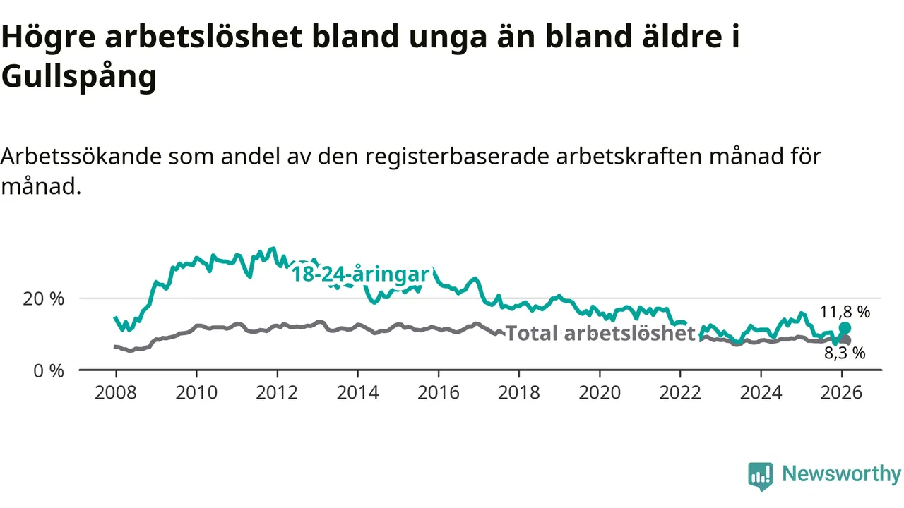 I och med den senaste månadens nedgång har de ungas arbetslöshet i Gullspång sjunkit nio månader i följd (ner från 9,6 procent i maj 2025 till 11,8 procent nu).