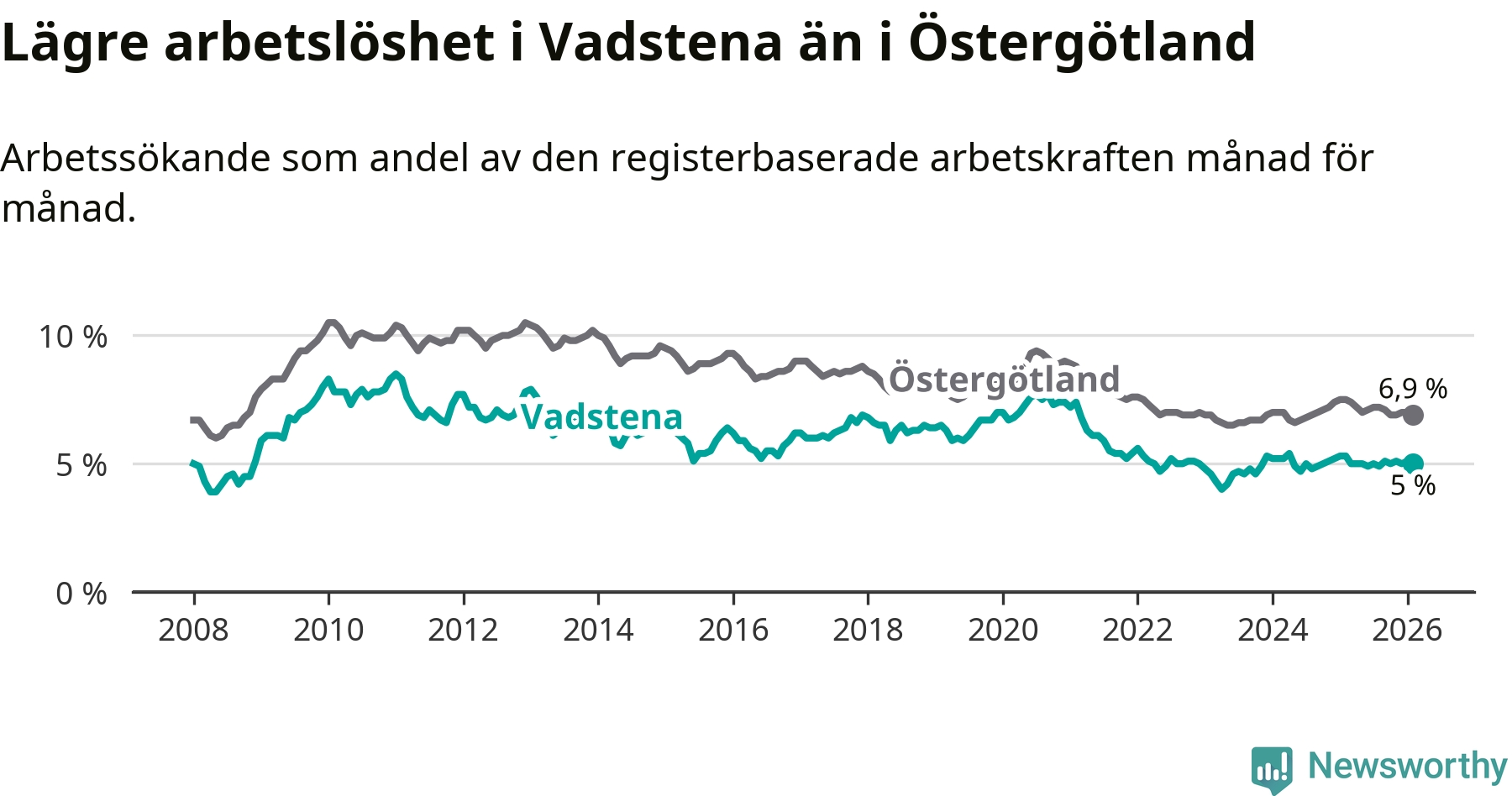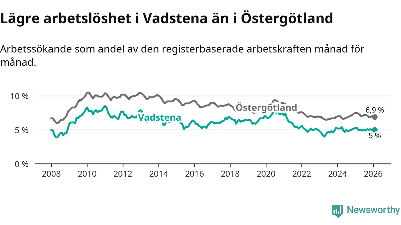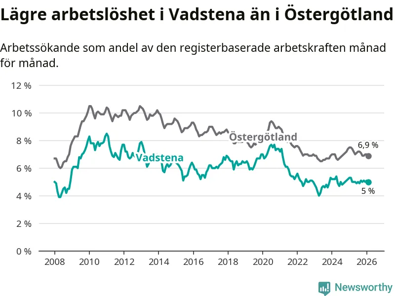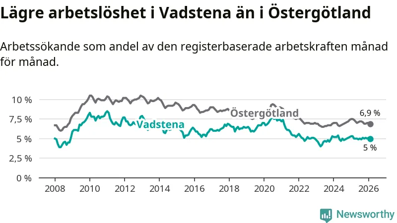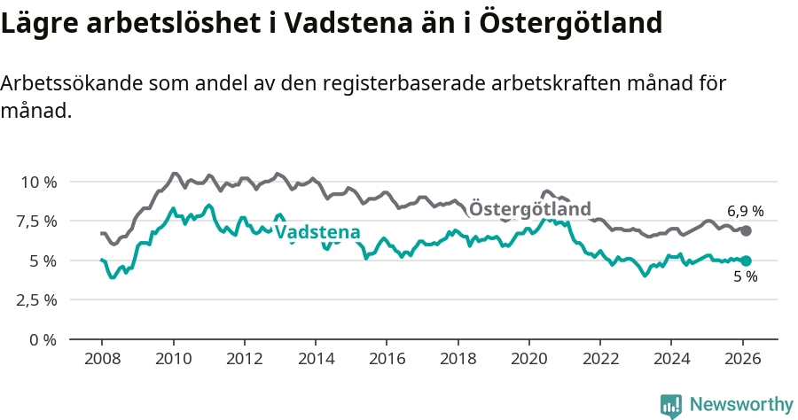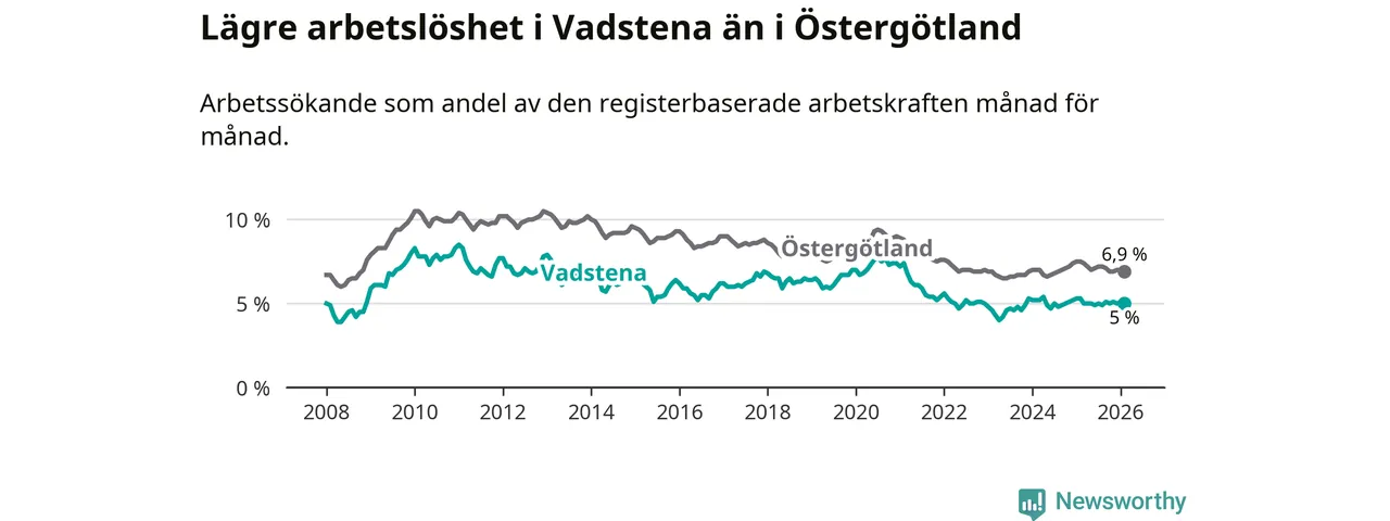 Under februari månad rapporterade Vadstena kommun en total arbetslöshet på 5,0 procent. Det är en minskning jämfört med samma tidpunkt i fjol (−0,3 procentenheter). Även i Östergötlands län sjunker arbetslösheten .