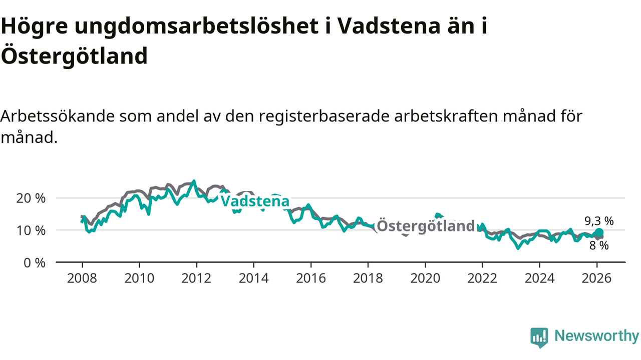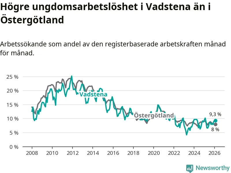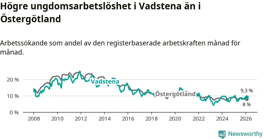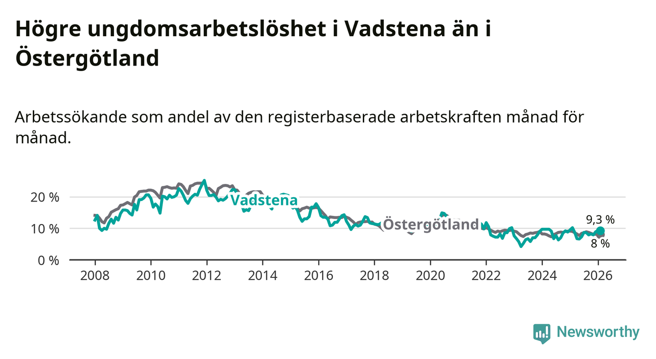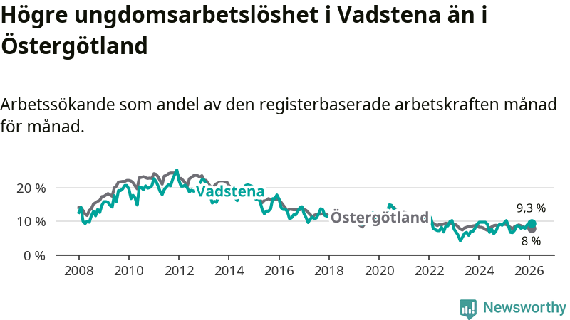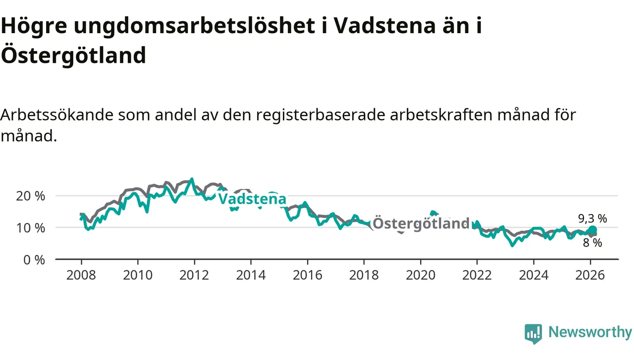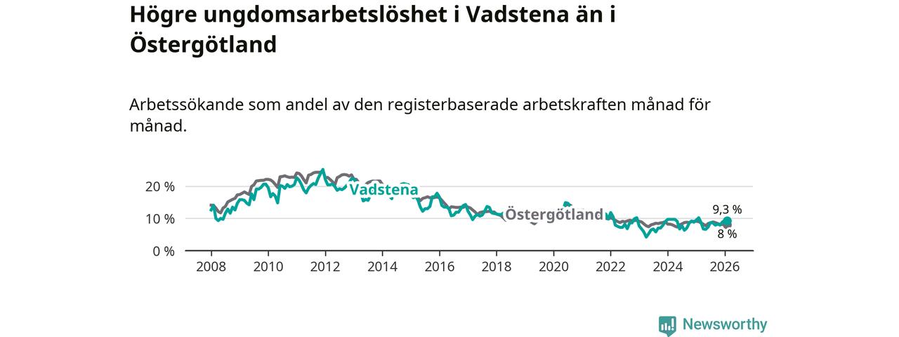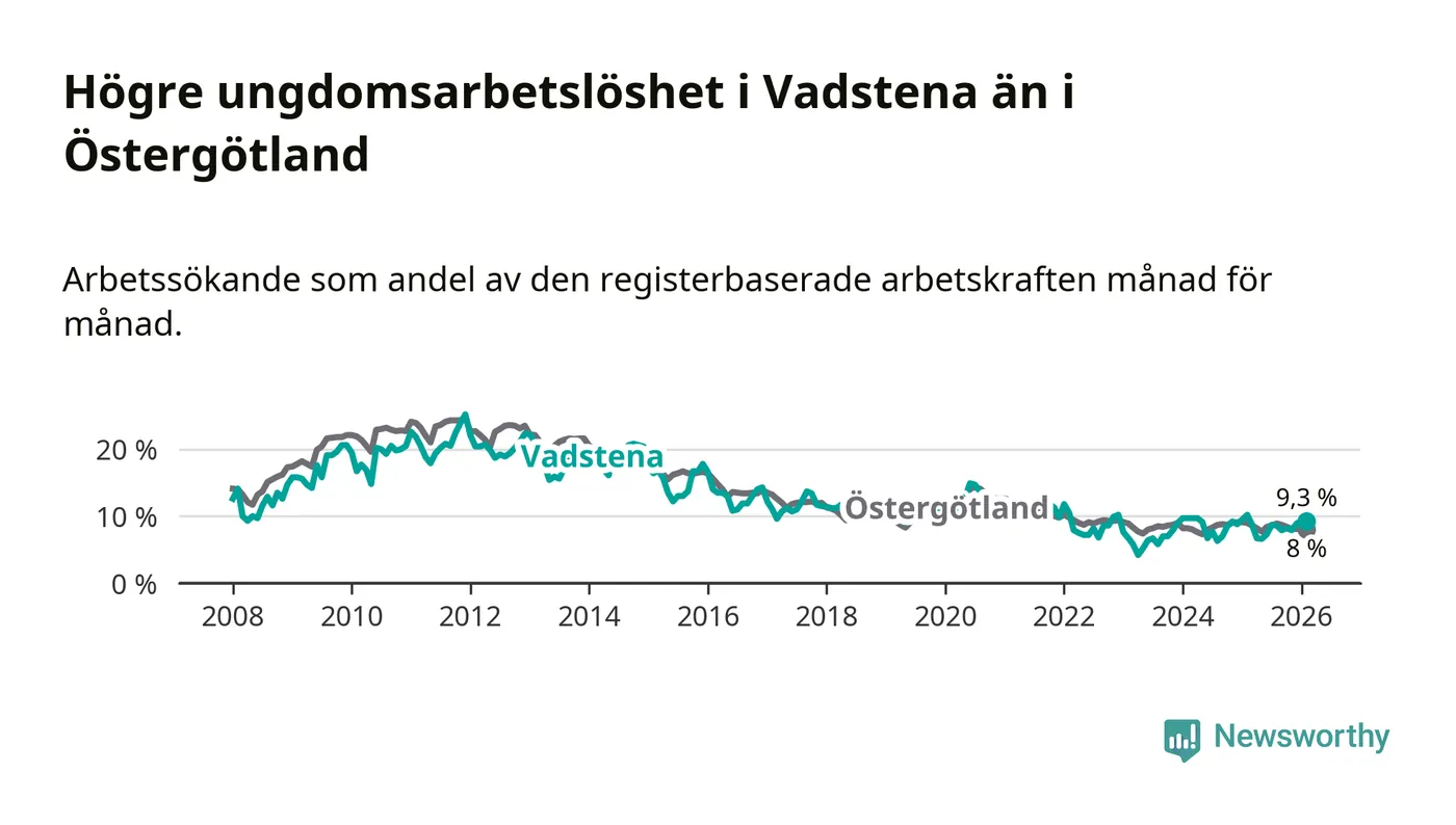 Medan Vadstena har lägre total arbetslöshet än Östergötland, ligger ungdomsarbetslösheten 1,3 procentenheter högre i Vadstena.