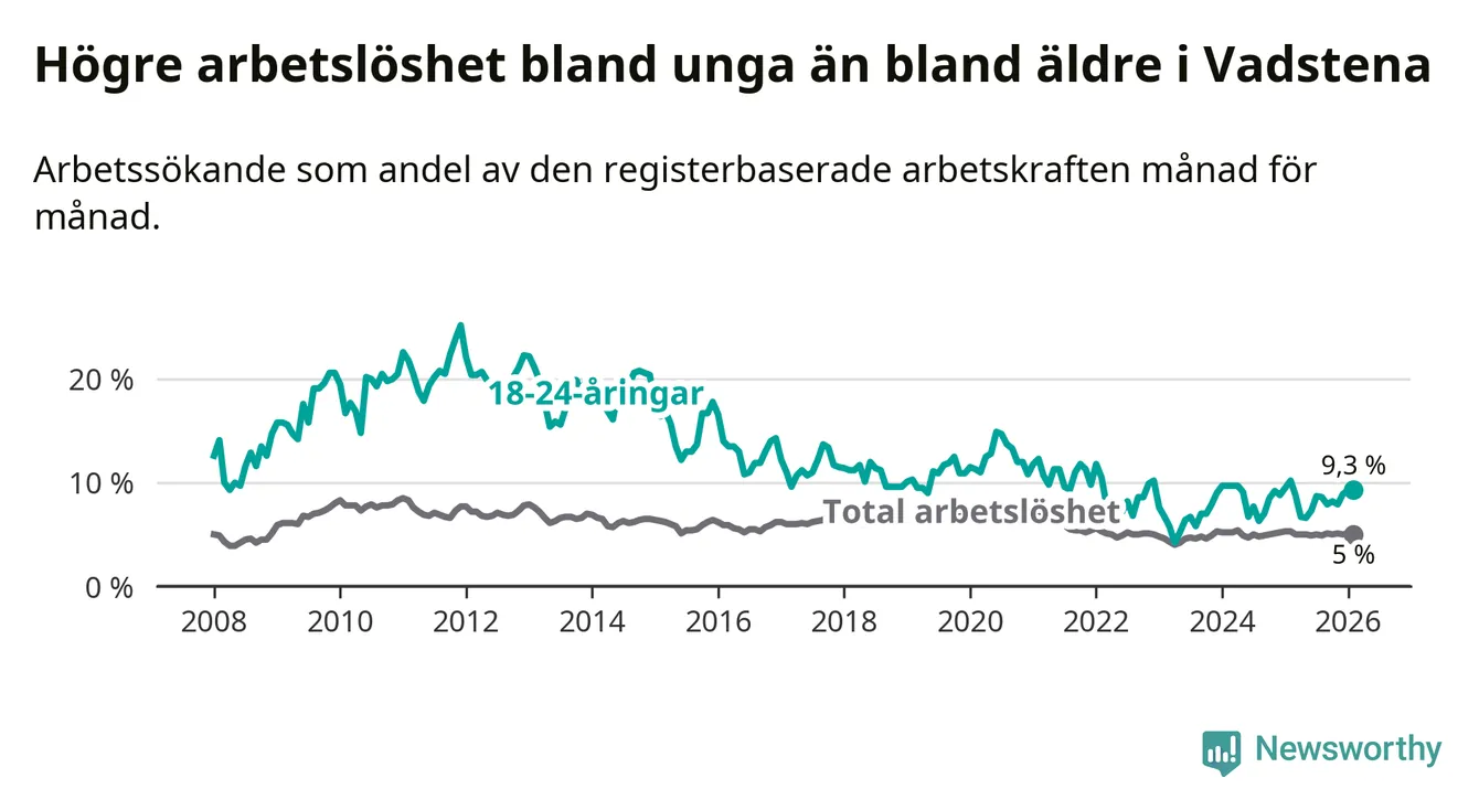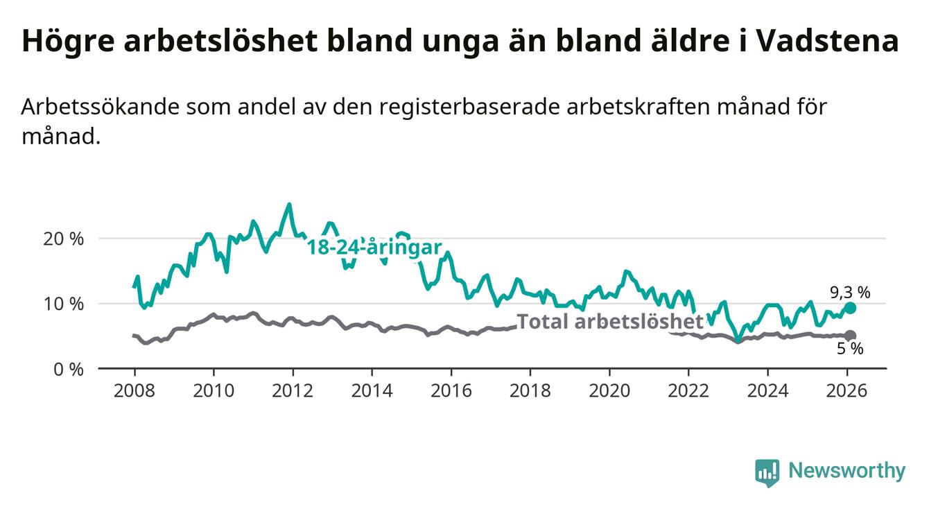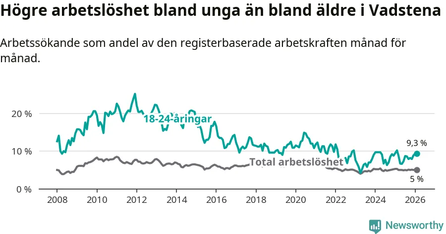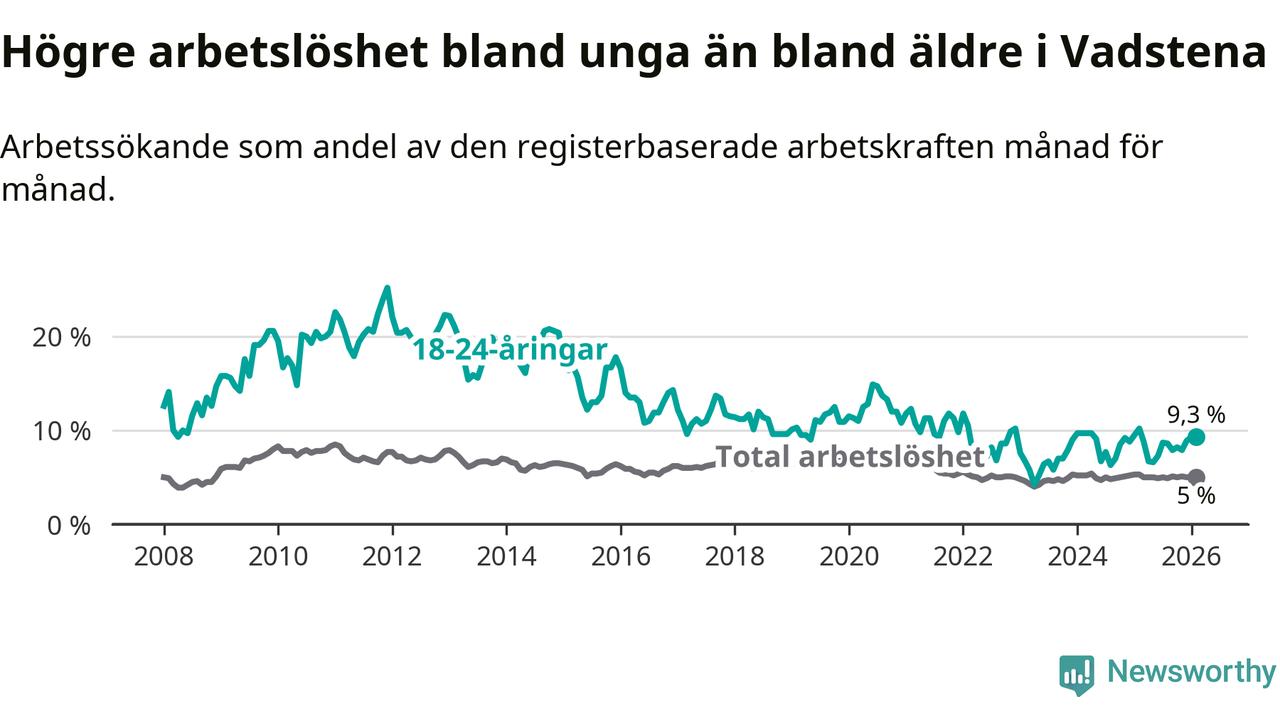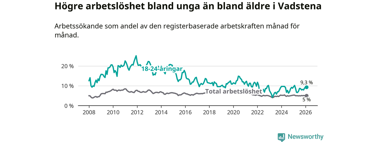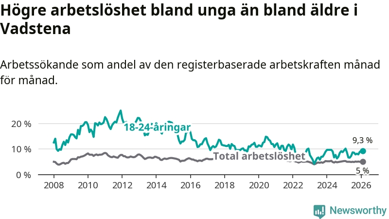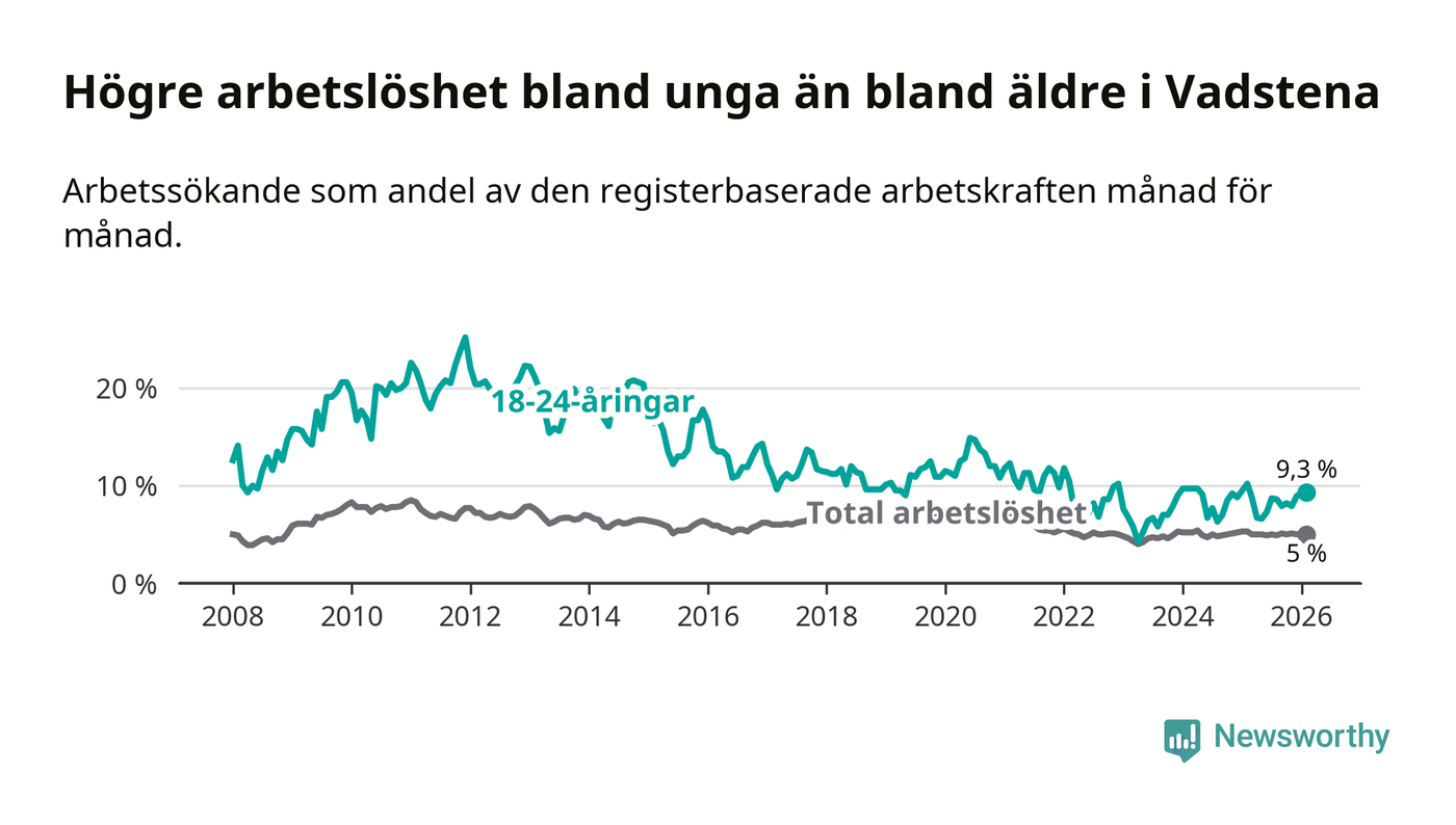Medan Vadstena har lägre total arbetslöshet än Östergötland, ligger ungdomsarbetslösheten 1,3 procentenheter högre i Vadstena.