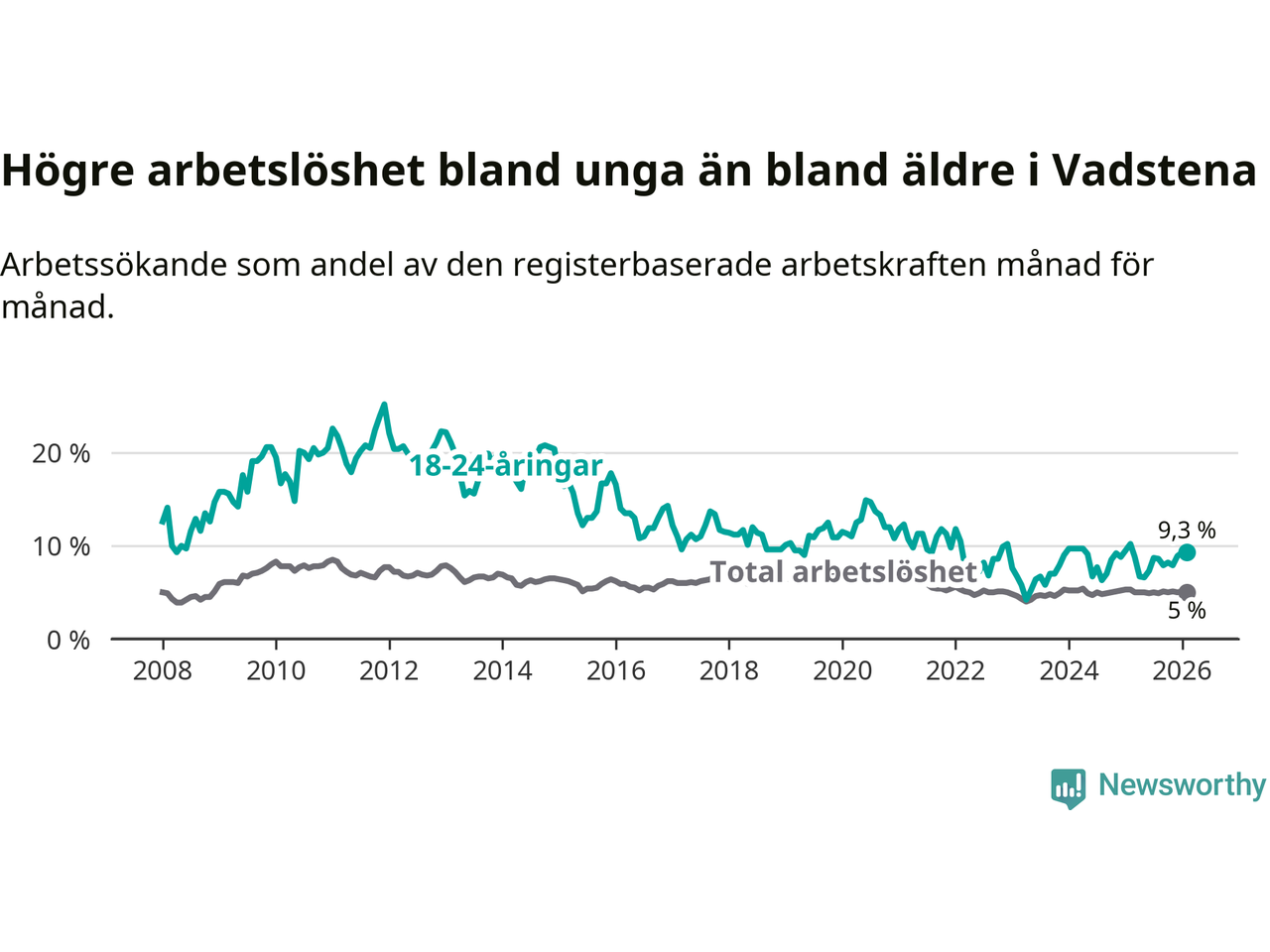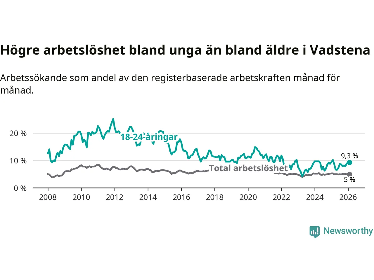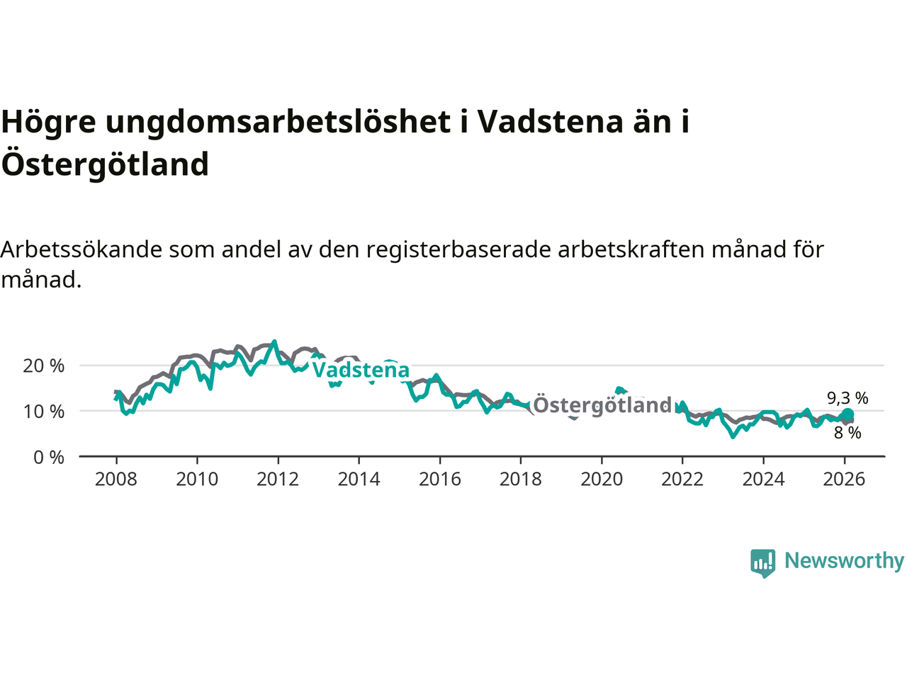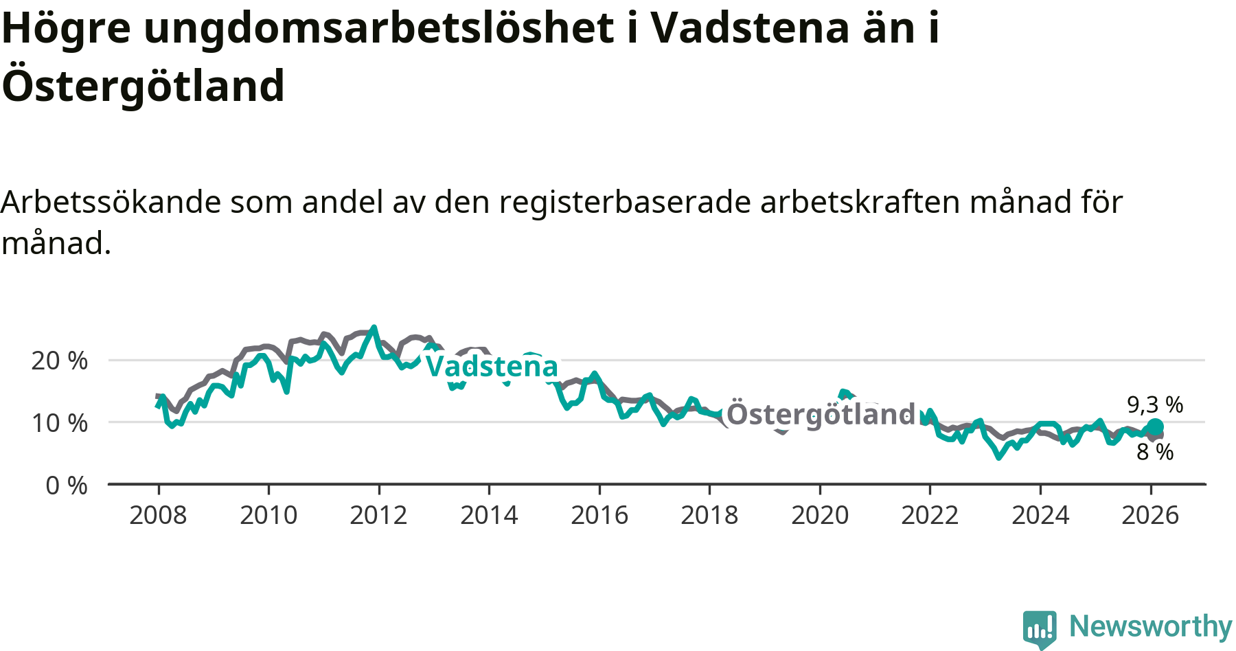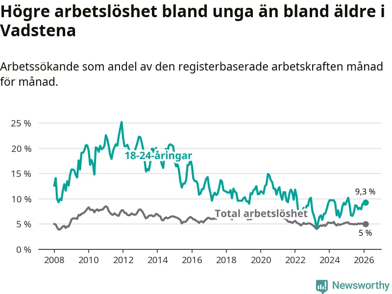 Medan Vadstena har lägre total arbetslöshet än Östergötland, ligger ungdomsarbetslösheten 1,3 procentenheter högre i Vadstena.