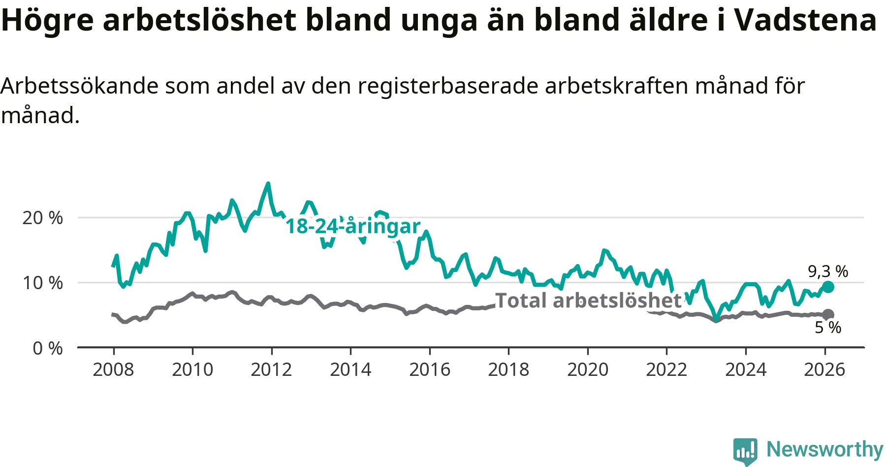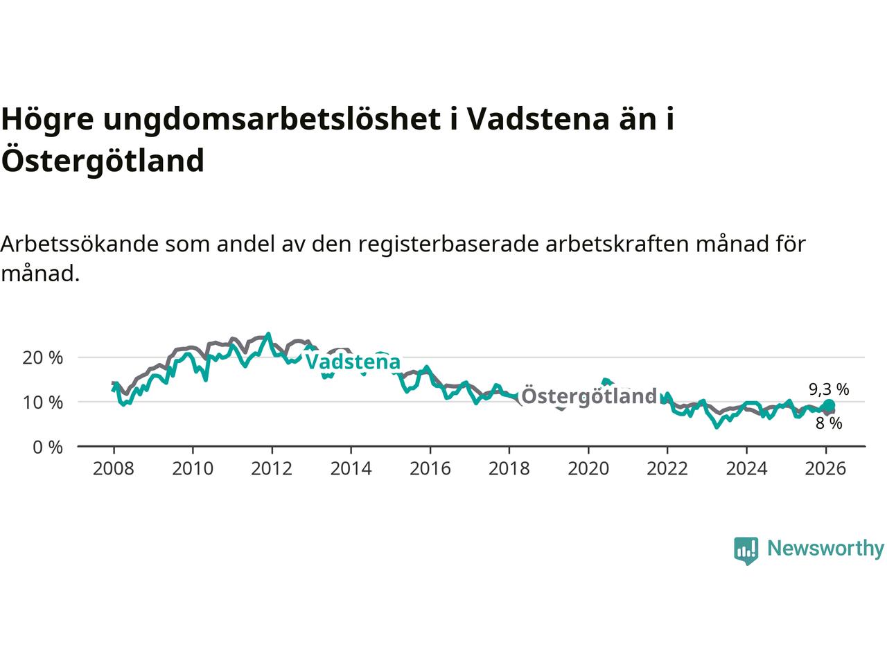 Graf: Arbetslöshet bland unga i Vadstena kommun och Östergötlands län
