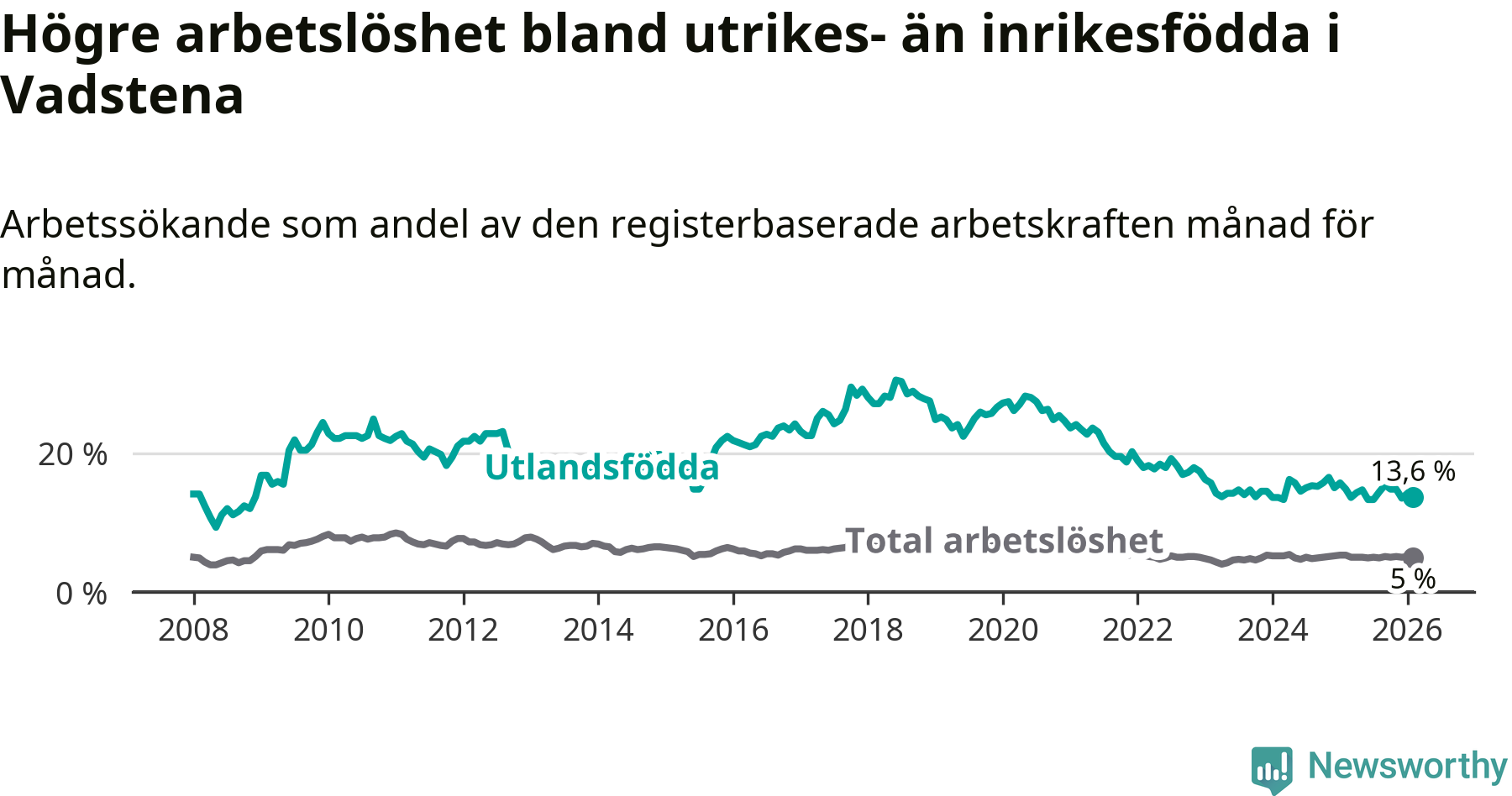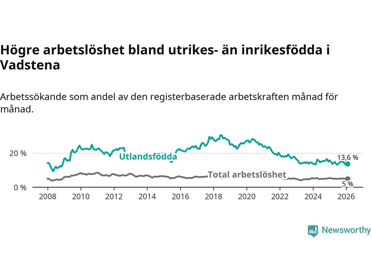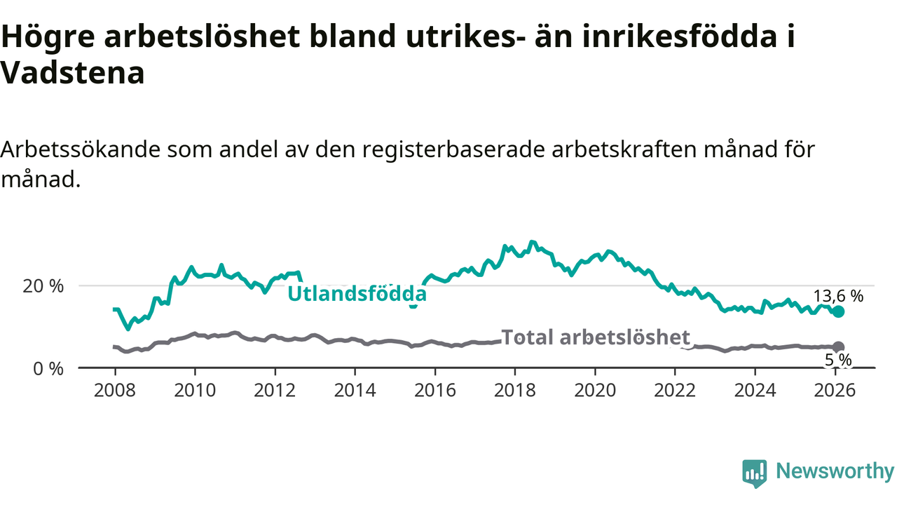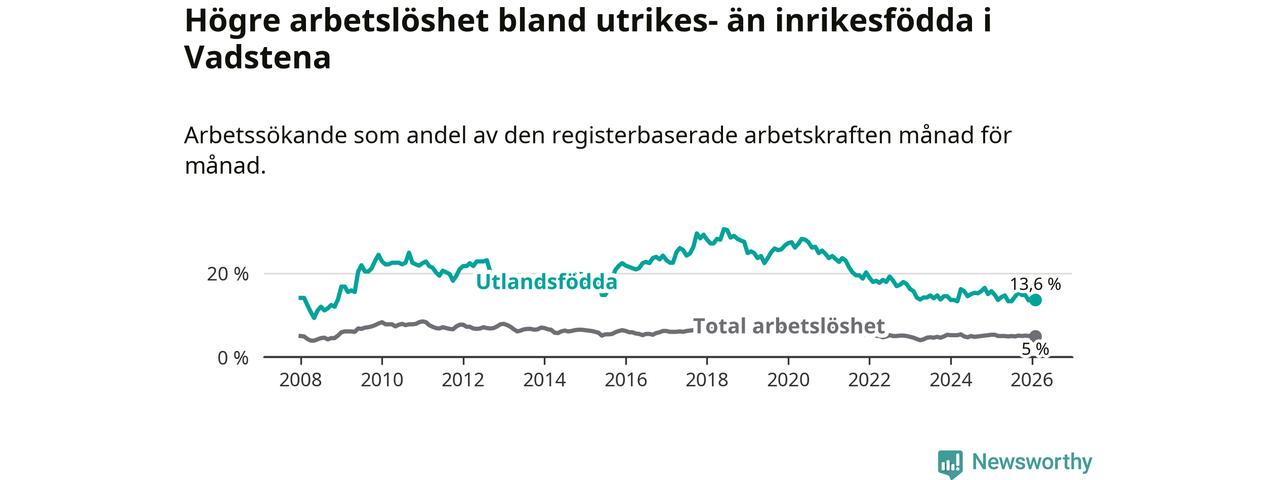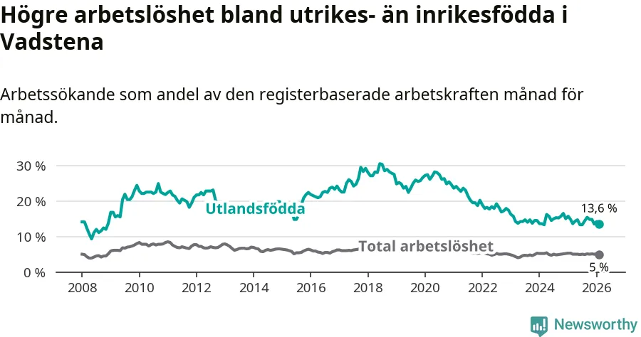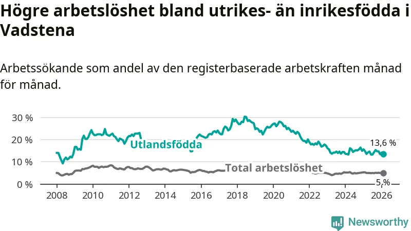 Skillnaden i arbetslöshet mellan utrikesfödda och hela befolkningen är 8,6 procentenheter i Vadstena. Det är en mindre skillnad än för ett år sedan (−0,9 procentenheter).