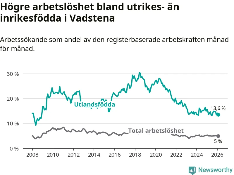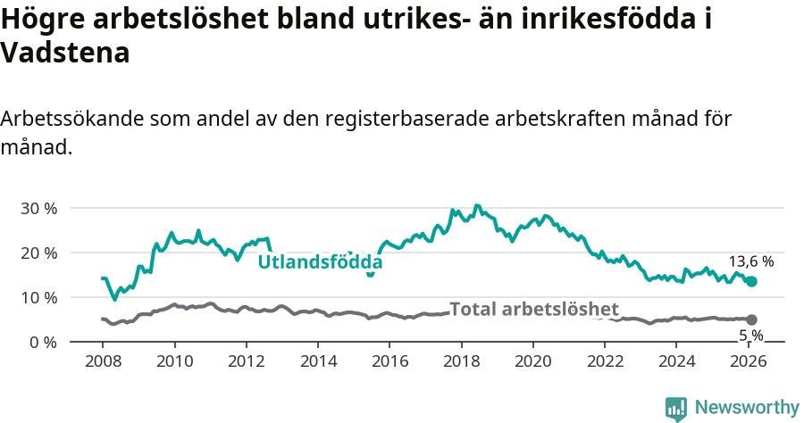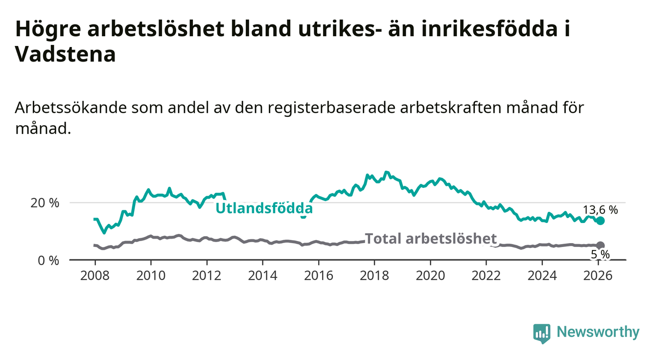 Arbetslösheten bland utlandsfödda var 13,6 procent i Vadstena under februari månad, motsvarande 51 av 375 personer. Det är 1,2 procentenheter färre än vid samma tidpunkt i fjol (−2 om man räknar personer).